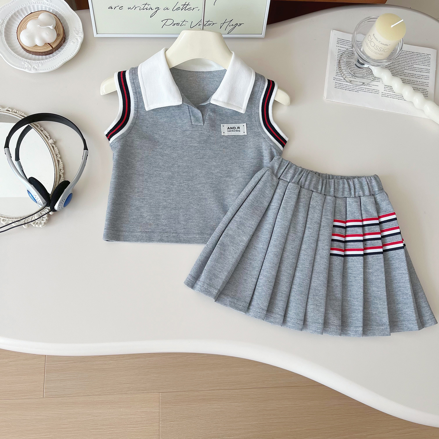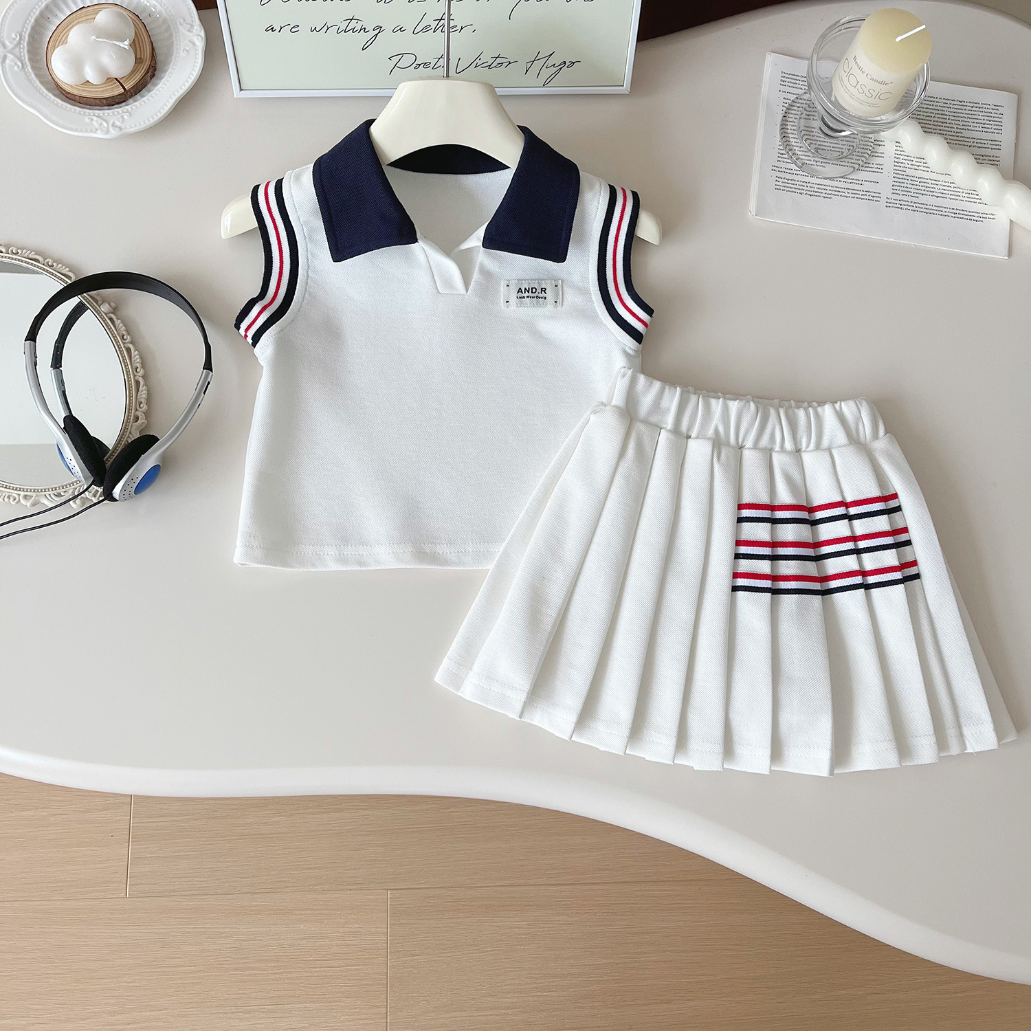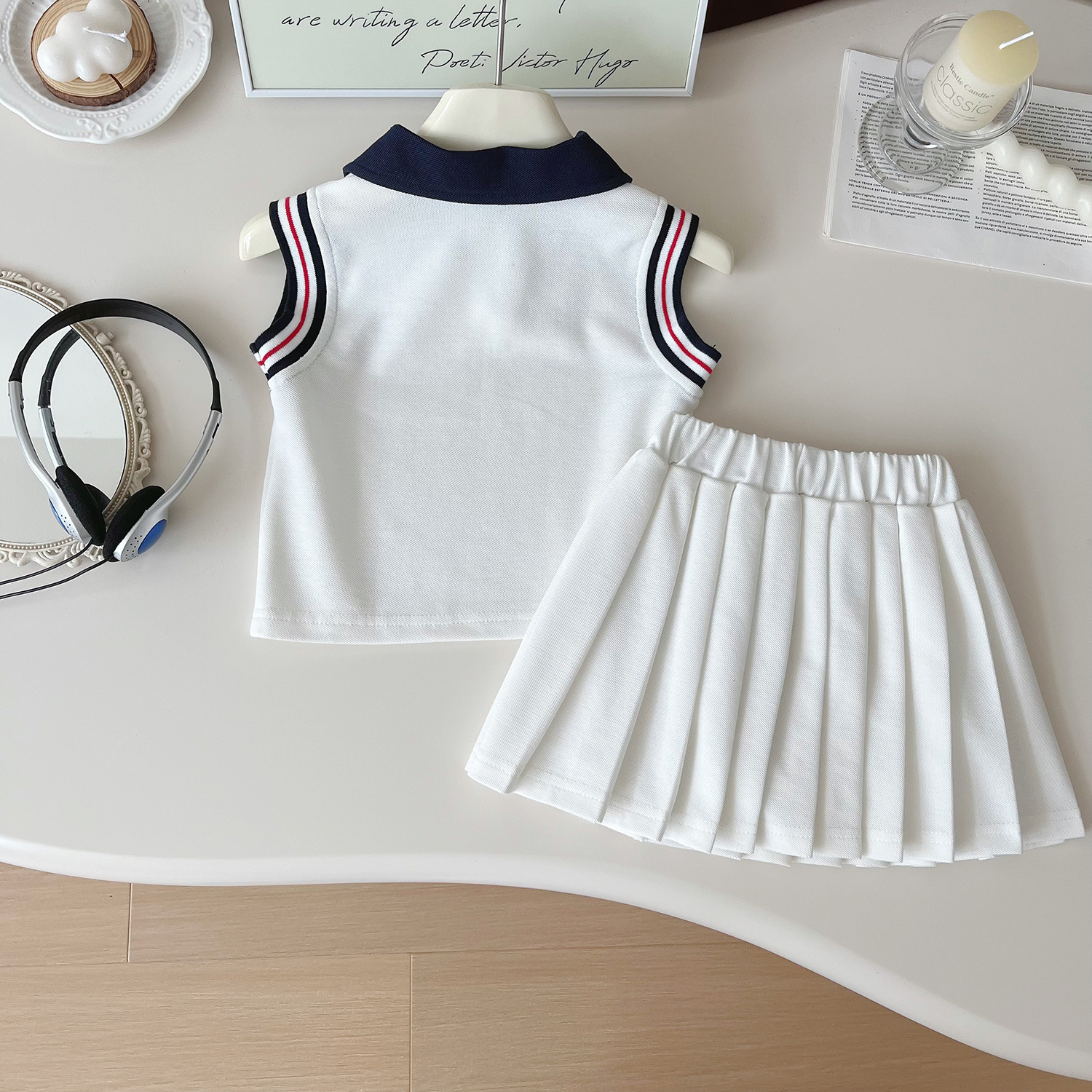 2024 년 여름 새로운 한국 스타일 소녀의 폴로 셔츠 짧은 치마 세트 소녀의 귀여운 민소매 투피스 24381