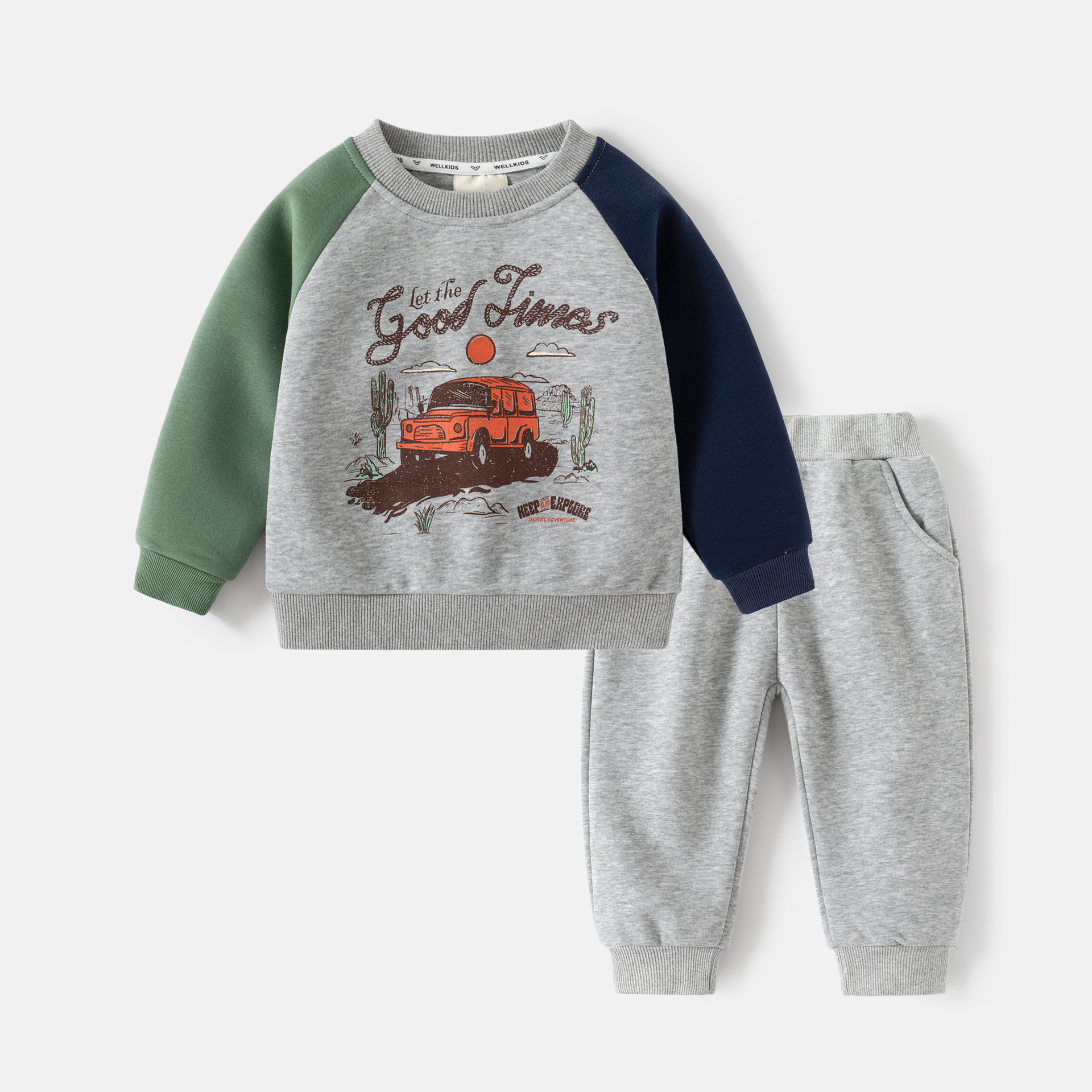 어린이 의류 2024 새로운 어린이 세트 소년 스웨터 스포츠 바지 아기 만화 풀오버 투피스 세트 머리카락