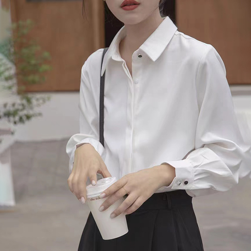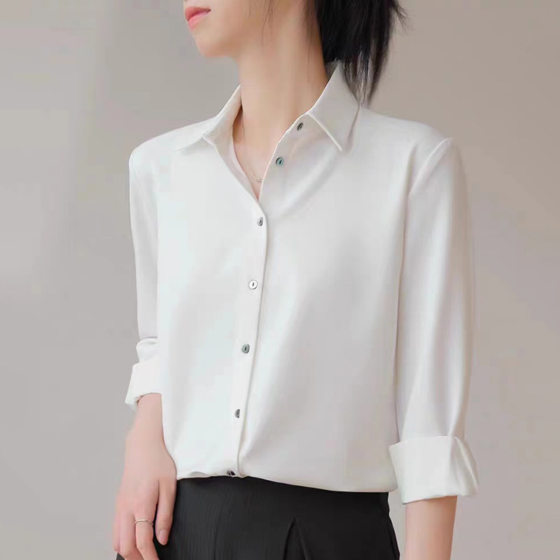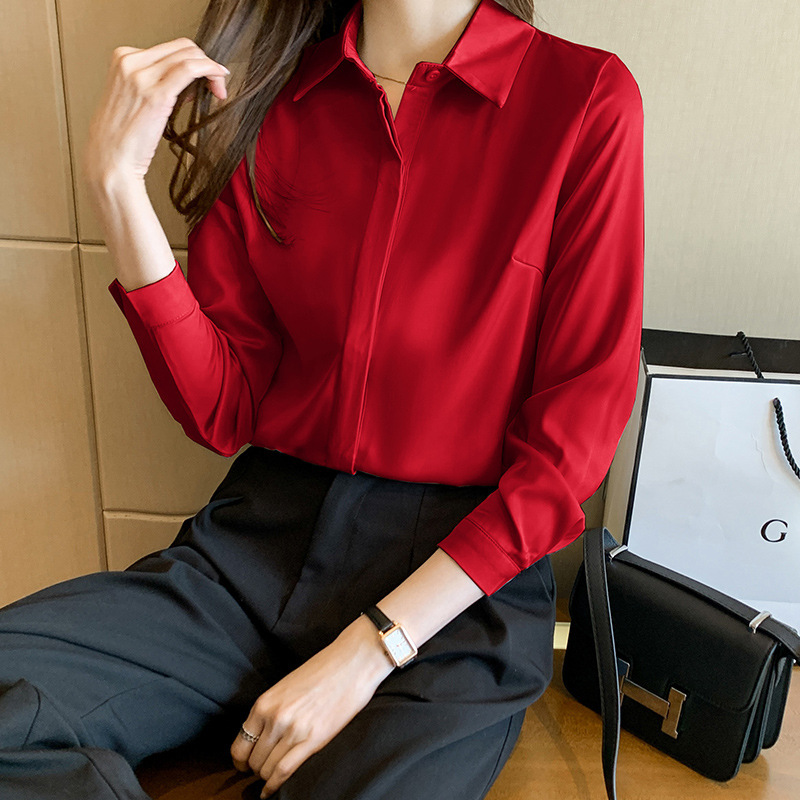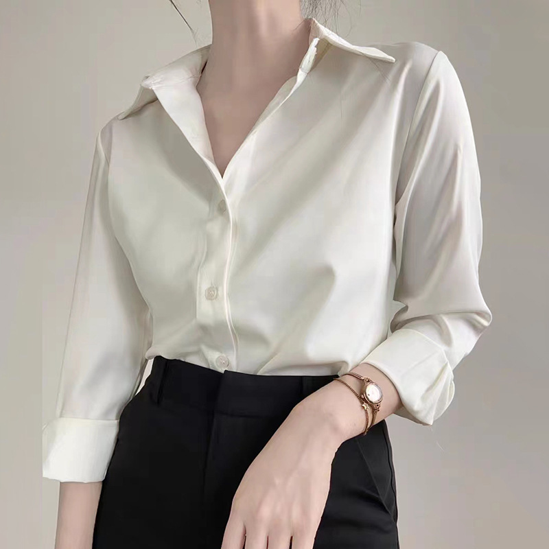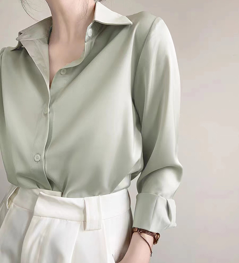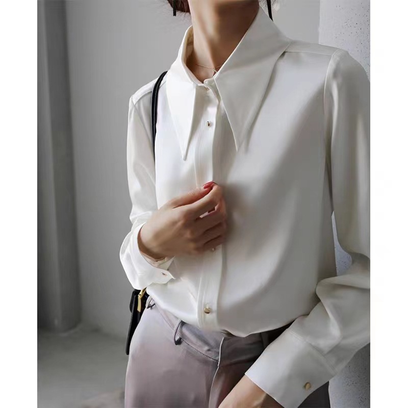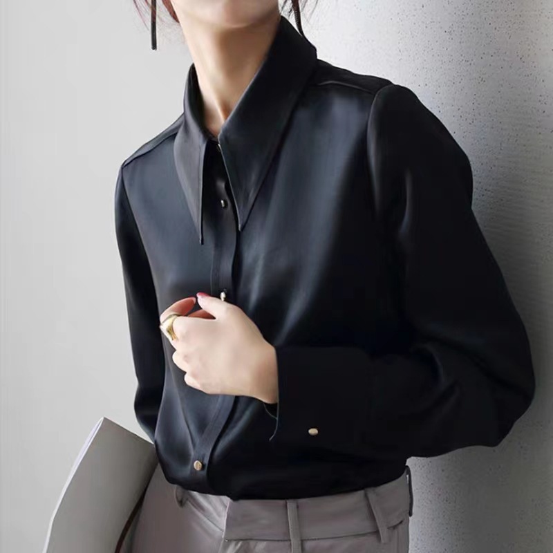 그레이 블루 새틴 셔츠 여성의 2024 긴 소매 가을 올 매치 다크 플래켓 레트로 홍콩 스타일 딥 통근 라이트 커처 셔츠