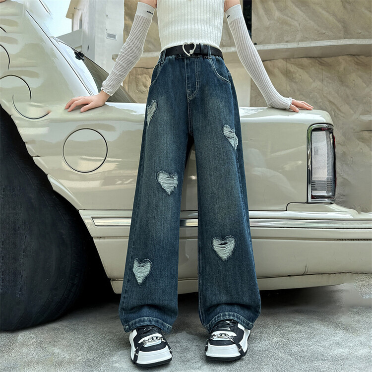 소녀의 봄과 가을 바지 2024 새로운 한국 스타일 중대형 어린이 찢어진 사랑 넓은 다리 바지 스트레이트 다리 청바지 바지스토어 가기