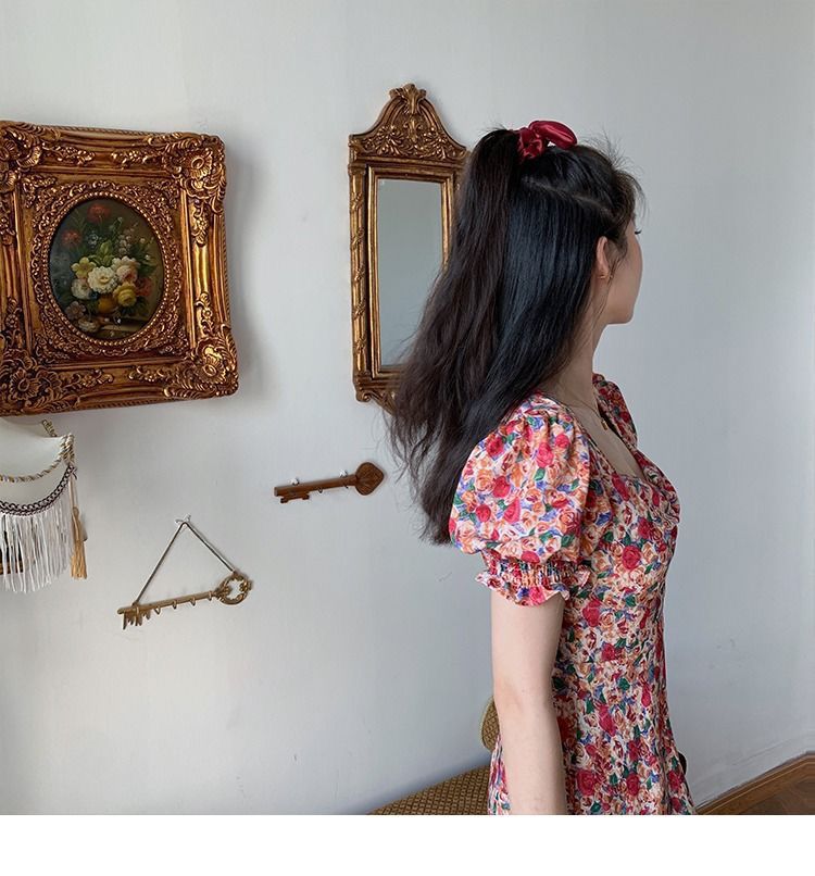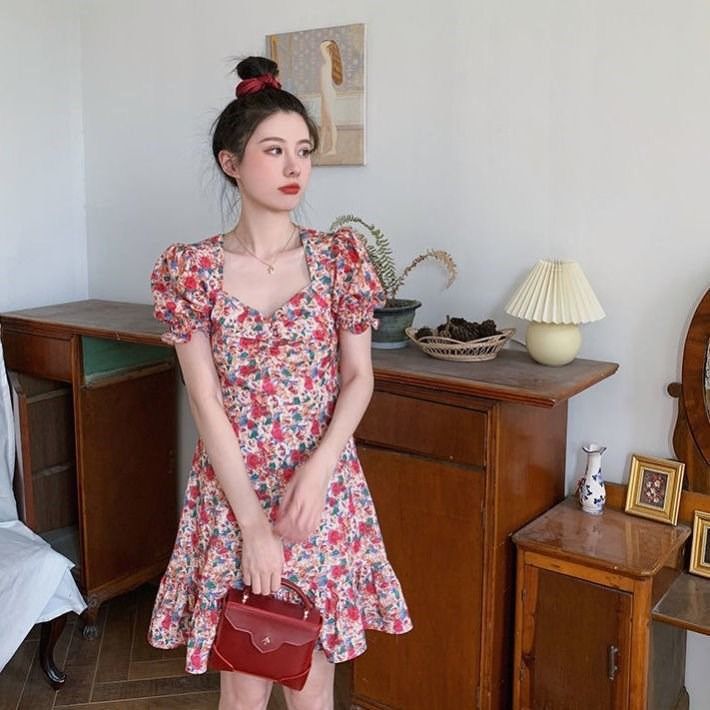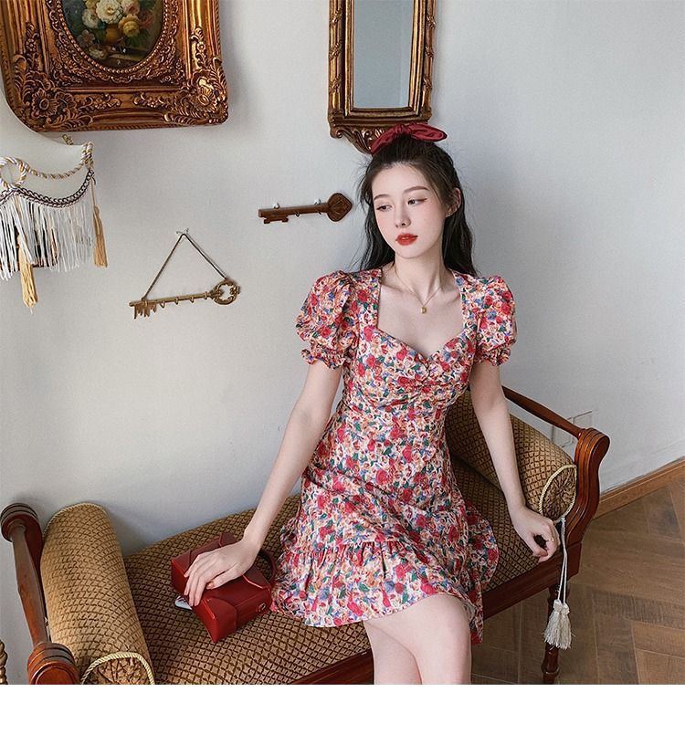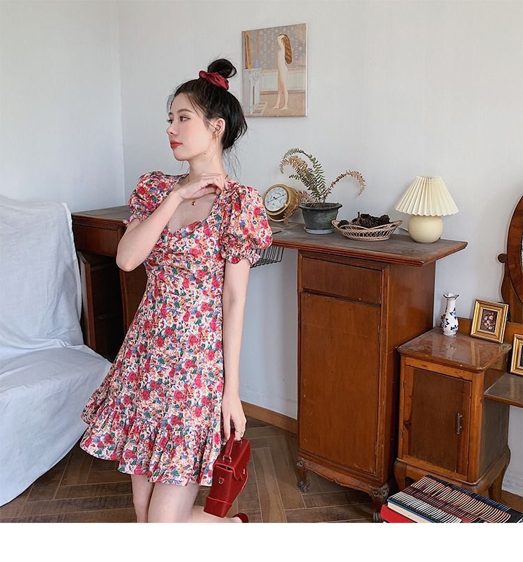 2025 신상 프렌치 스퀘어넥 플로럴 젊어보이는 달콤한 원피스 여성용 퍼프 소매 허리 슬림핏 첫사랑 요정 드레스스토어 가기