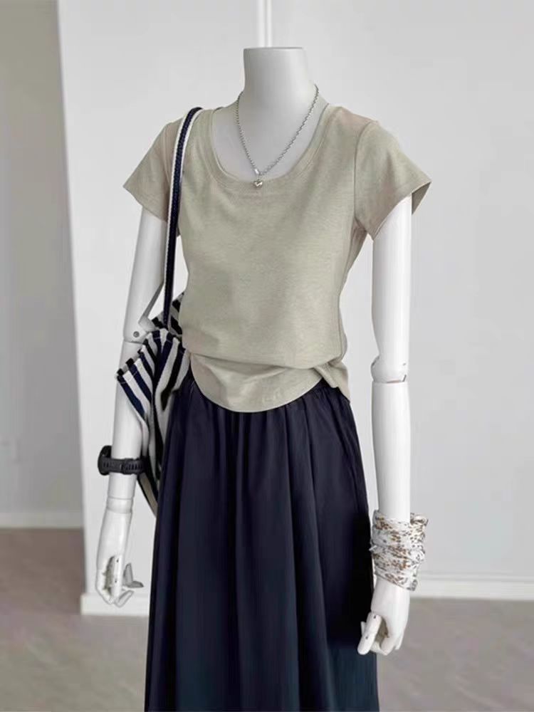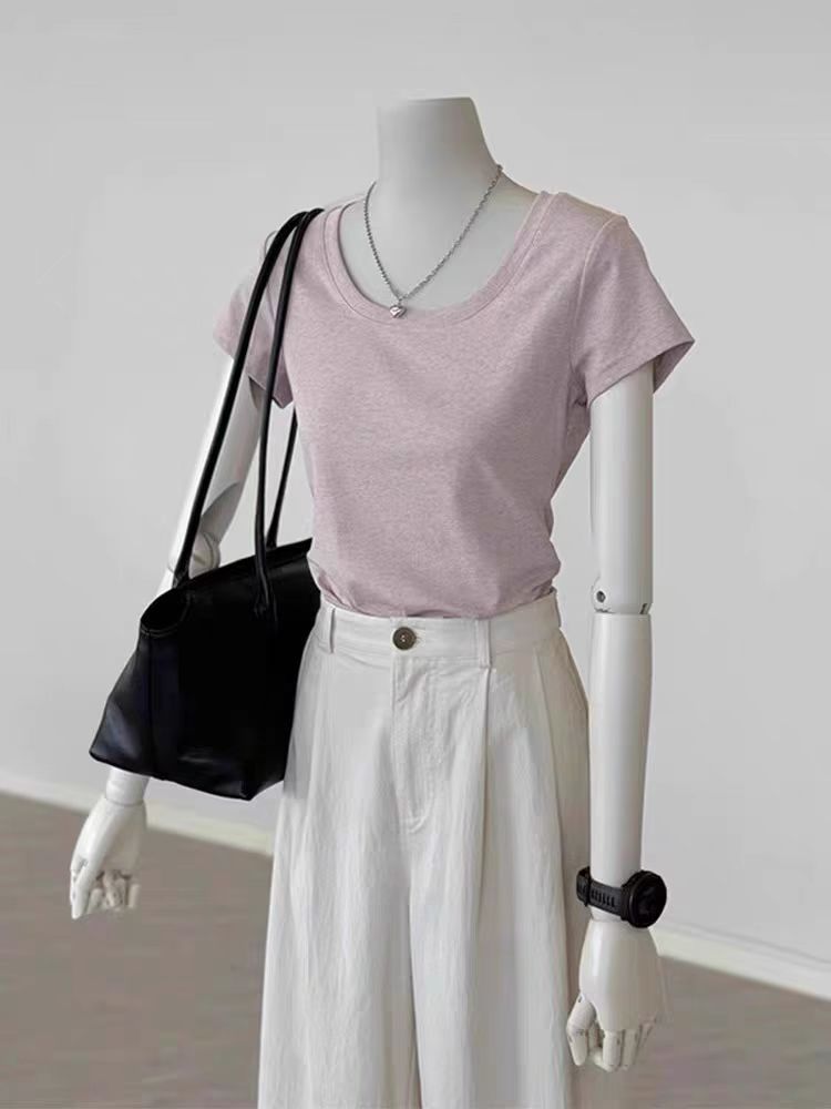 아이스 베리 파우더 U-숄더 칼라 슬림 핏 반팔 티셔츠 여성용 여름 디자인 센스 틈새 빅 코 슬리밍 티셔츠 탑