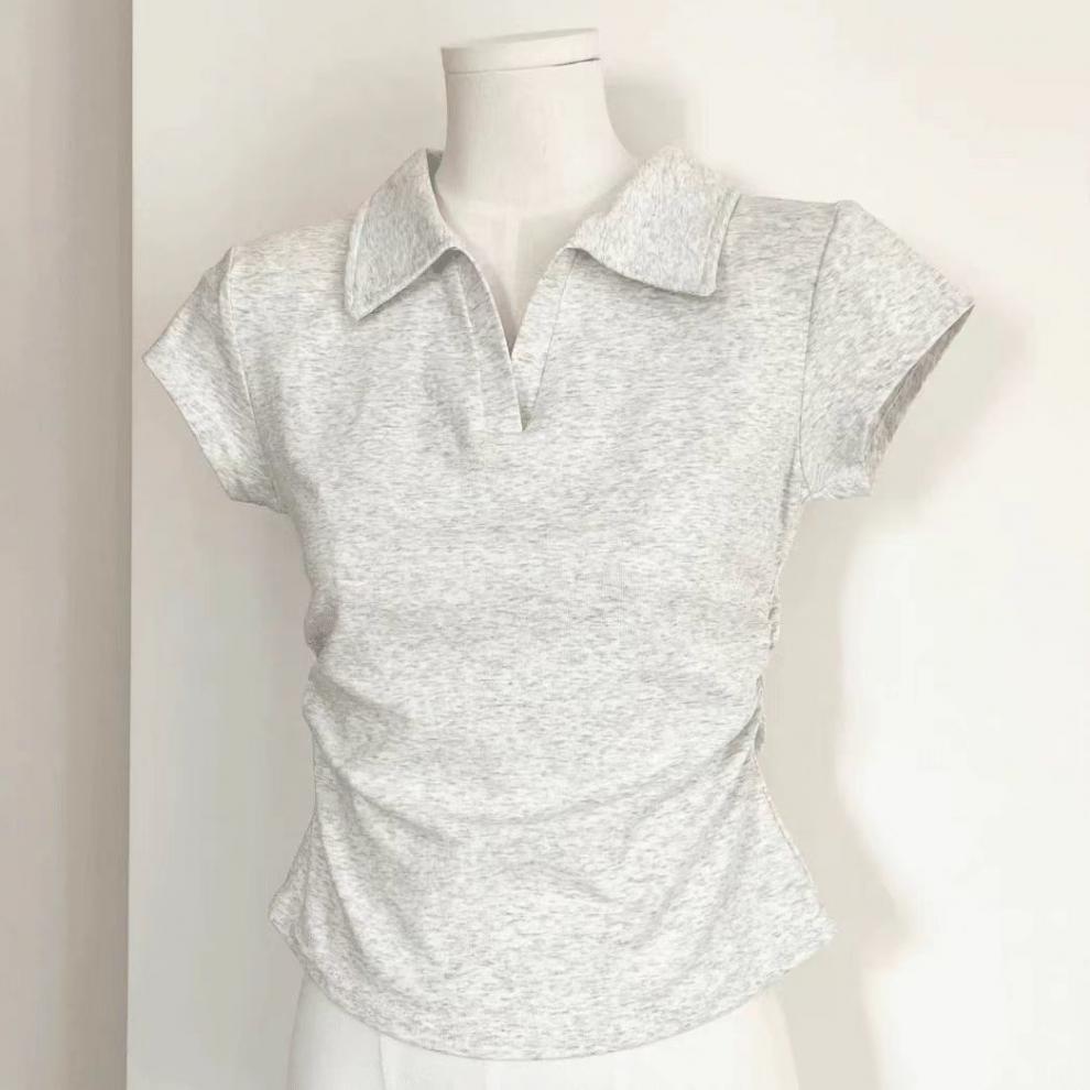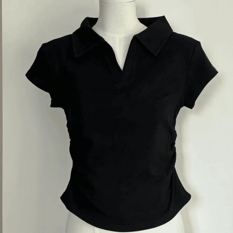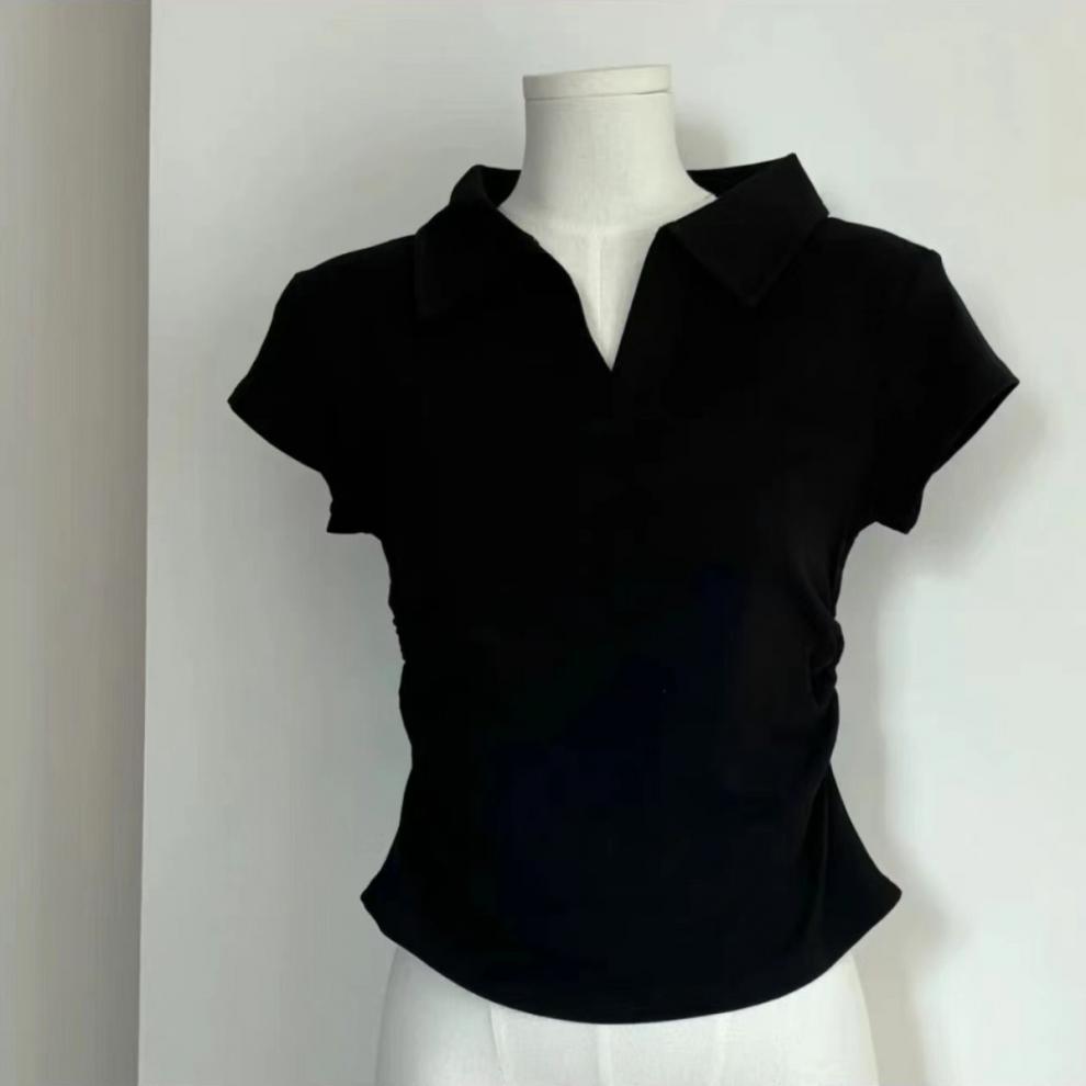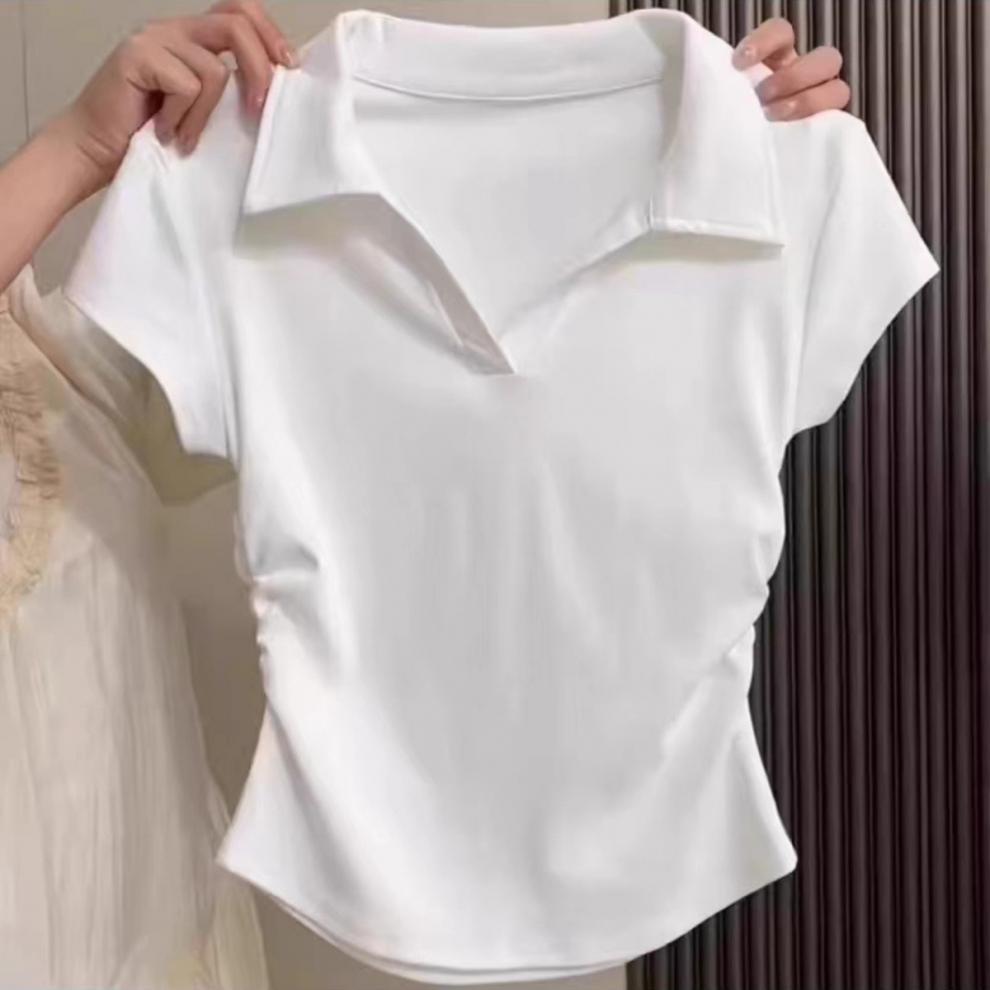 여름 스파이스 걸스 슬림 핏 슬리밍 숄더 티셔츠 여성용 반팔 디자인 센스 불규칙한 주름 짧은 폴로 셔츠 탑