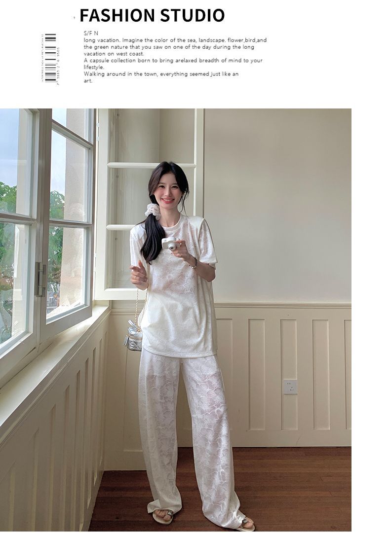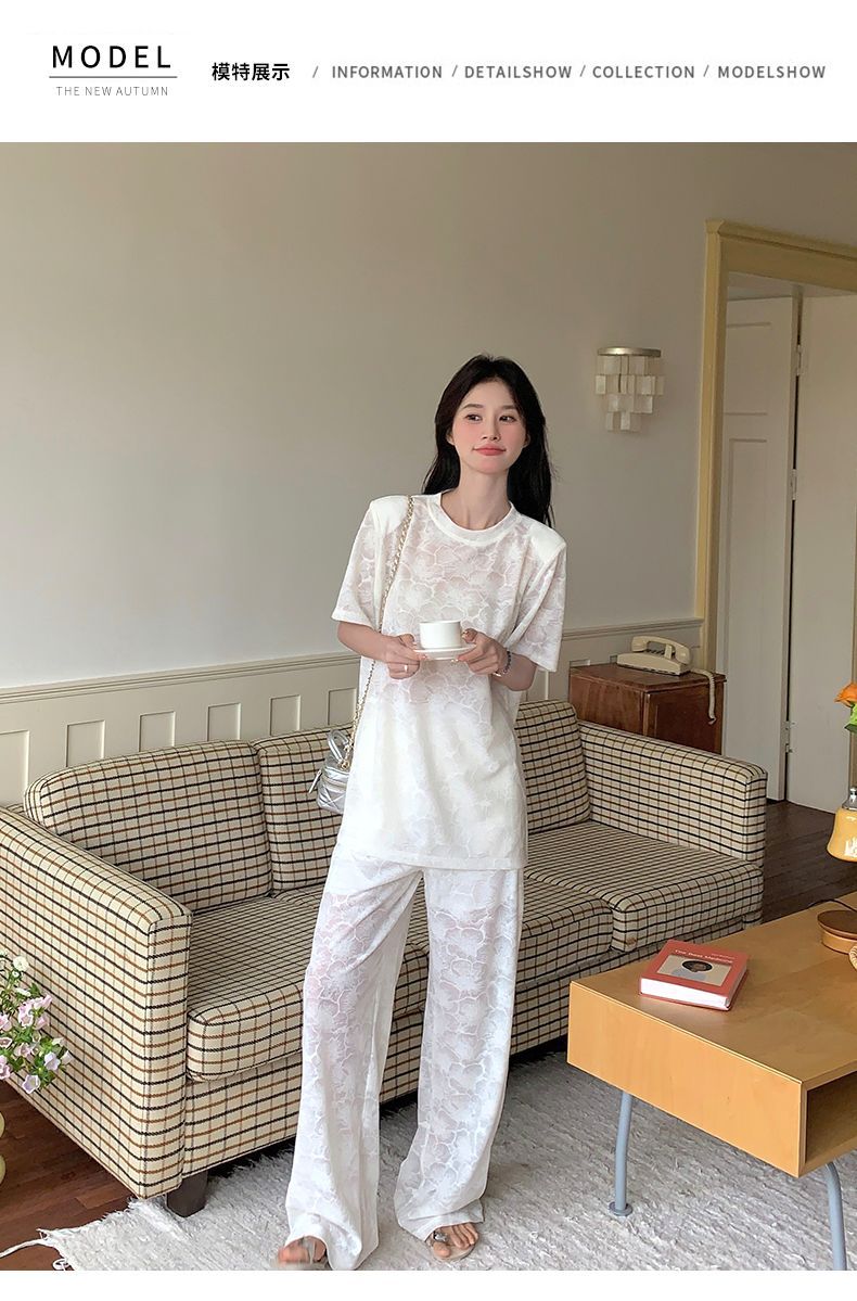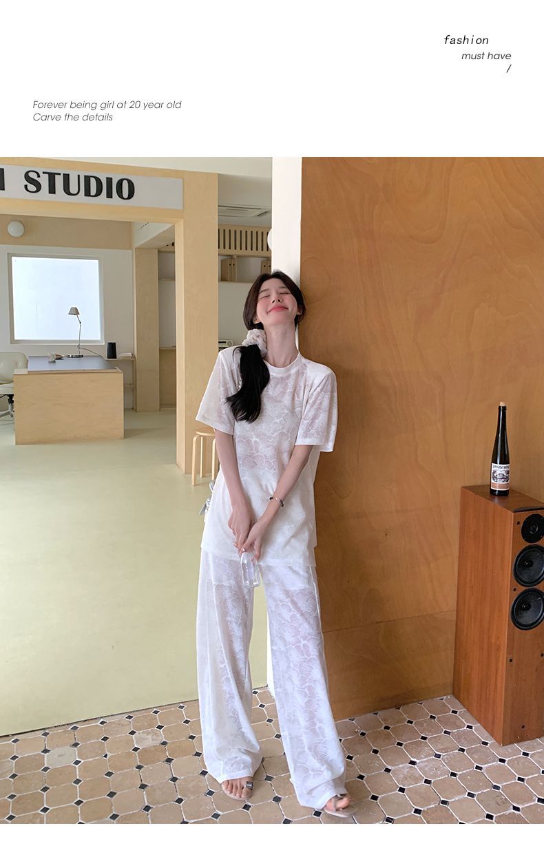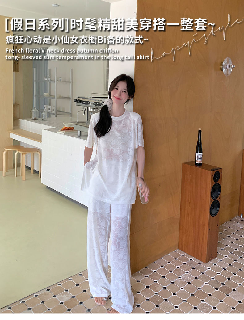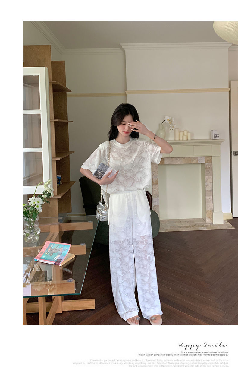 올해 인기있는 작은 스타일 레이스 세트 바지 여성 여름 2024 새로운 편안한 넓은 다리 바지 투피스 세트스토어 가기