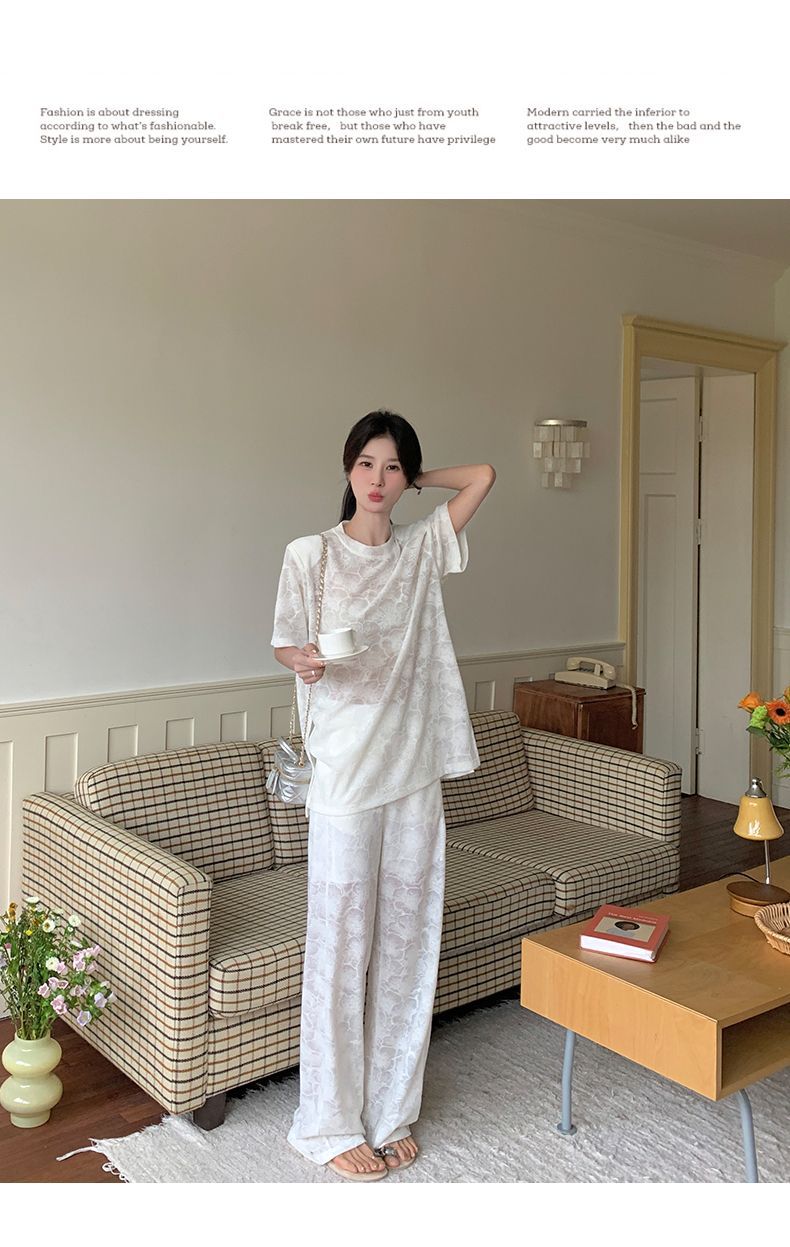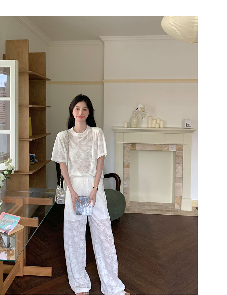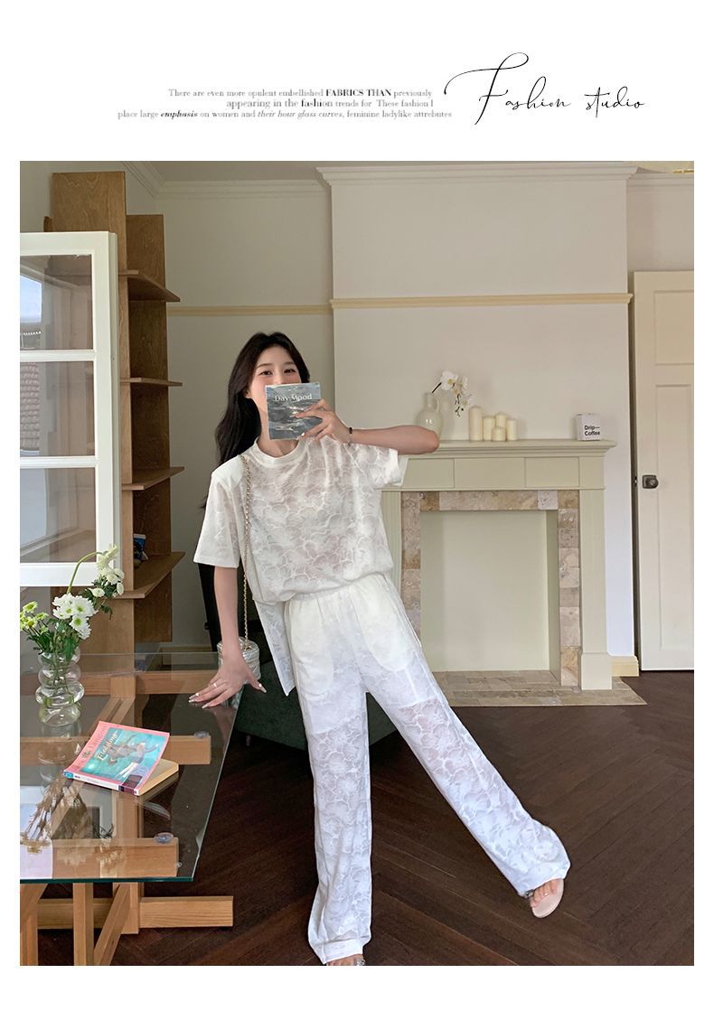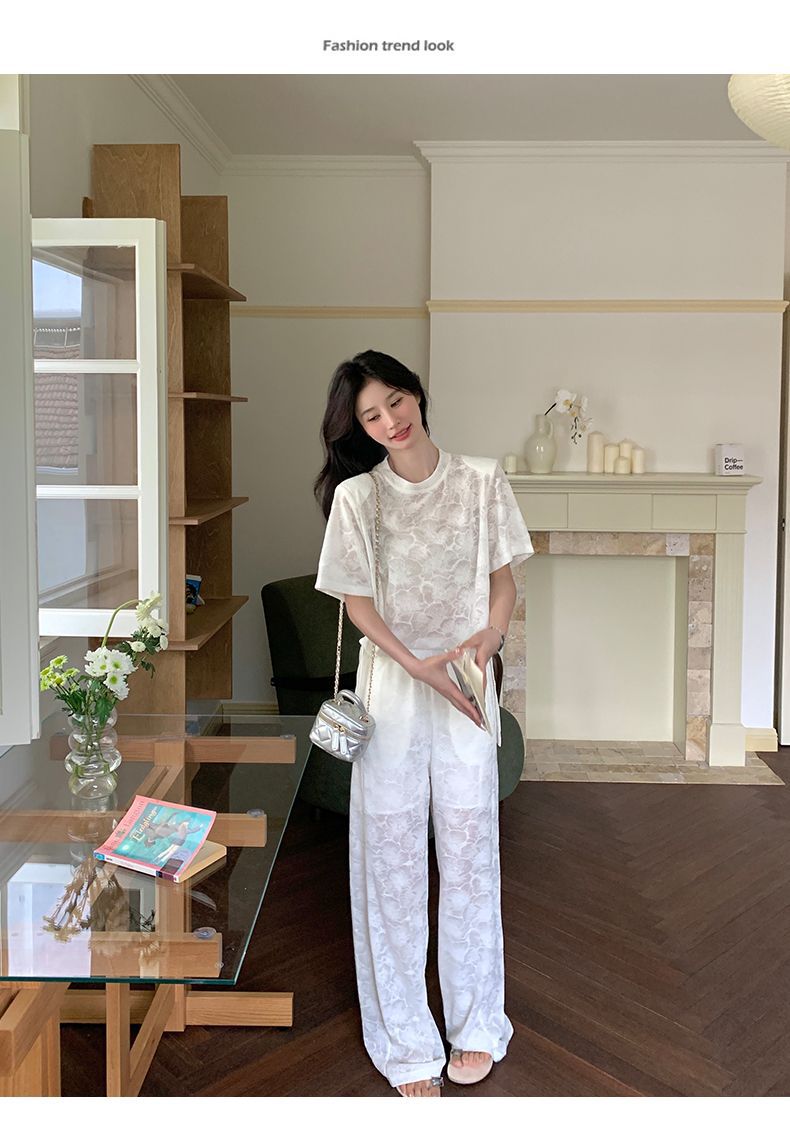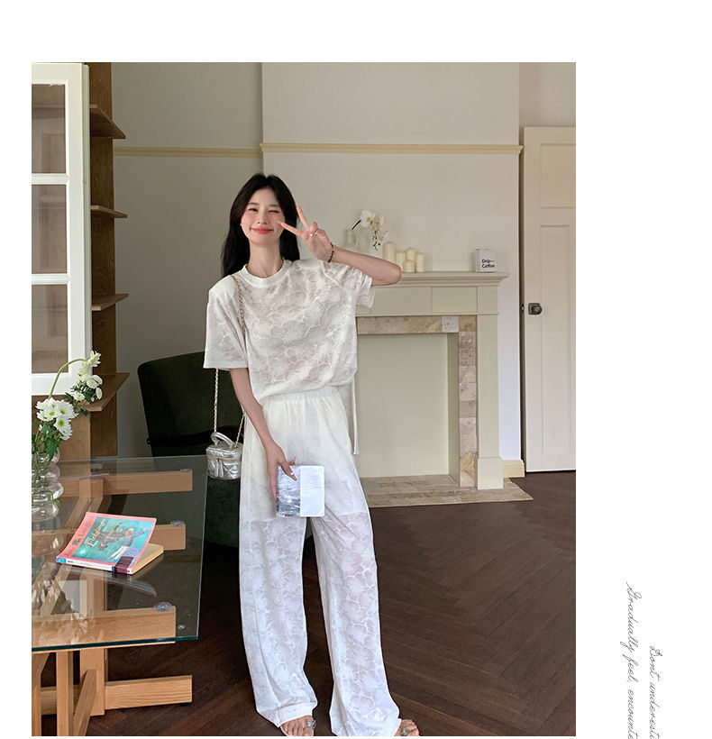 올해 인기있는 작은 스타일 레이스 세트 바지 여성 여름 2024 새로운 편안한 넓은 다리 바지 투피스 세트스토어 가기