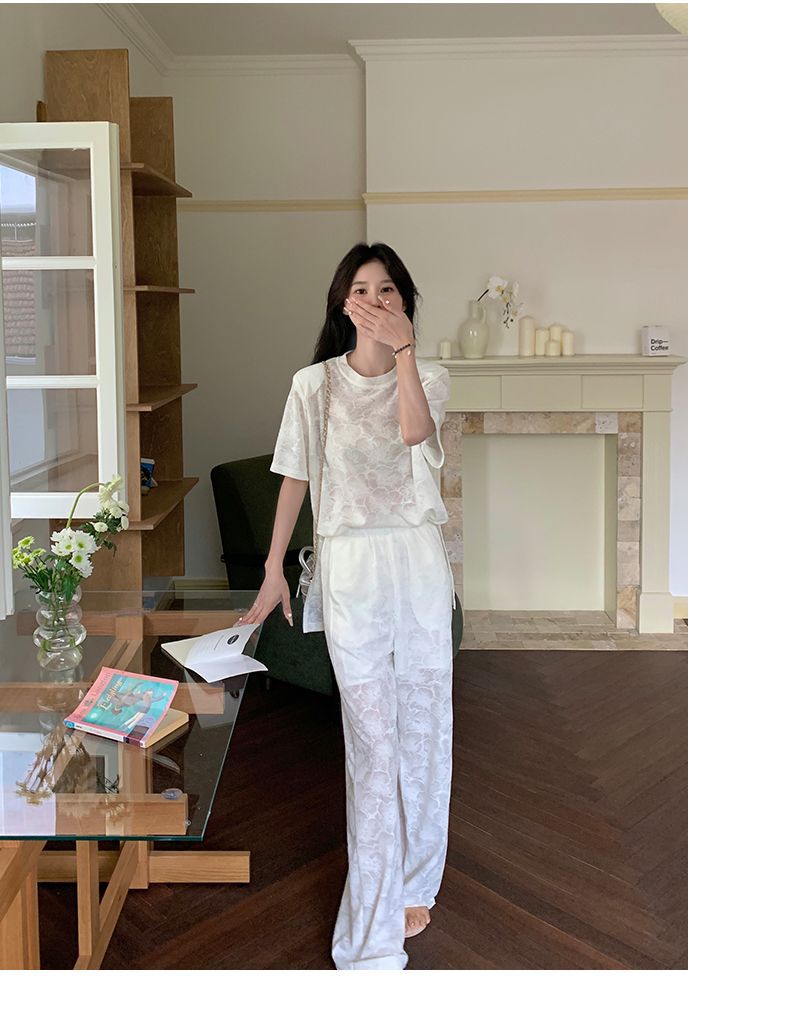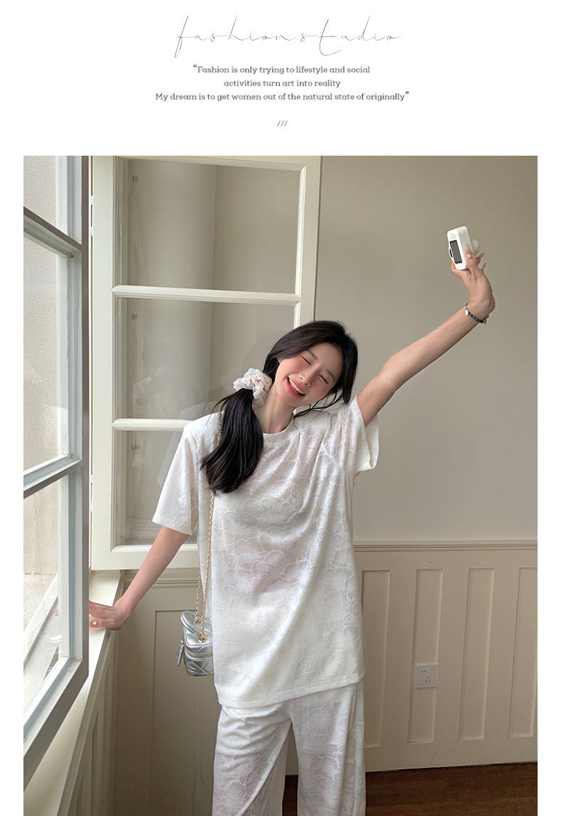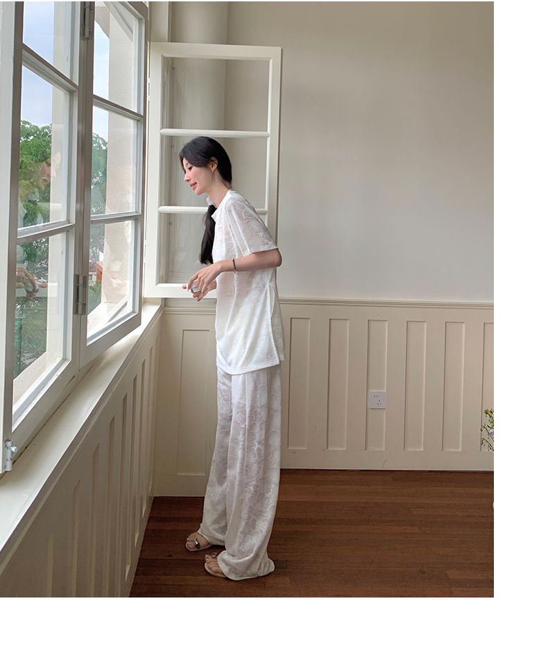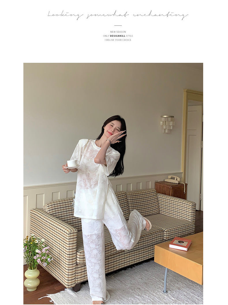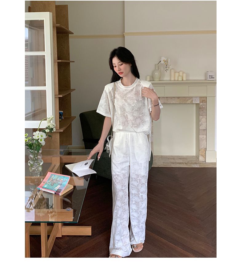 올해 인기있는 작은 스타일 레이스 세트 바지 여성 여름 2024 새로운 편안한 넓은 다리 바지 투피스 세트스토어 가기