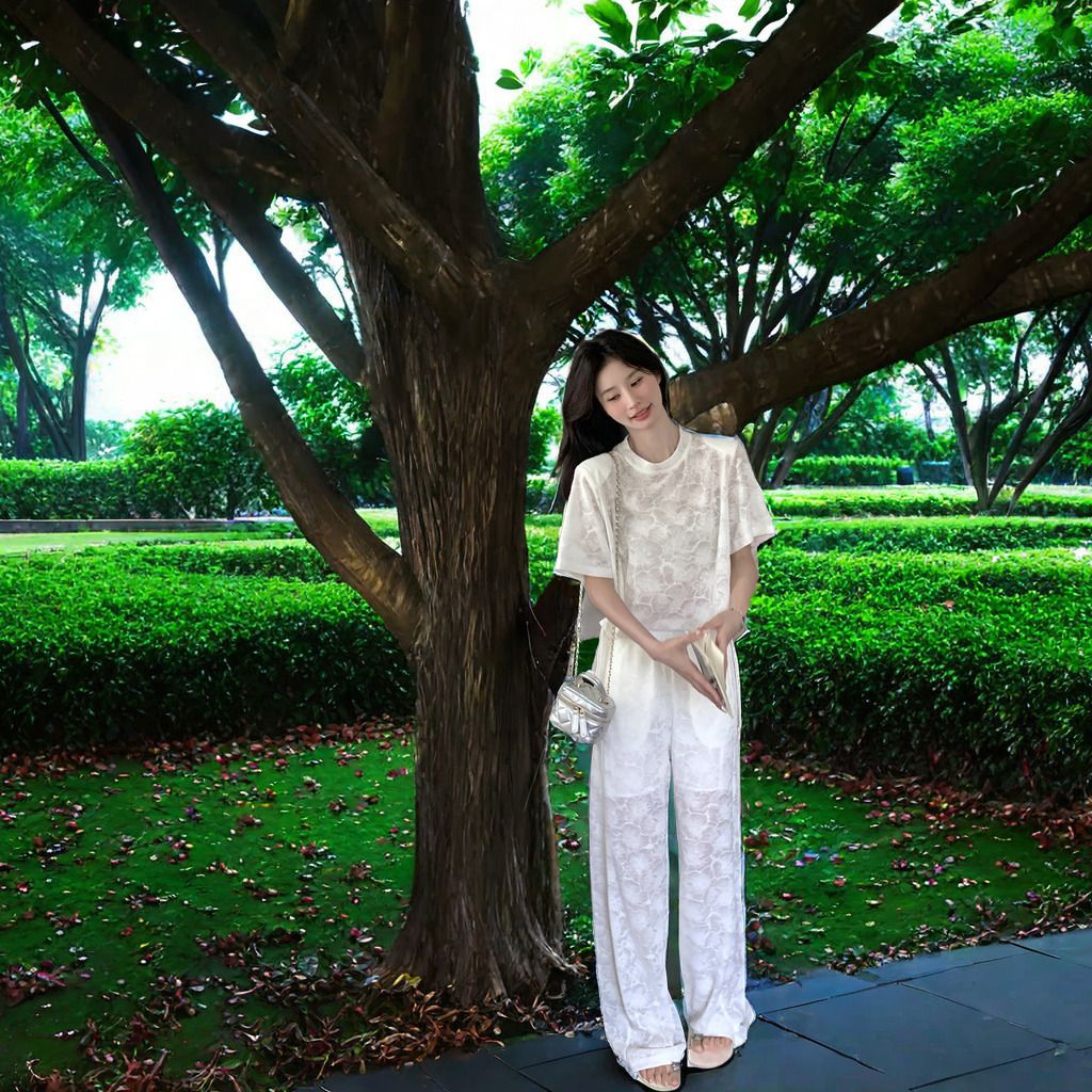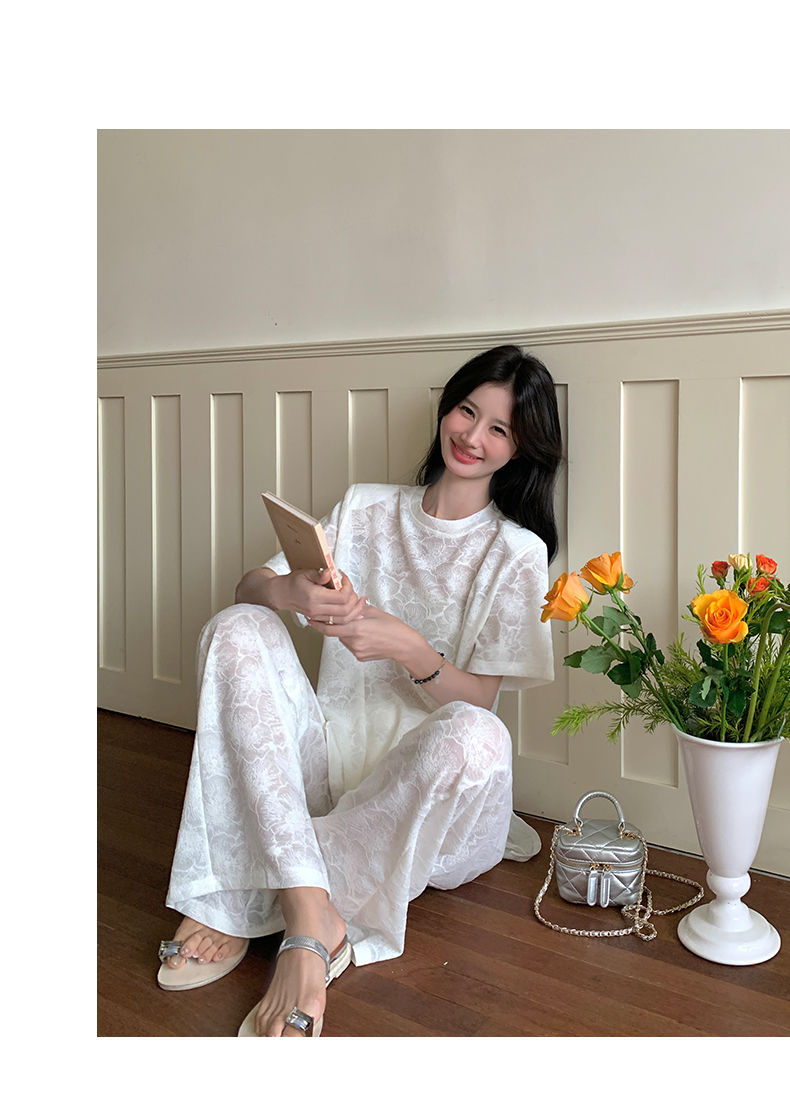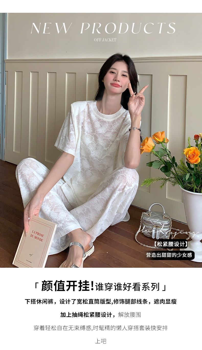 올해 인기있는 작은 스타일 레이스 세트 바지 여성 여름 2024 새로운 편안한 넓은 다리 바지 투피스 세트