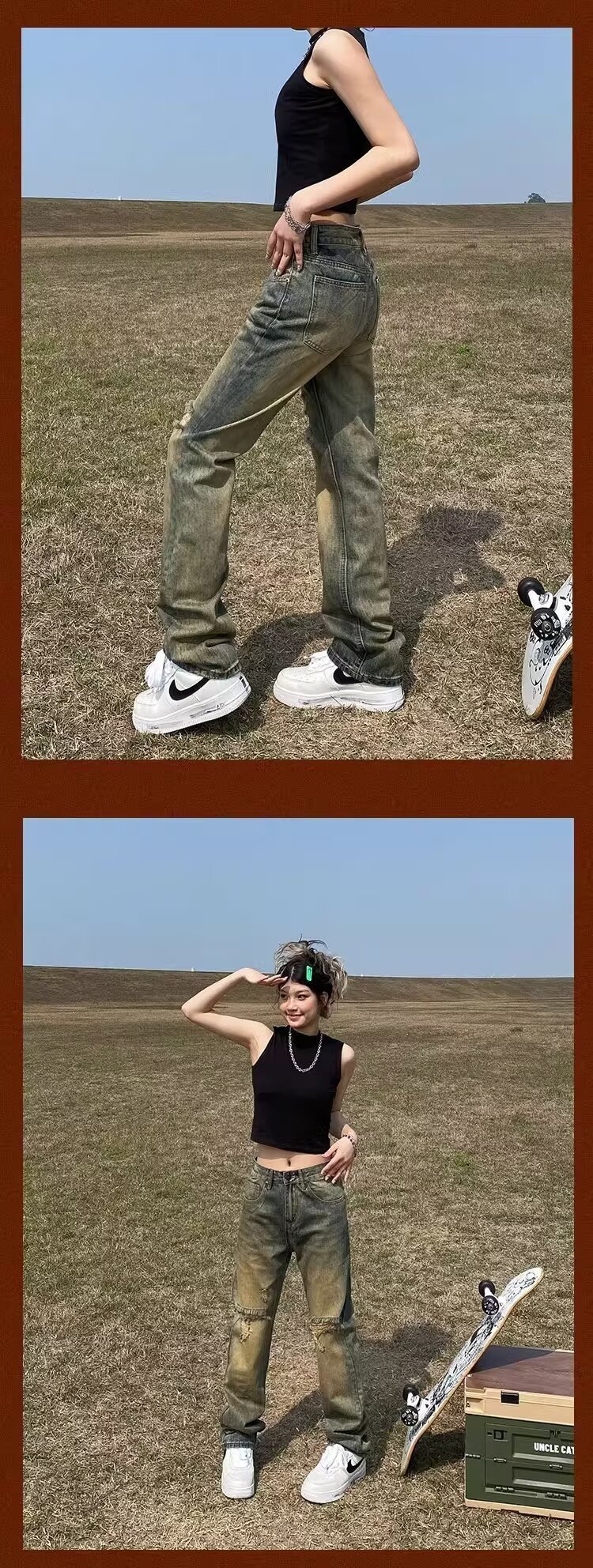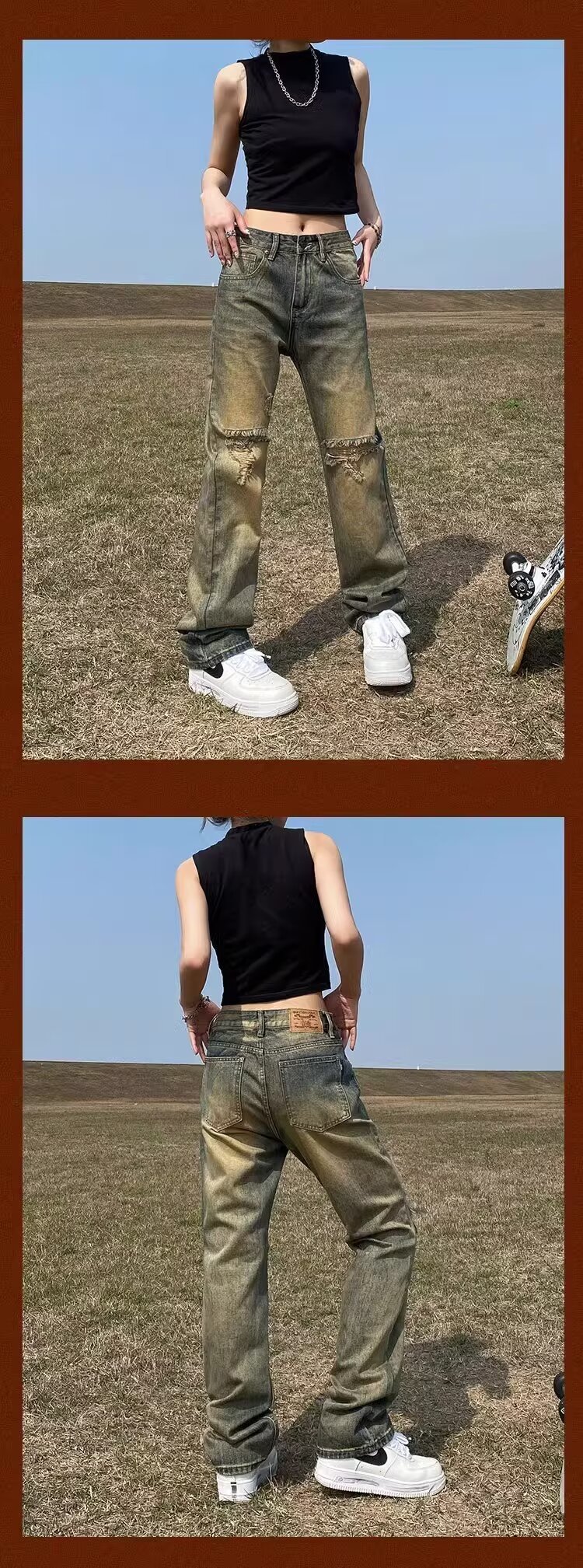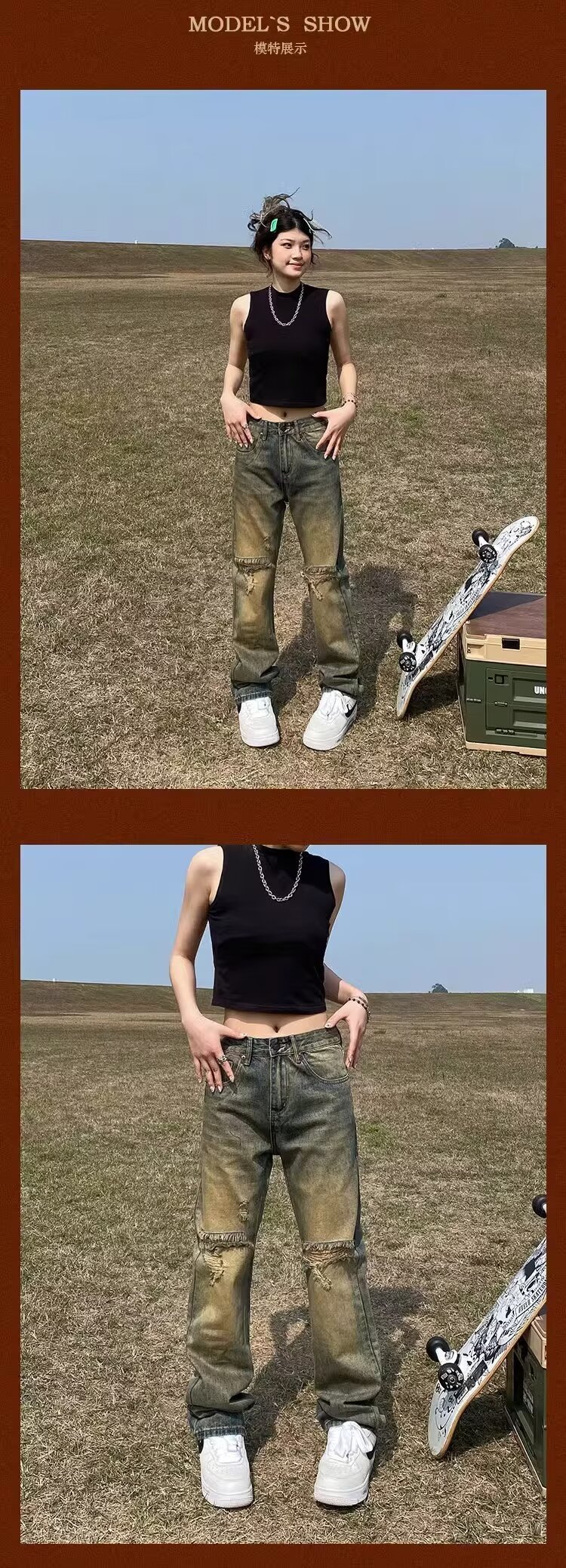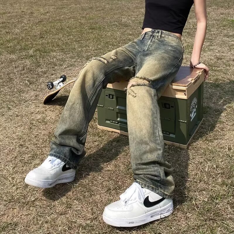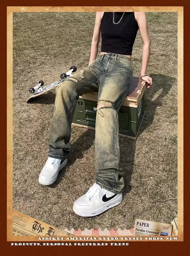 홍콩 스타일 트렌디 한 남성 여름 새로운 2024 맞춤형 알파벳 청바지 힙합 Ins 트렌디 하이 스트리트 트렌디 한 바지
