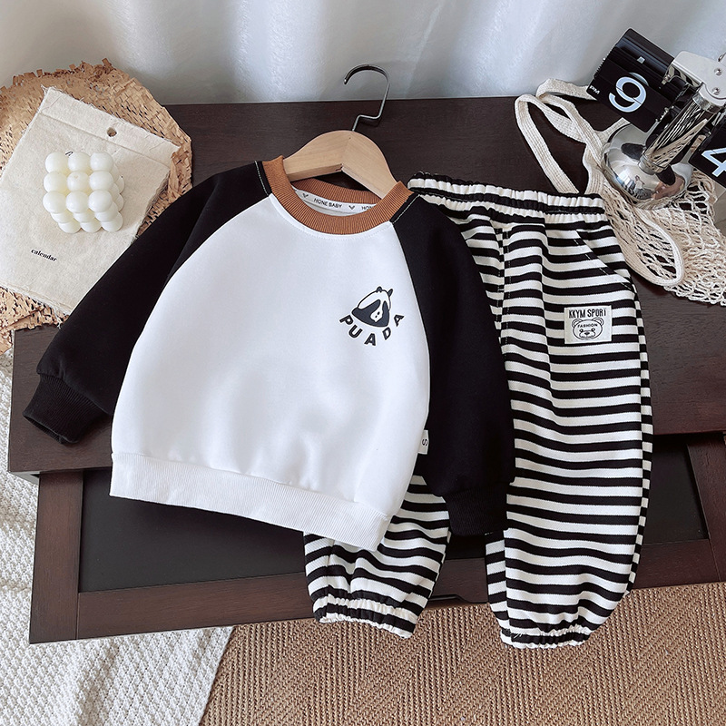 2024 뉴 보이즈 가을 세트 캐주얼 어린이 봄과 가을 팬더 크루 넥 스웨트 스트라이프 바지 2 피스 세트