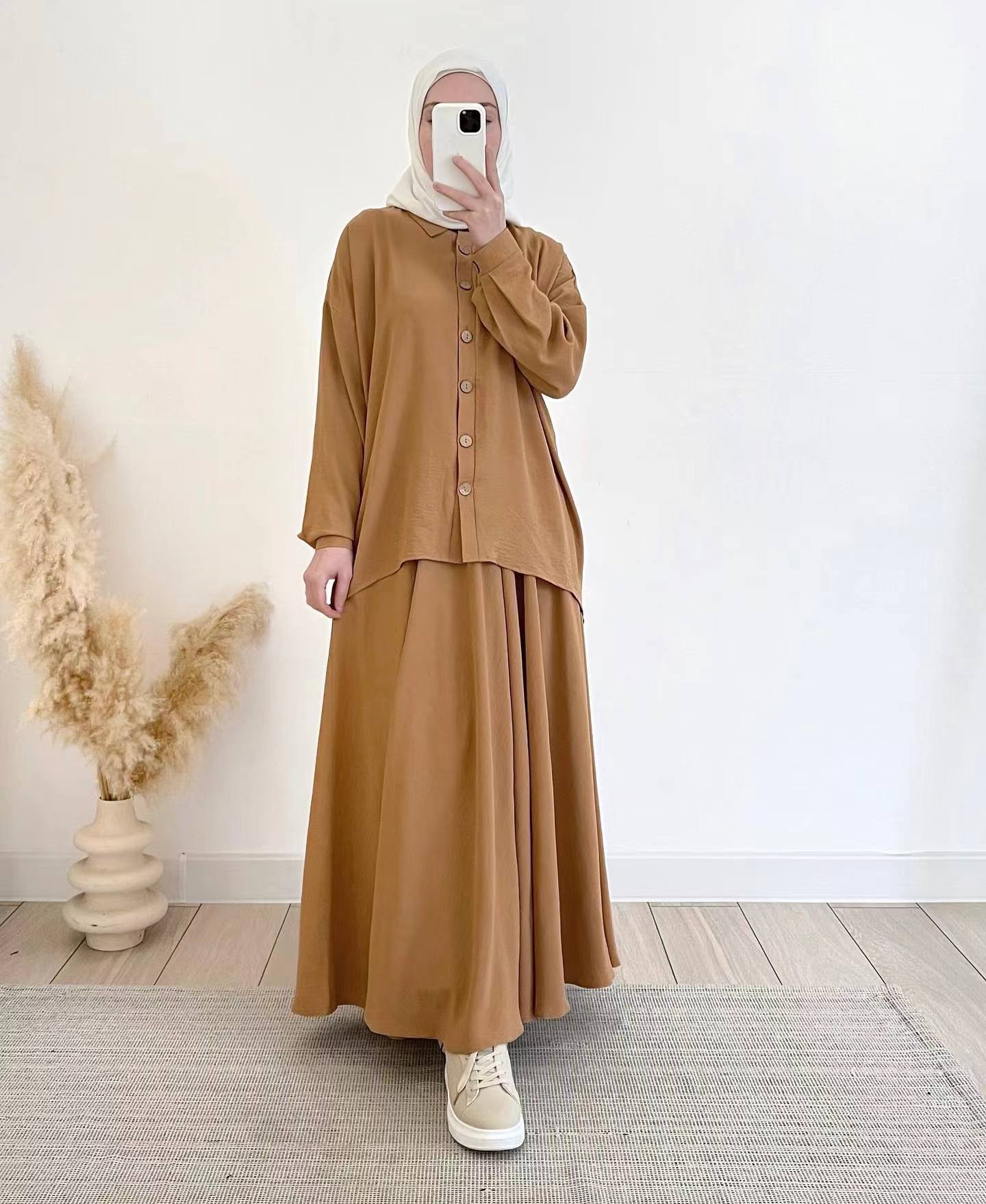 2024 봄 해외 무역 여성 무슬림 의류 세트, 루즈핏 긴팔 셔츠와 스커트, 편안한 출퇴근 스타일스토어 가기