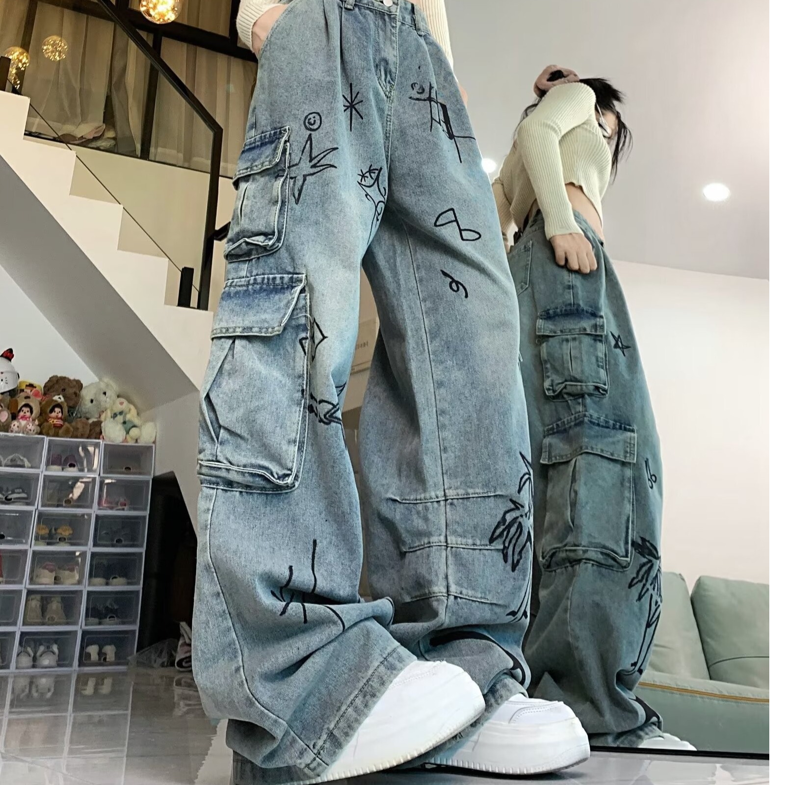 2024 중공업 디자인 센스 고양이 뜨거운 시추 인쇄 청바지 여성용 높은 허리 슬리밍 스트레이트 올 매치 와이드 레그 트렌디 플로어 트렌디 한 바닥 트렌디 한 바지스토어 가기