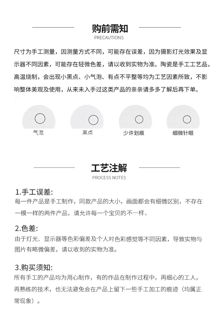 2、陶瓷产品易碎,我们建议打木箱,每个木箱20元,在打木箱的情况下破损,我们补发破损。