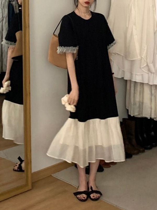 여름 얇은 검은 색 반팔 티셔츠 원피스 여성의 2024 스티칭 디자인 피쉬 테일 롱 스커트스토어 가기