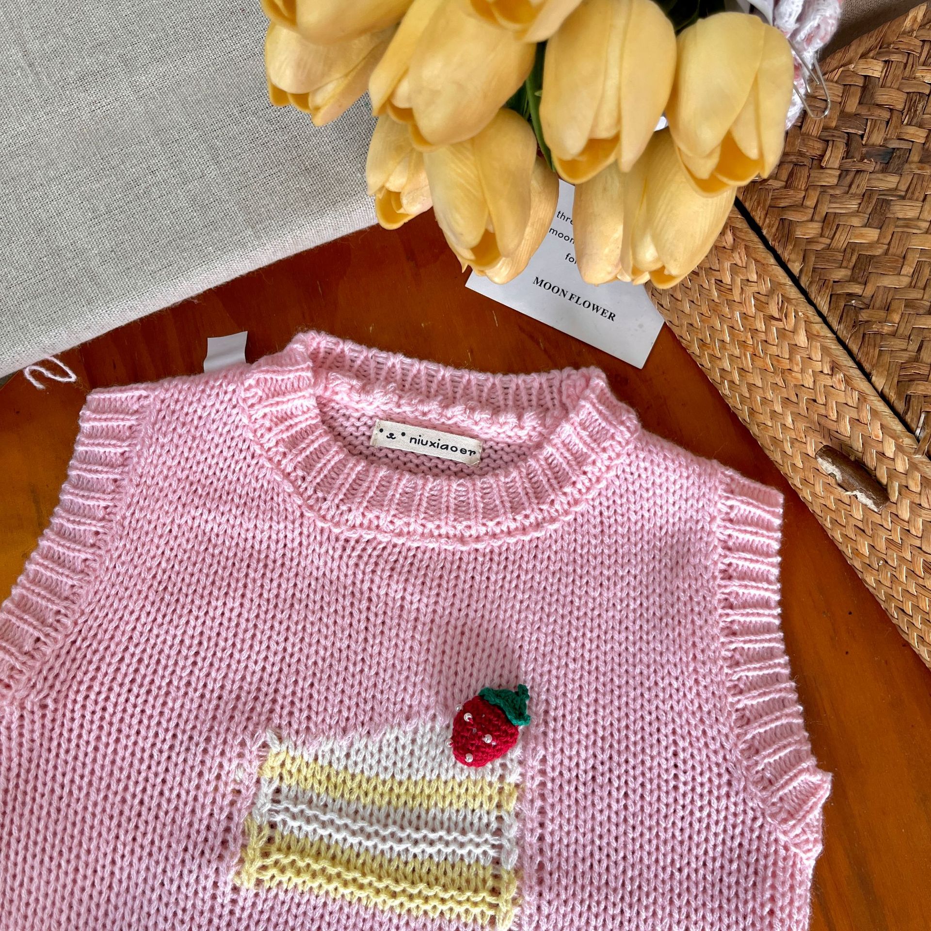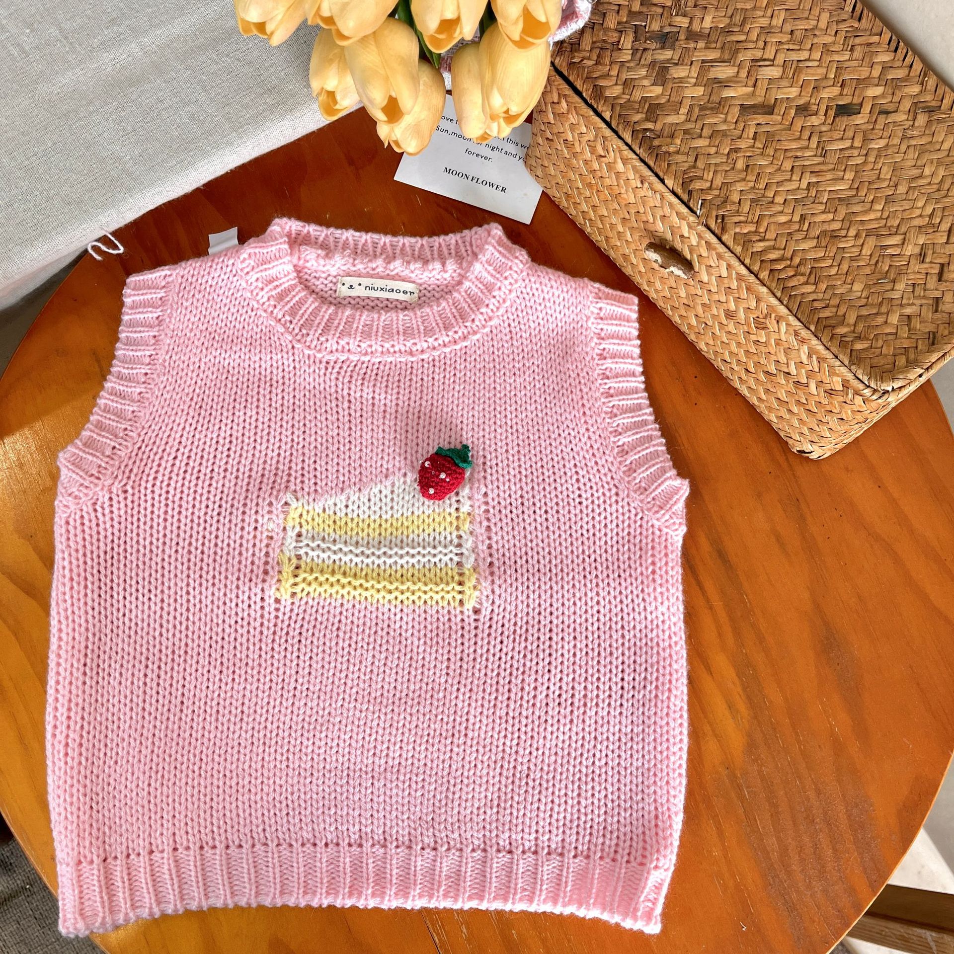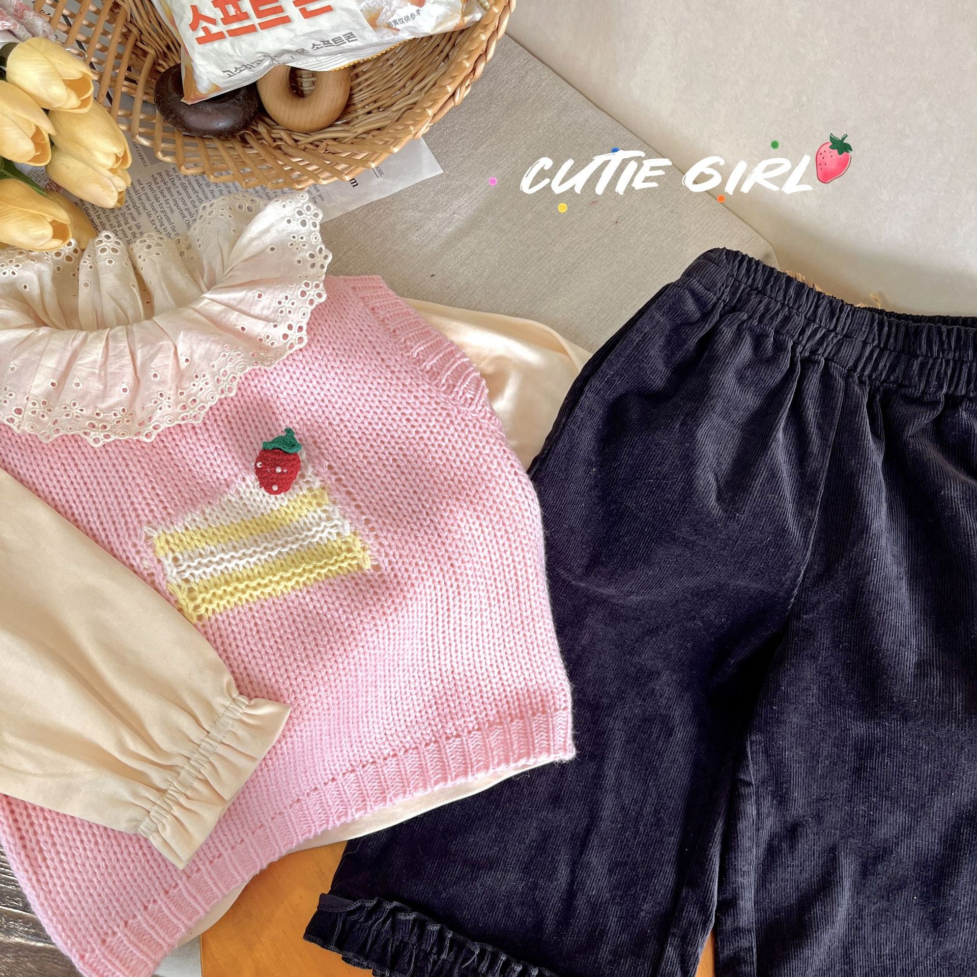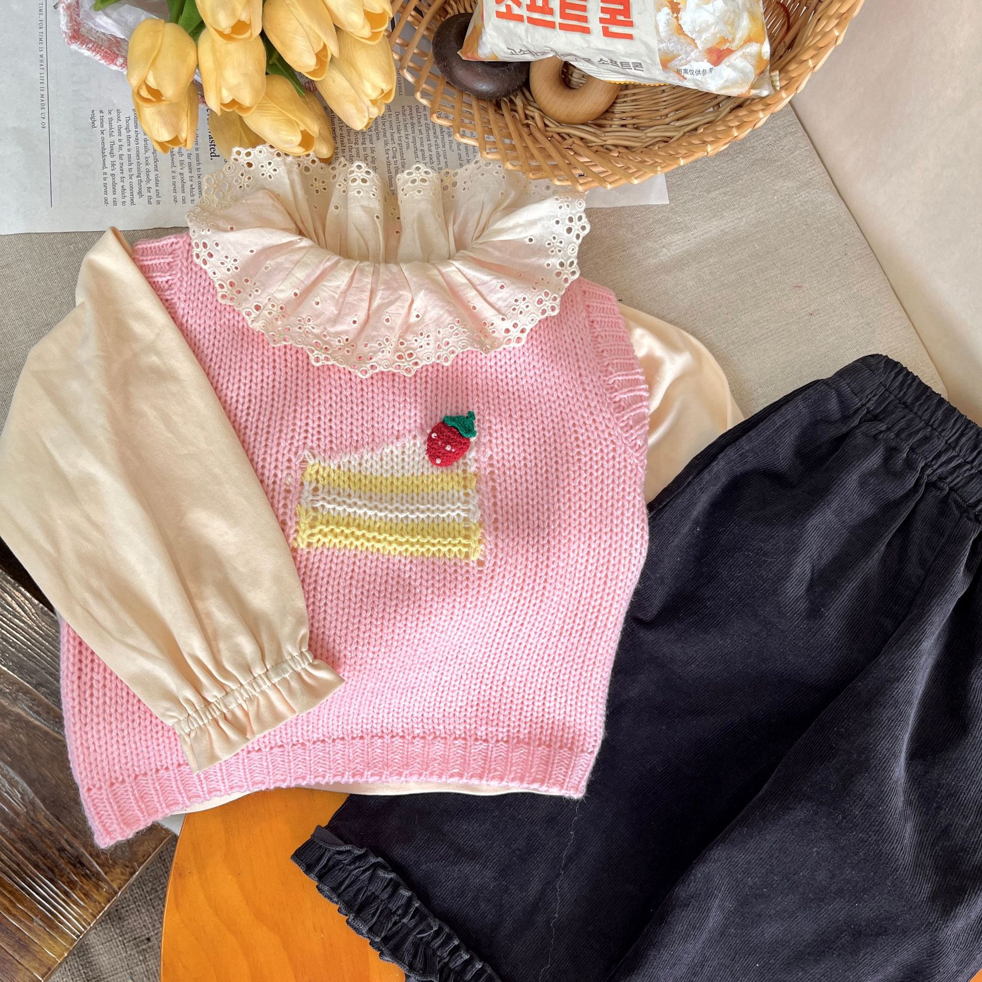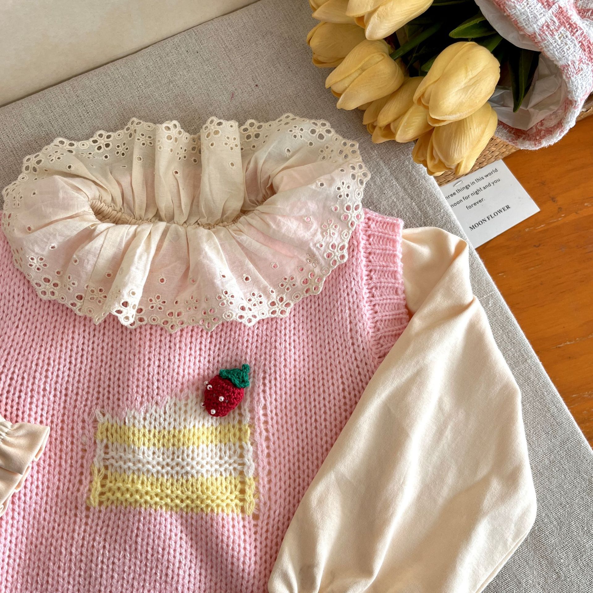 재고 정리~2025년 봄 여아용 딸기 케이크 스웨터 조끼&폴라넥 셔츠&플라워 레이스 캐주얼 팬츠