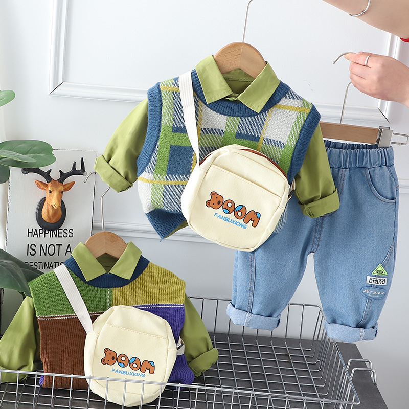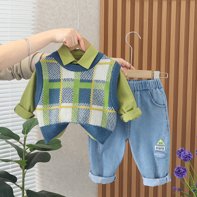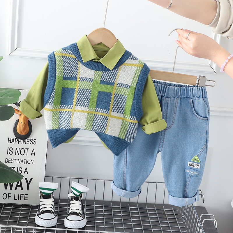 대외 무역 봄과 가을 세트 가을 새로운 인터넷 연예인 프라이드 스트리트 중소 어린이 격자 무늬 컬러 매칭 조끼 긴팔 3 피스 세트 트렌디스토어 가기