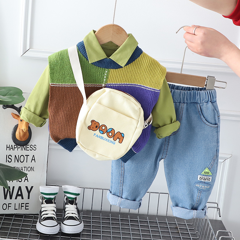 대외 무역 봄과 가을 세트 가을 새로운 인터넷 연예인 프라이드 스트리트 중소 어린이 격자 무늬 컬러 매칭 조끼 긴팔 3 피스 세트 트렌디