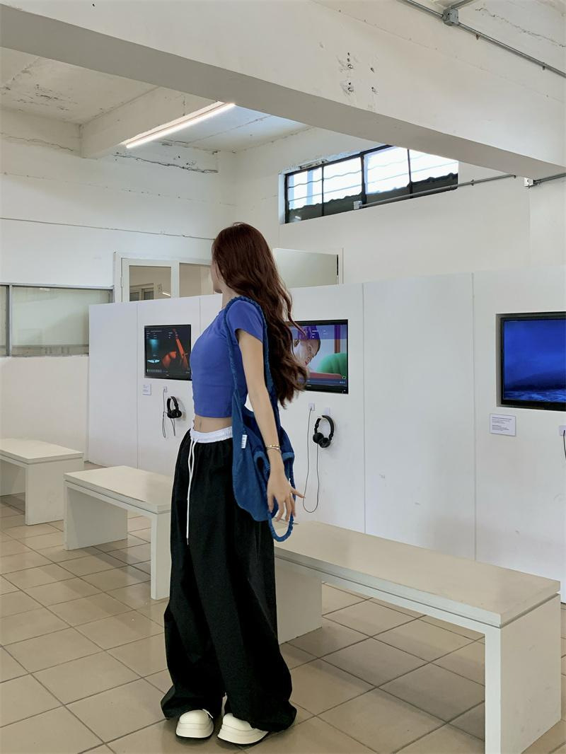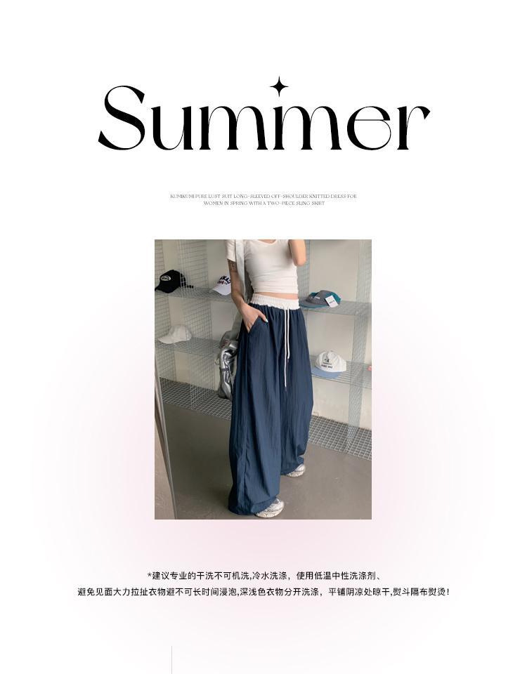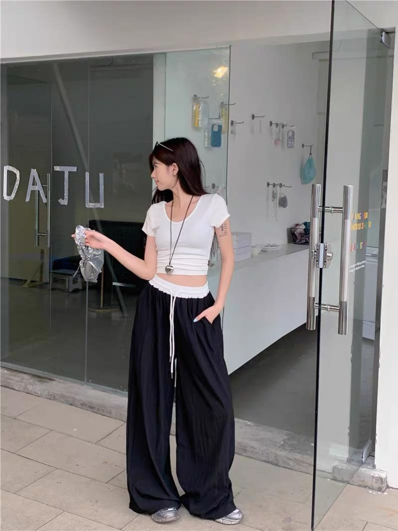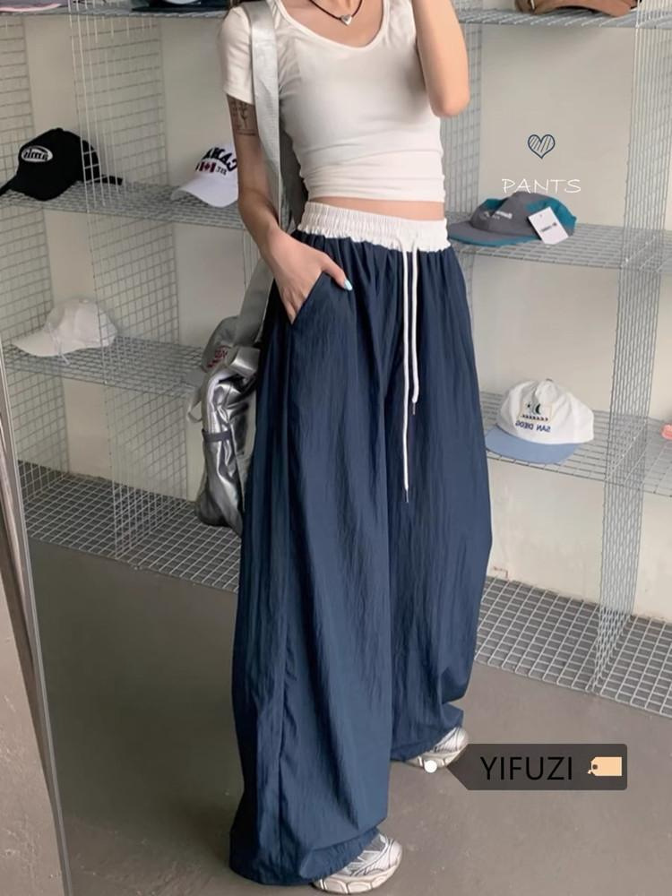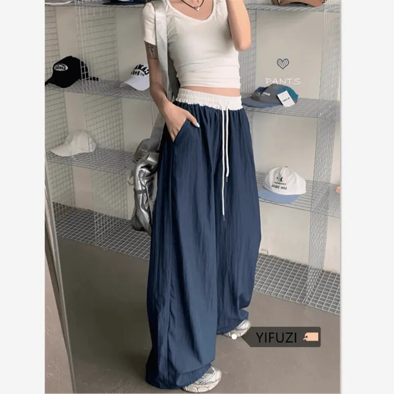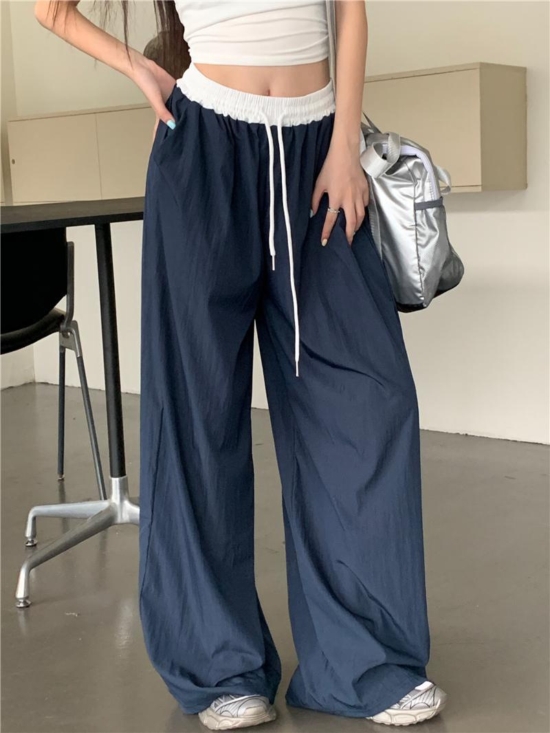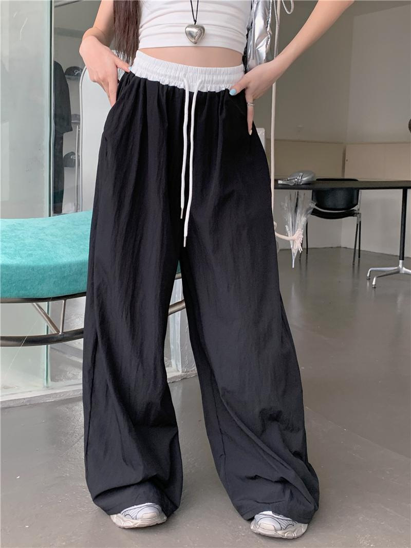 여름 새로운 미국 복고풍 거리 스타일 일치하는 색상 높은 허리 바지 여성 패션 슬림 넓은 다리 바지 라이브 공급