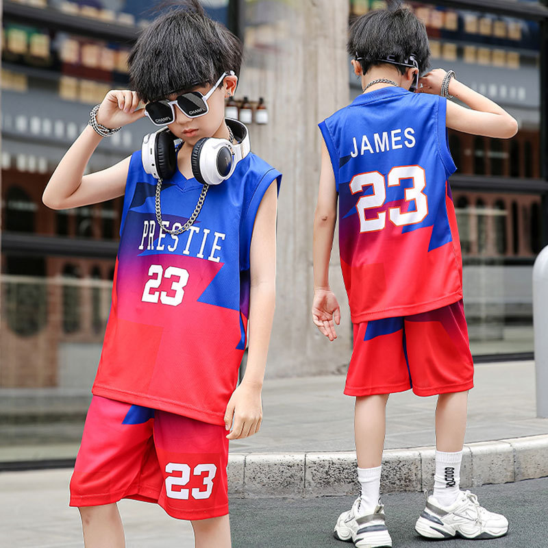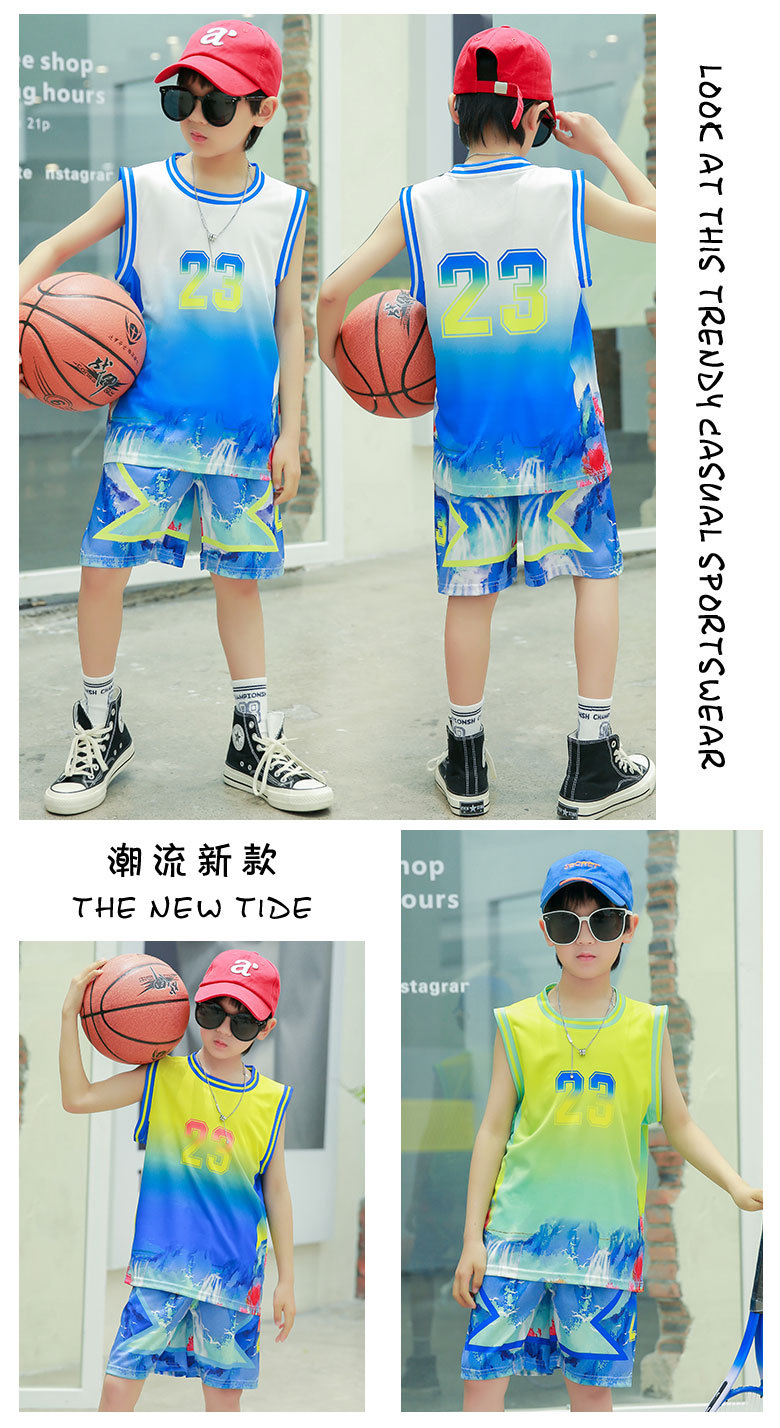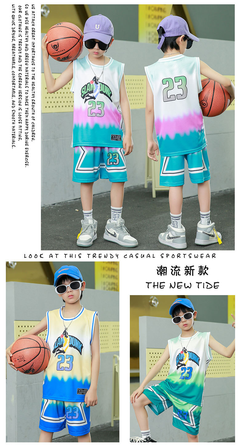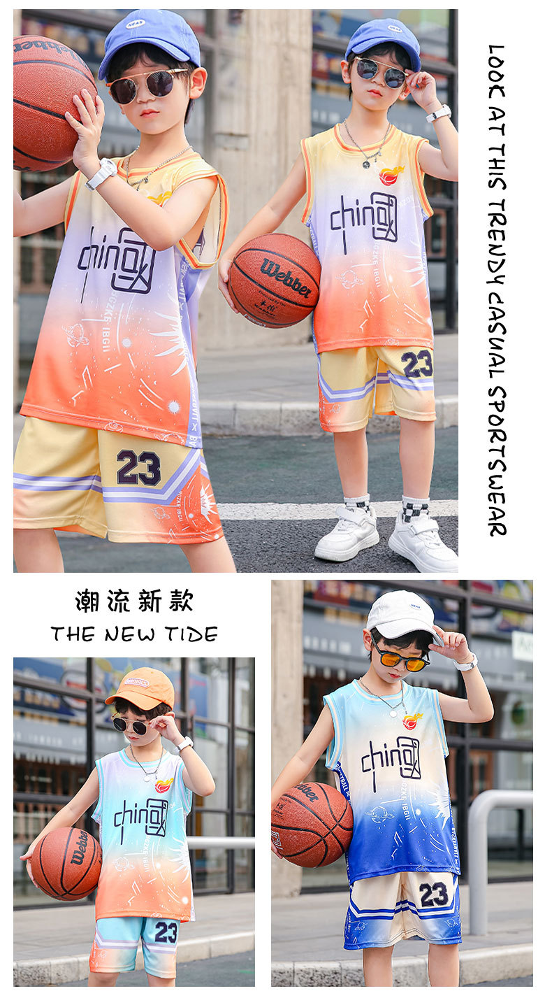 새로운 어린이 농구 옷 세트 소년 여름 조끼 소녀 패션 쿨웨어 그라디언트 야외 캐주얼 운동복