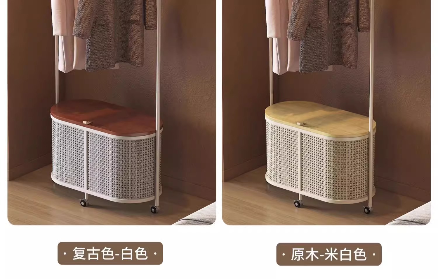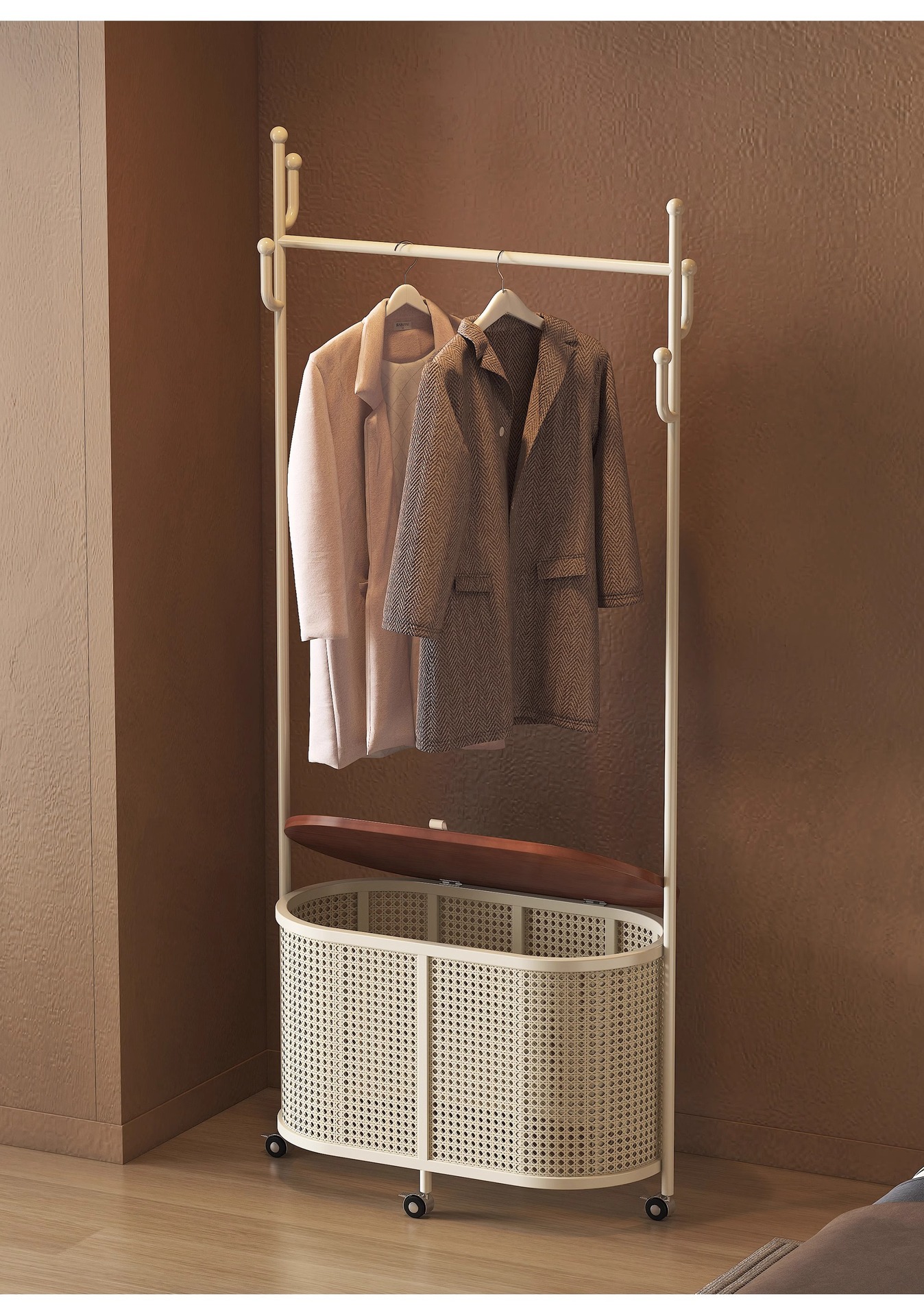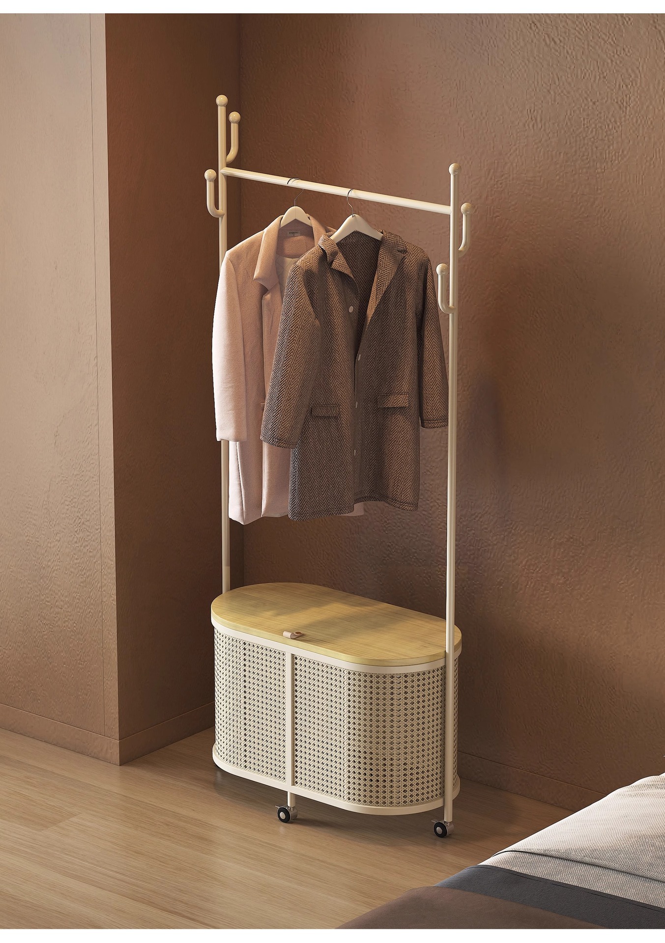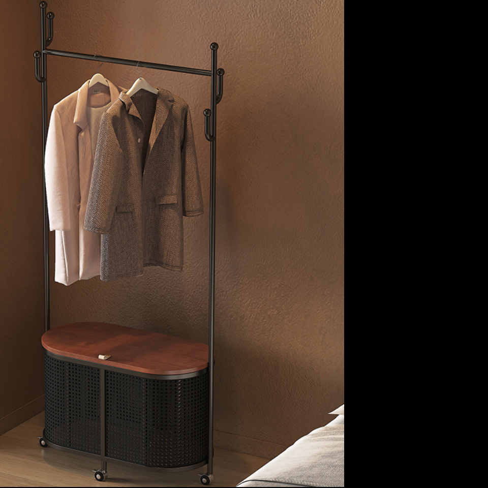 코트 랙 크림 바닥 침실 간단한 프랑스 스타일 모바일 등나무 옷 바구니 옷걸이 가정용 보관 걸이스토어 가기