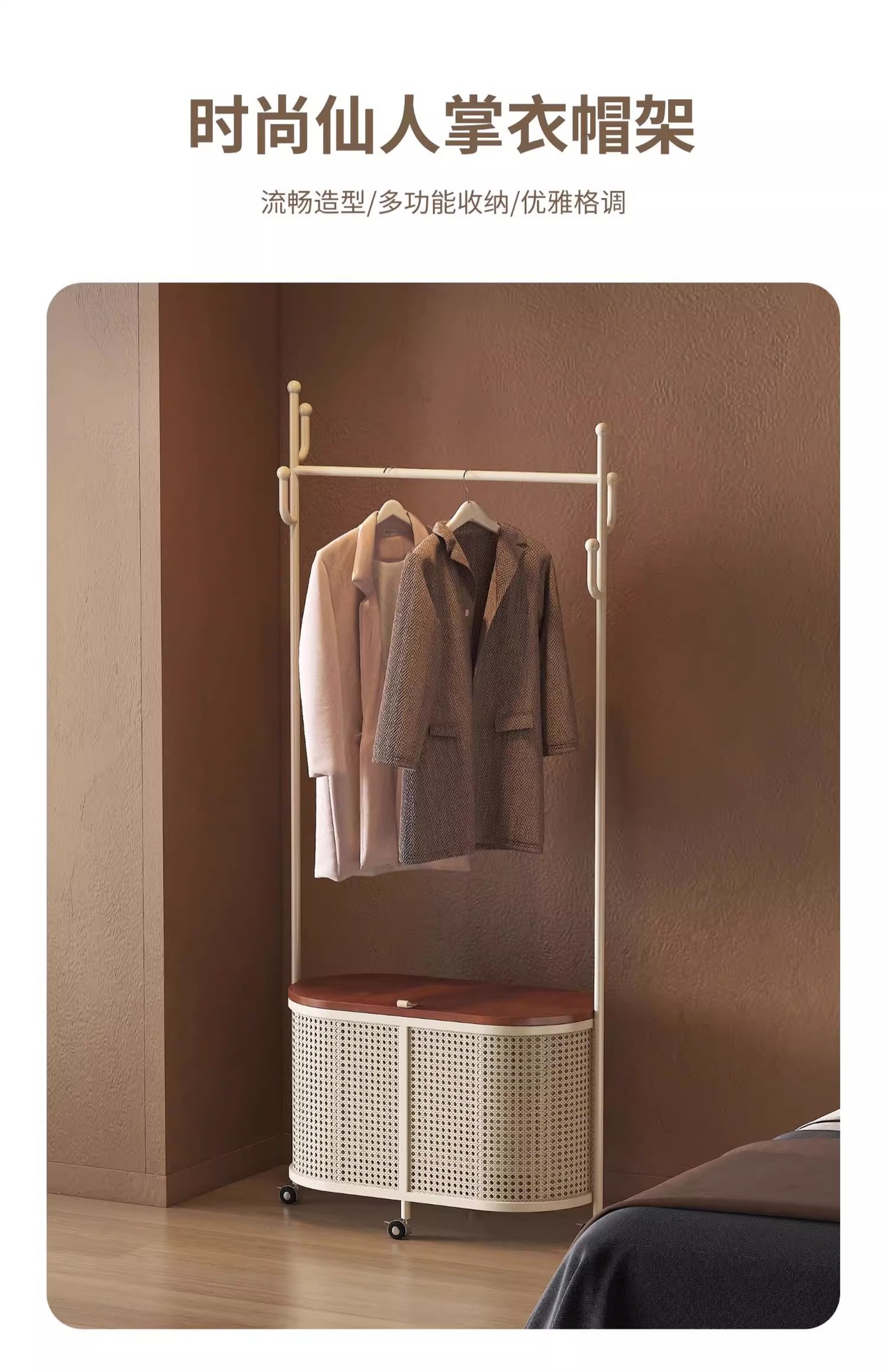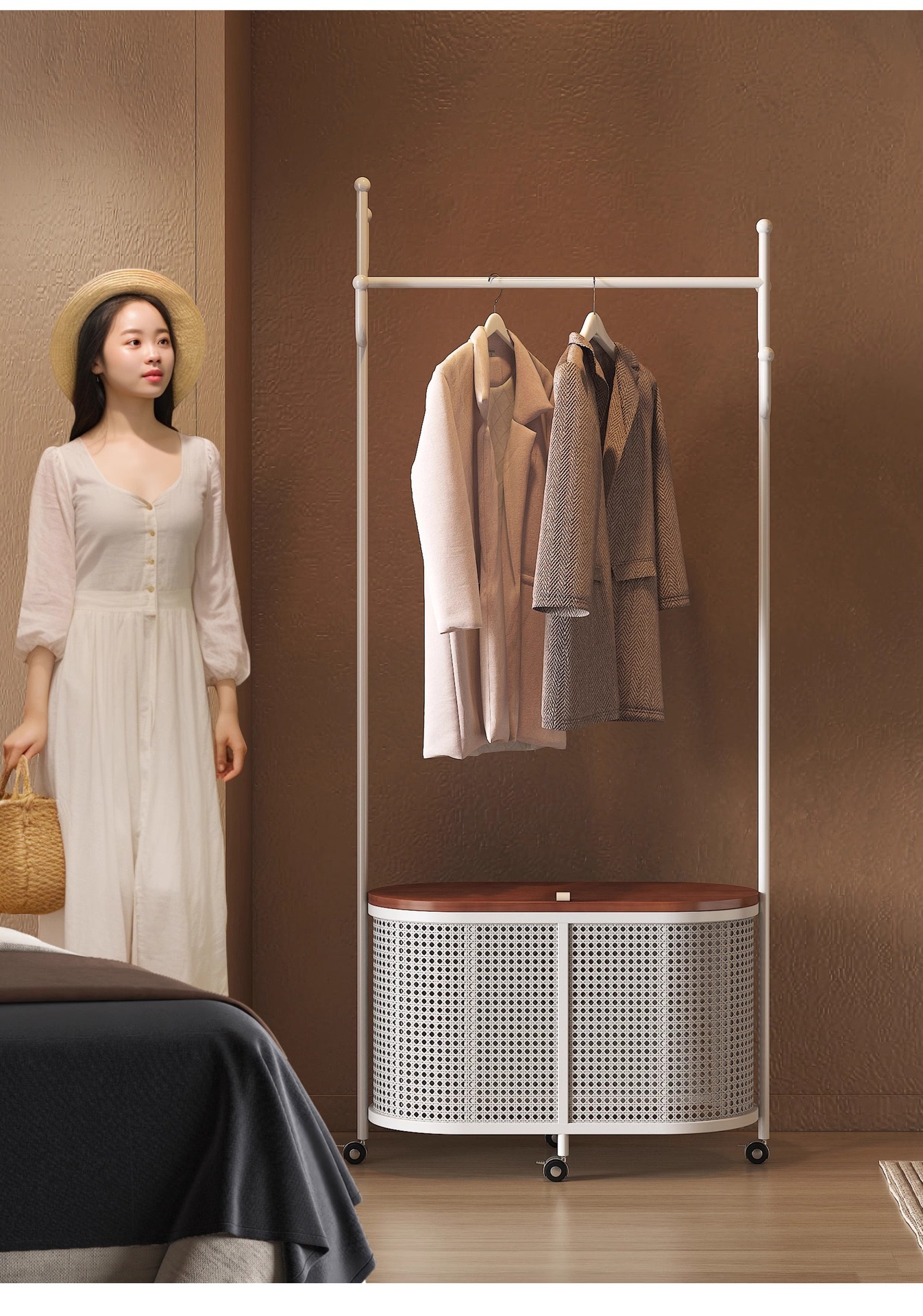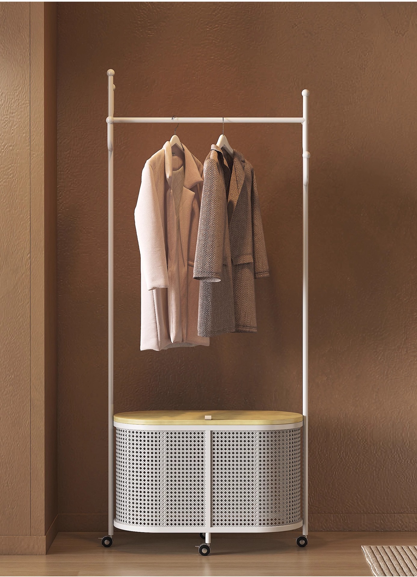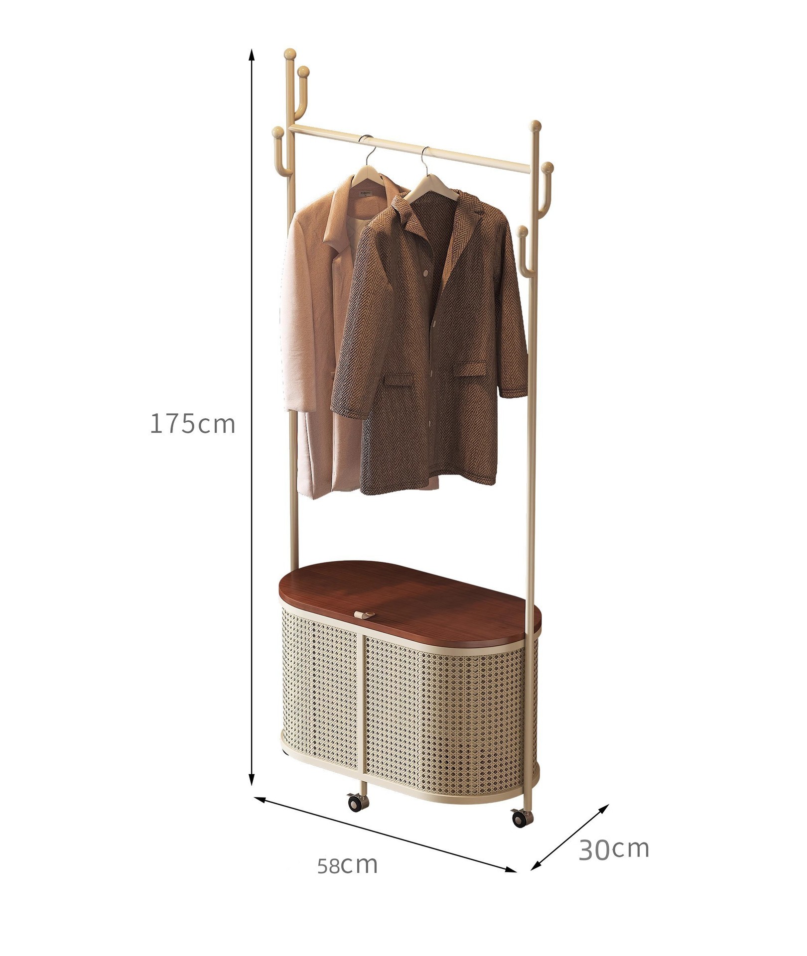 코트 랙 크림 바닥 침실 간단한 프랑스 스타일 모바일 등나무 옷 바구니 옷걸이 가정용 보관 걸이스토어 가기