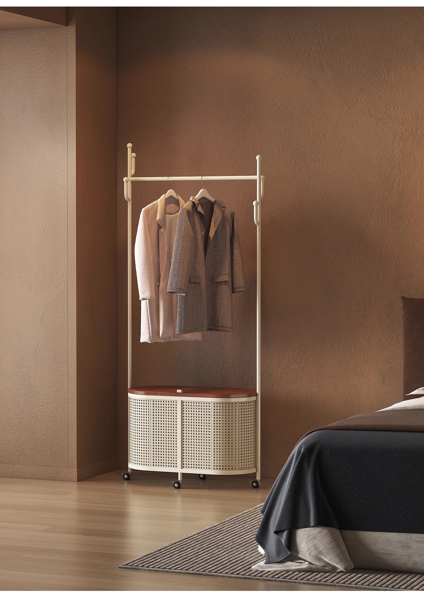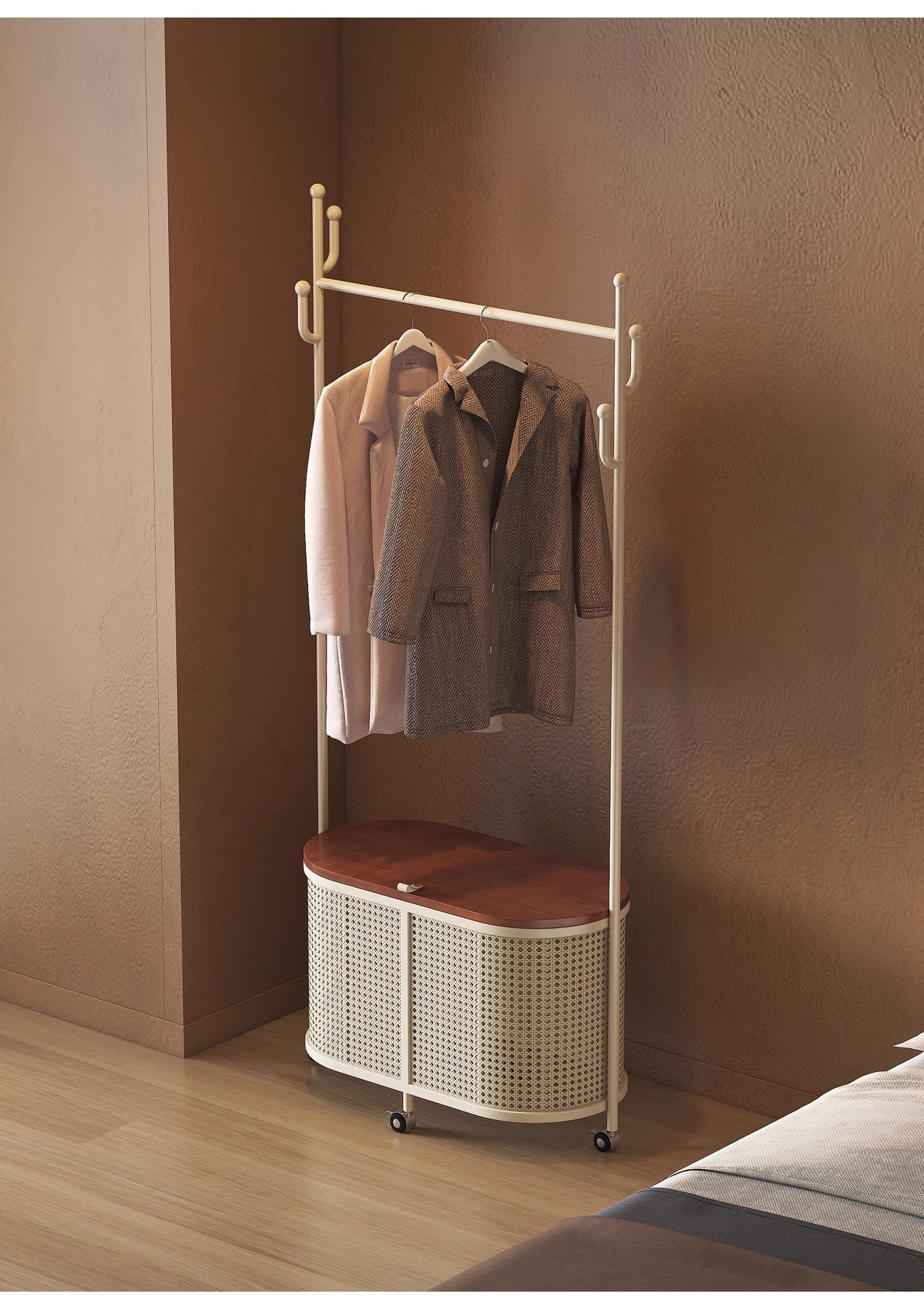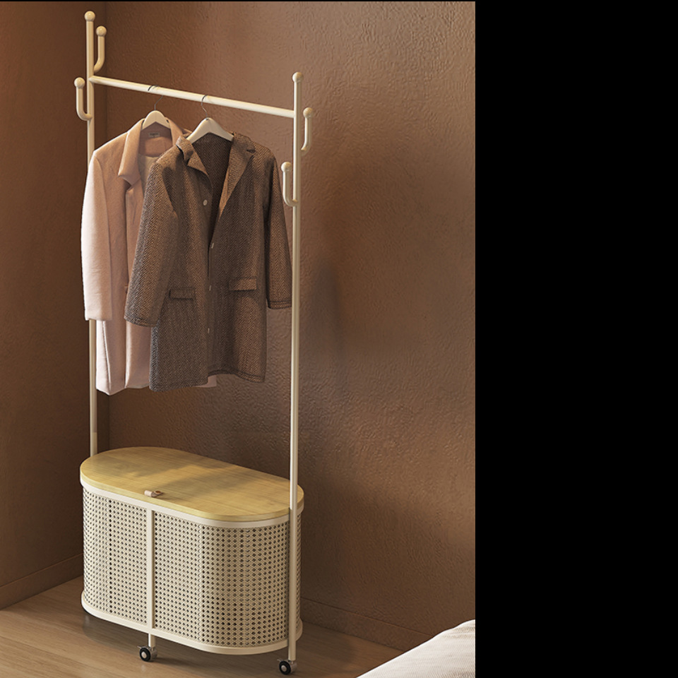 코트 랙 크림 바닥 침실 간단한 프랑스 스타일 모바일 등나무 옷 바구니 옷걸이 가정용 보관 걸이