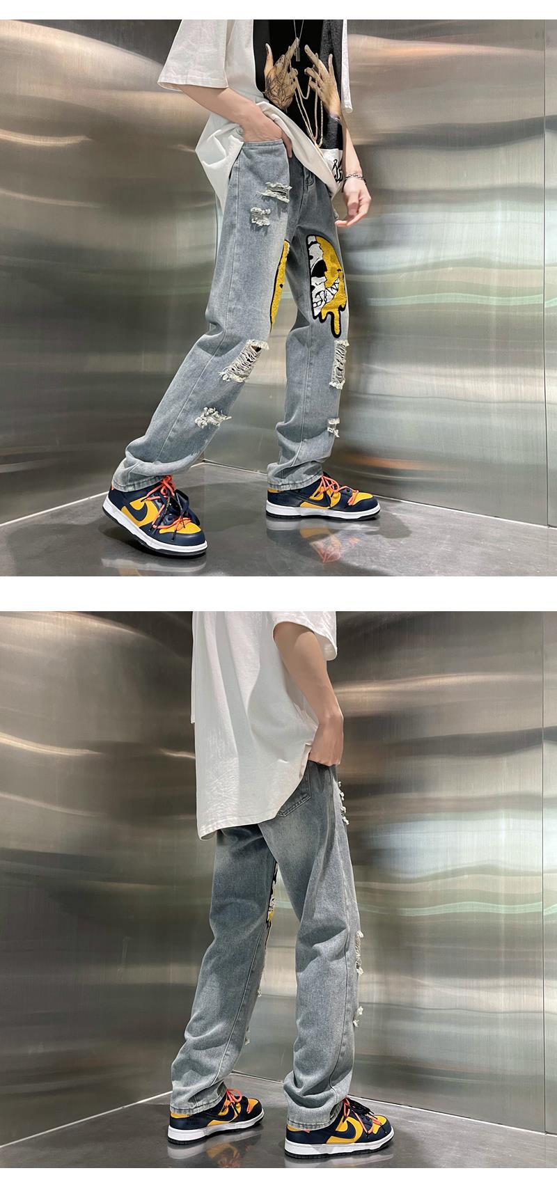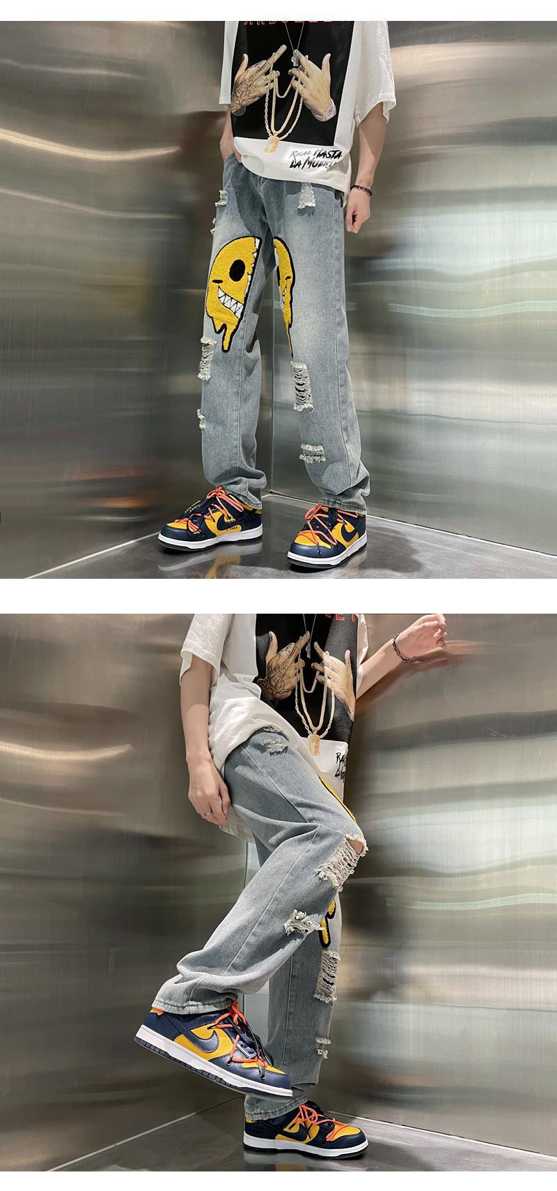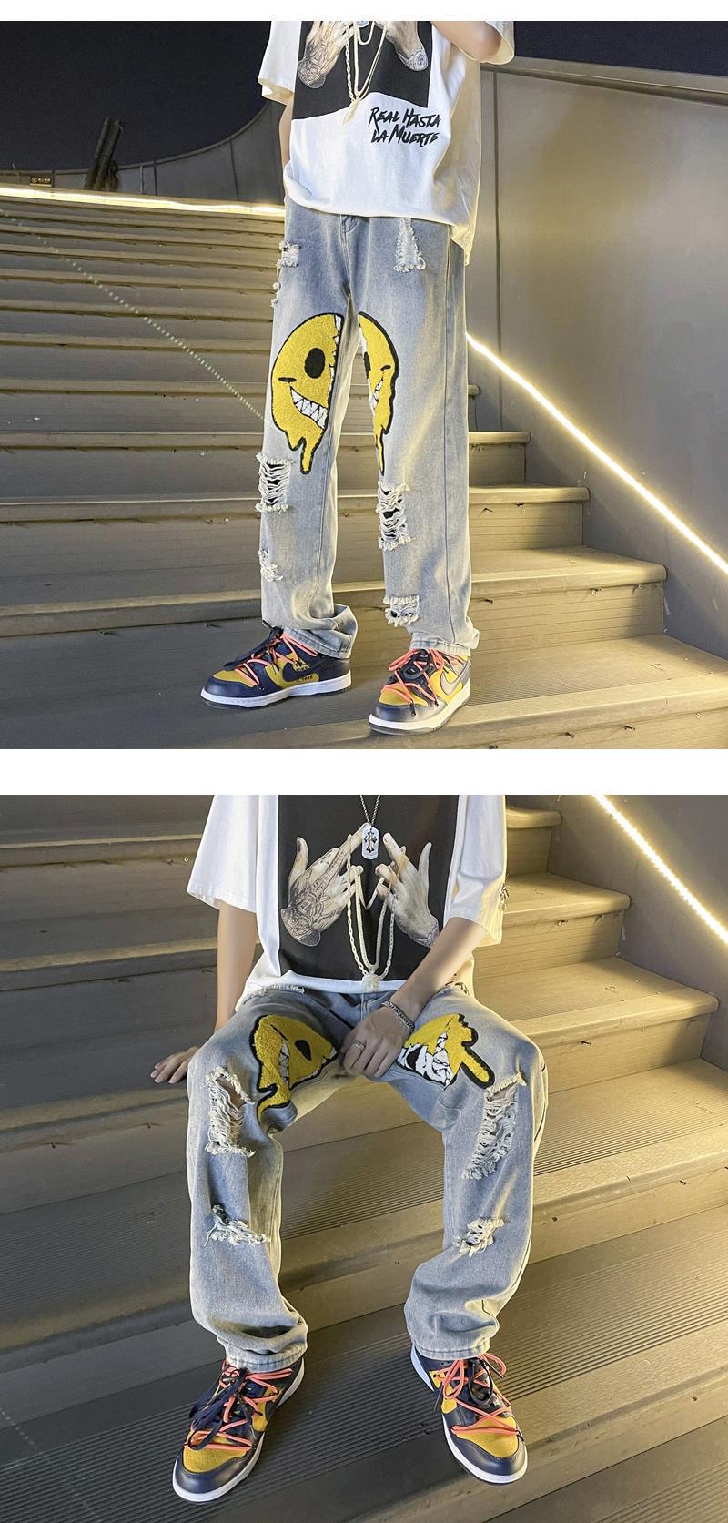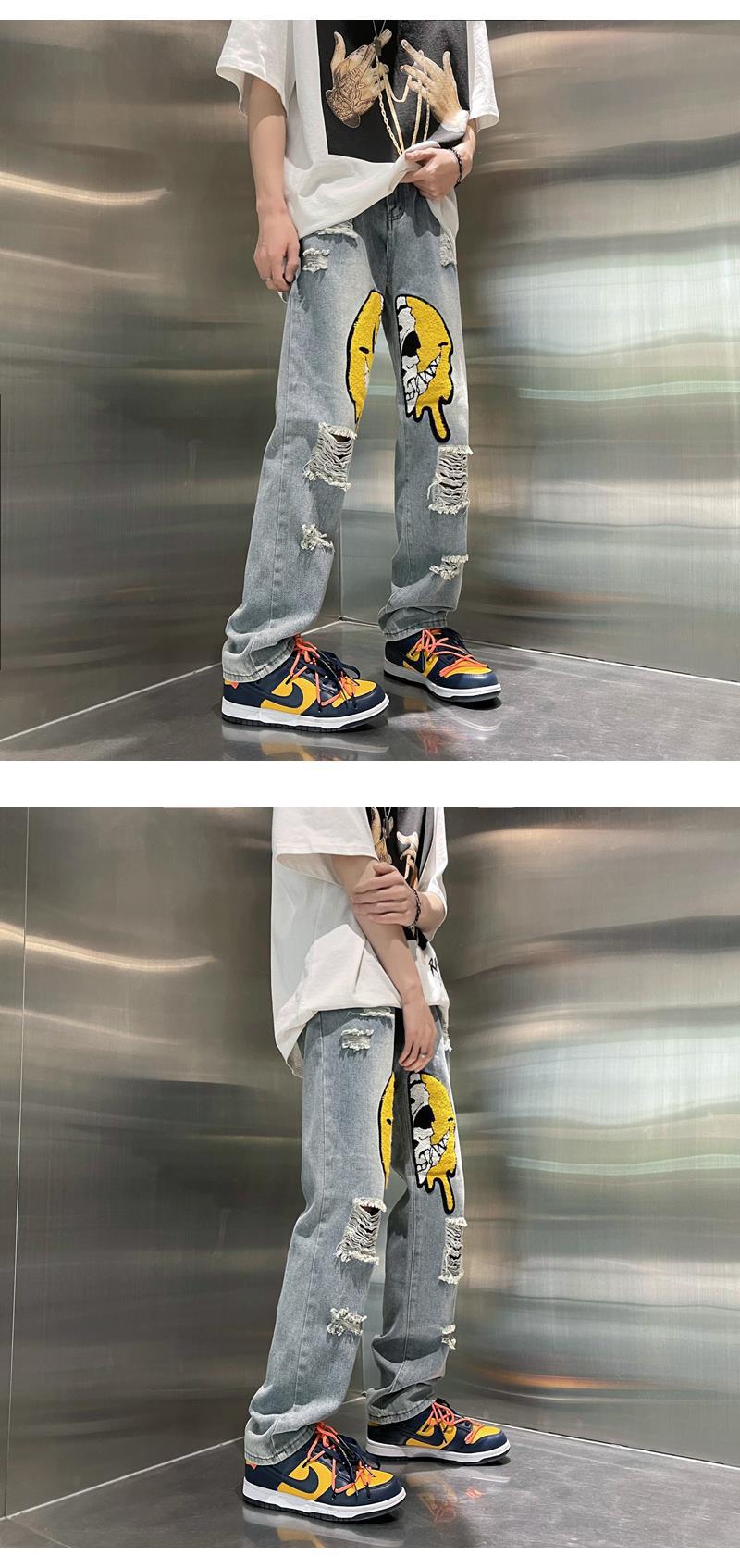 미국식 리핑 청바지 남자 여름 얇은 느슨한 와이드 레그 남자 바지 패션 브랜드 하이 스트리트 홍콩 스타일 스트레이트 바지스토어 가기