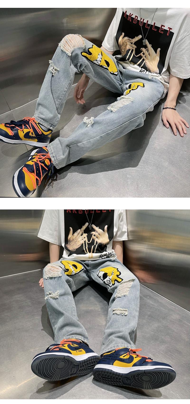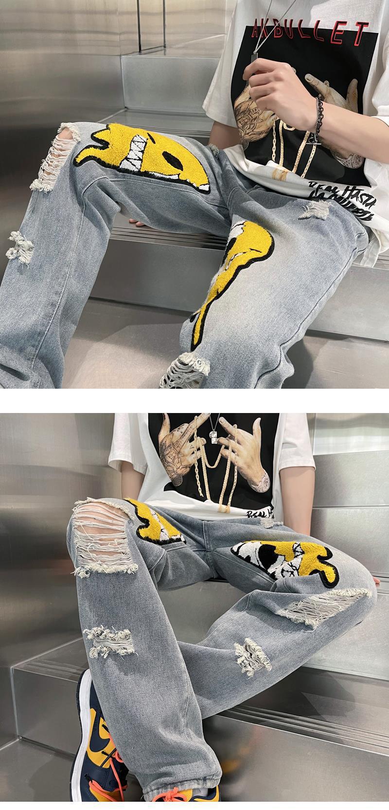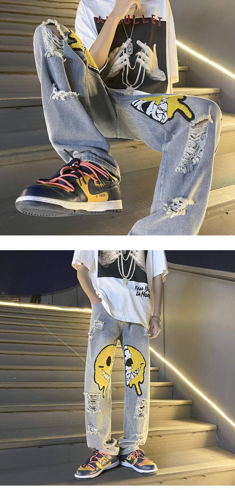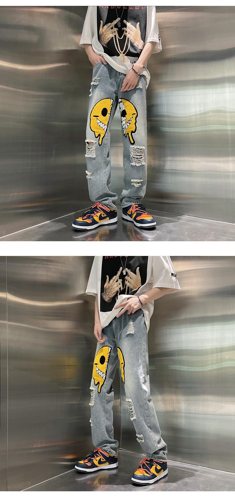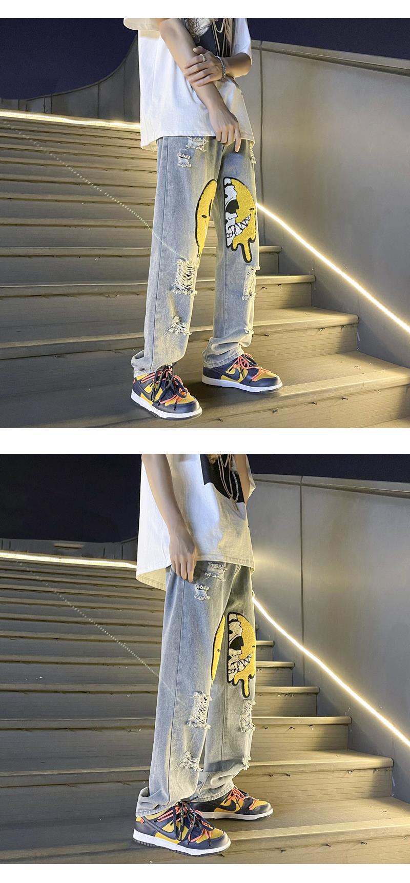 미국식 리핑 청바지 남자 여름 얇은 느슨한 와이드 레그 남자 바지 패션 브랜드 하이 스트리트 홍콩 스타일 스트레이트 바지스토어 가기