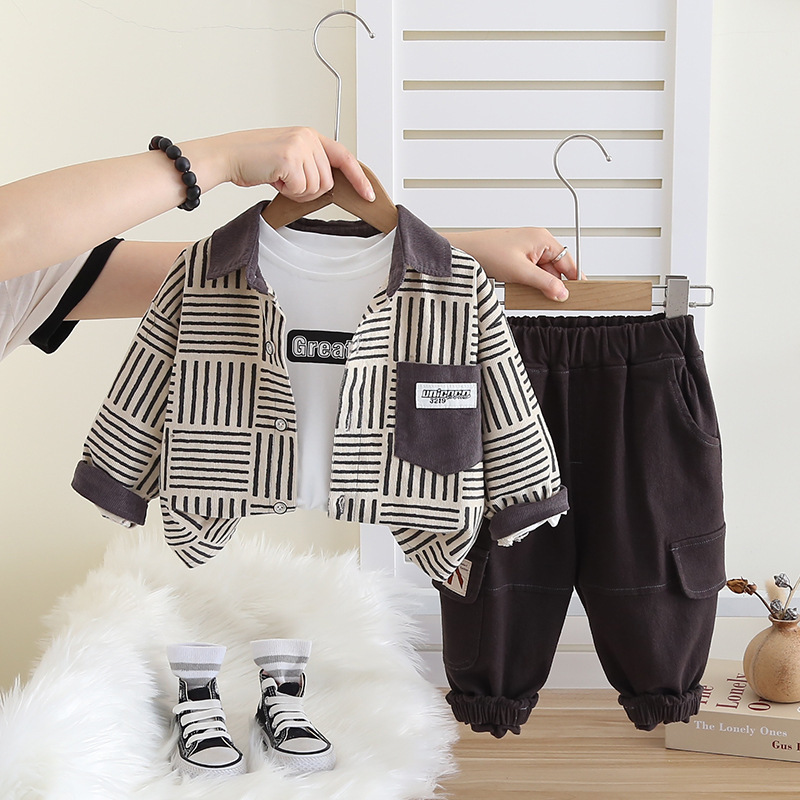 소년의 봄 세트 2024 새로운 스타일 아기 셔츠 벨벳 재킷 아기의 봄과 가을 잘 생긴 3 피스 세트스토어 가기