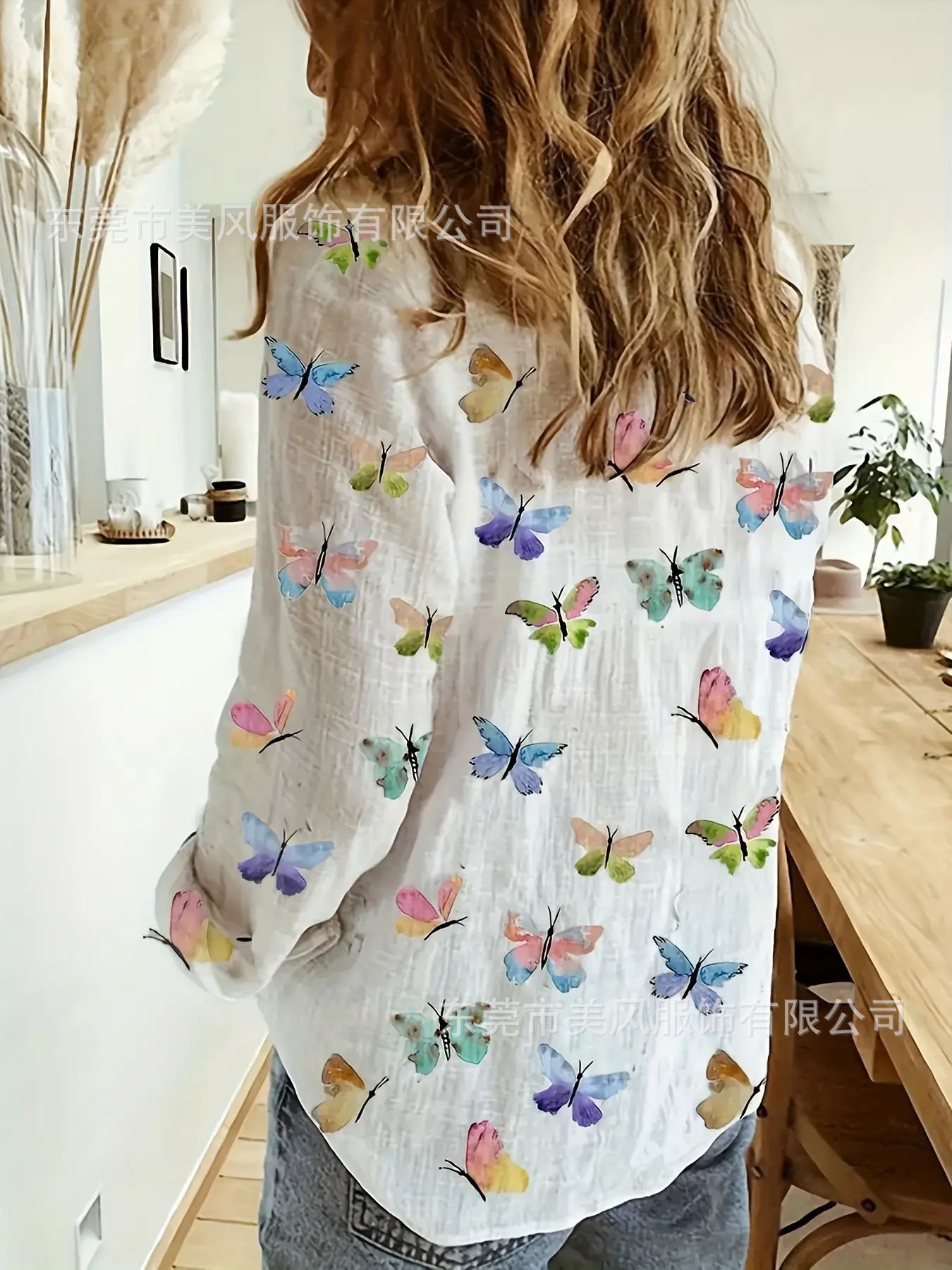 아마존 유럽과 미국 대외 무역 여성의 디지털 인쇄 나비 꽃 옷깃 도시 기질 긴 소매 버튼 셔츠스토어 가기