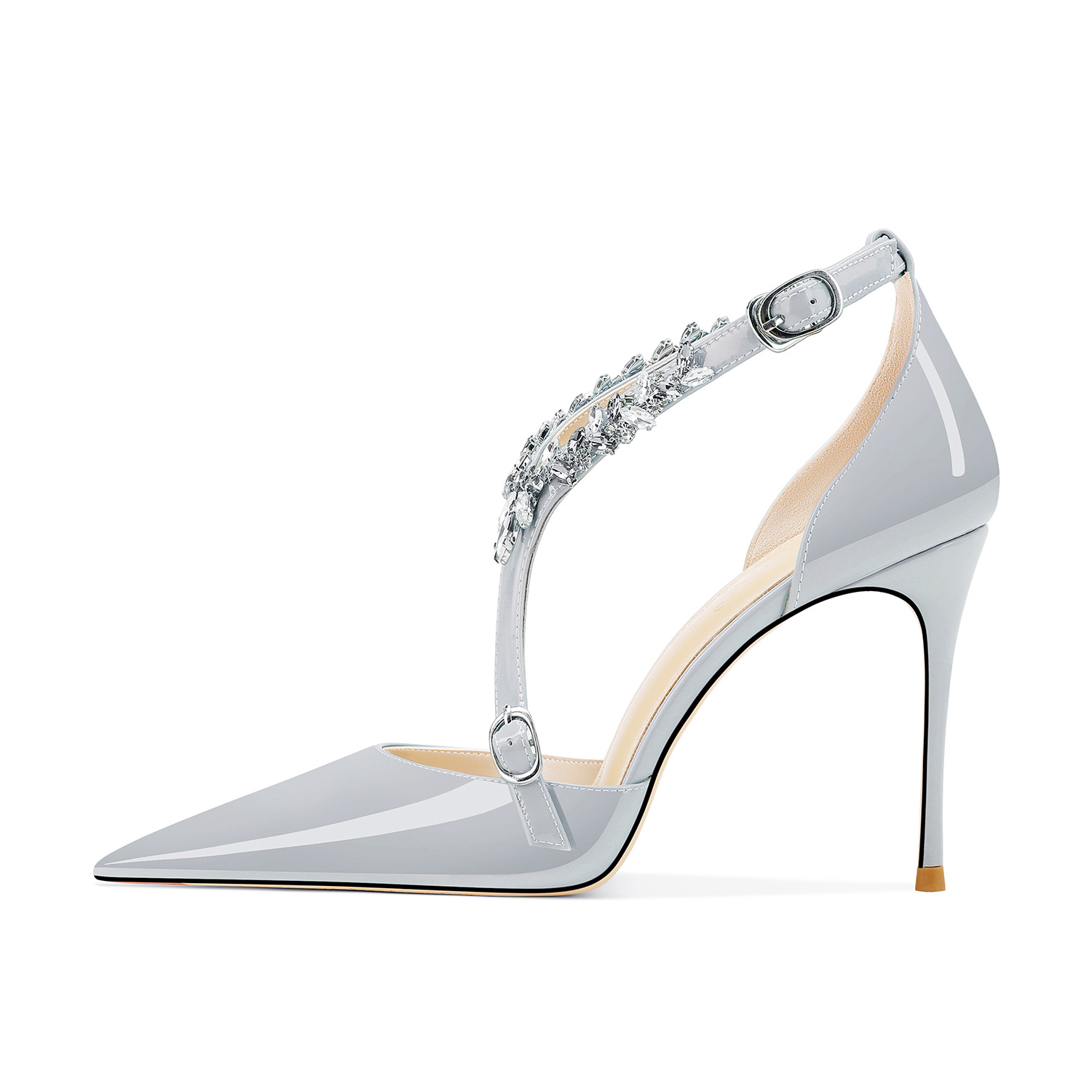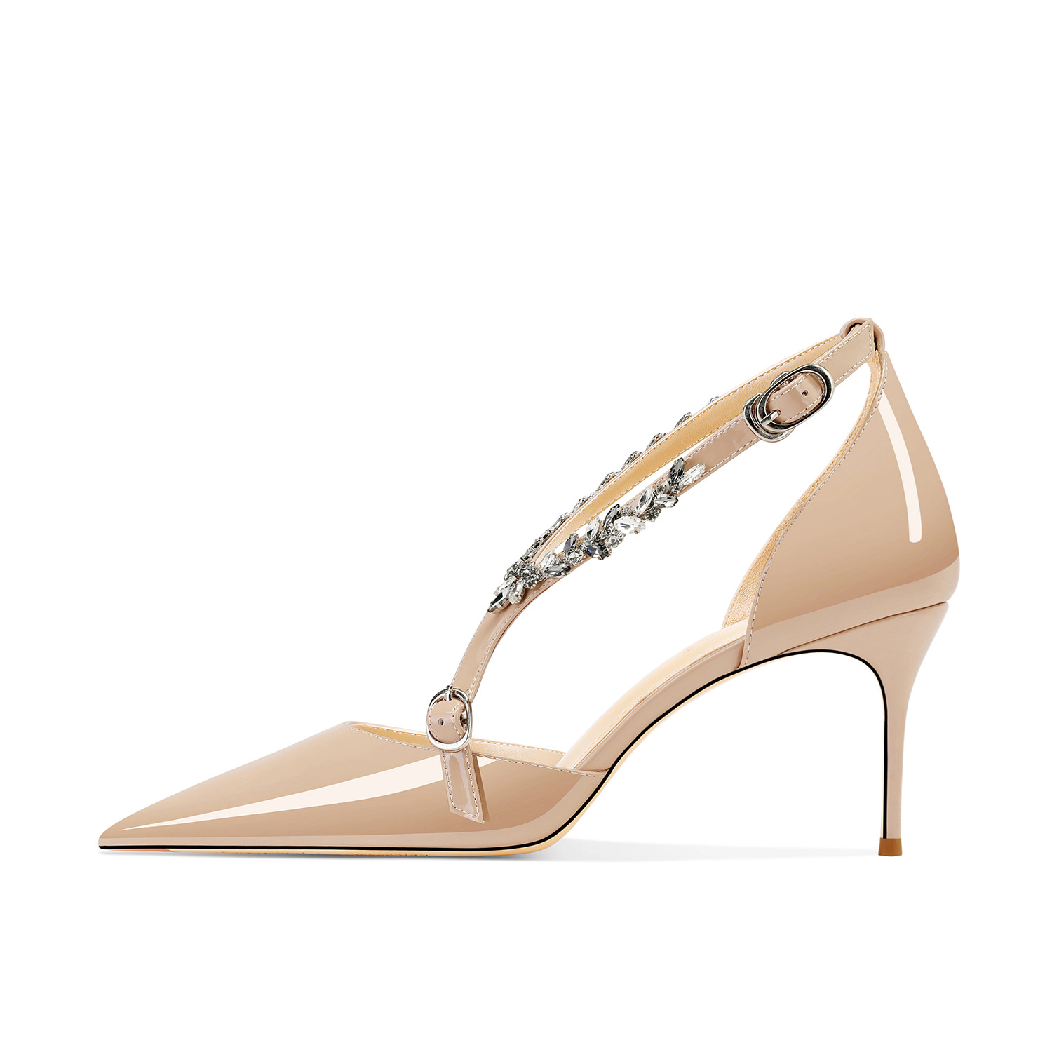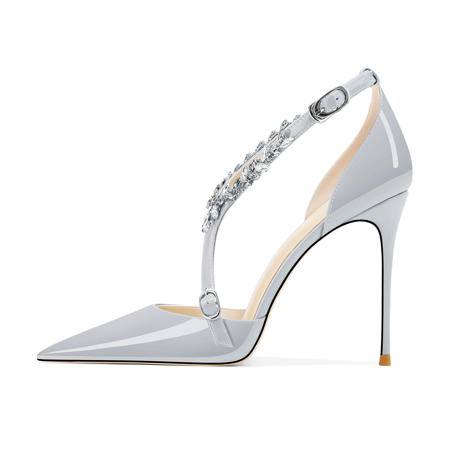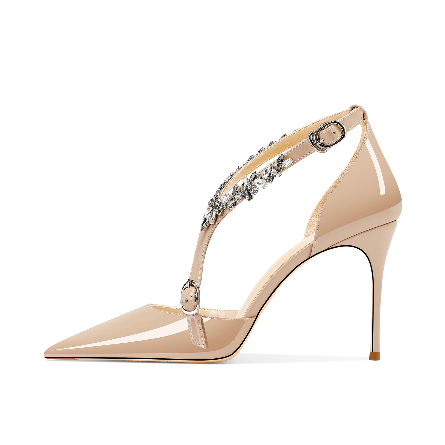 플러스 사이즈 정품 가죽 라인스톤 하이힐 슈즈 2024 새 여름 올매치 포인티드 스틸레토 힐 버클 스트랩 여성용 샌들스토어 가기