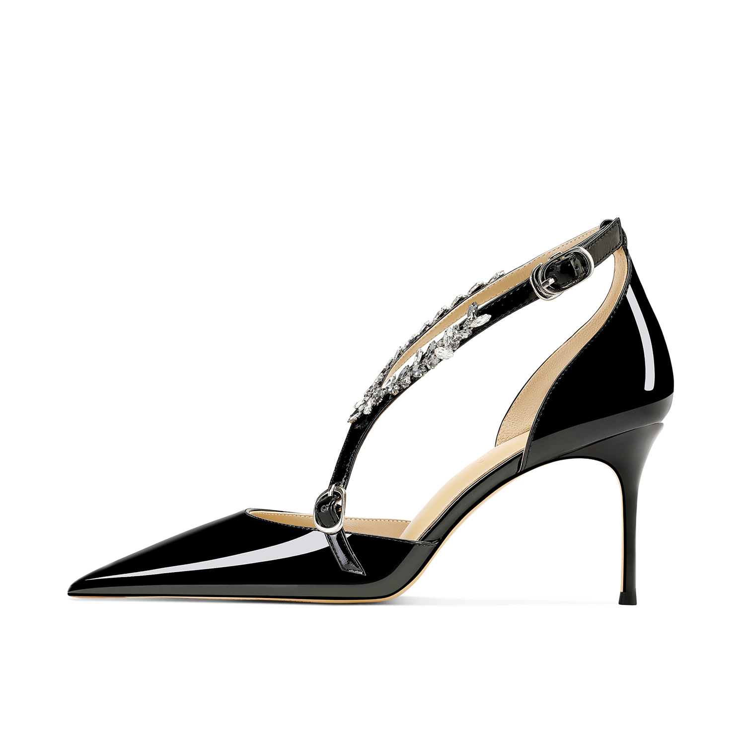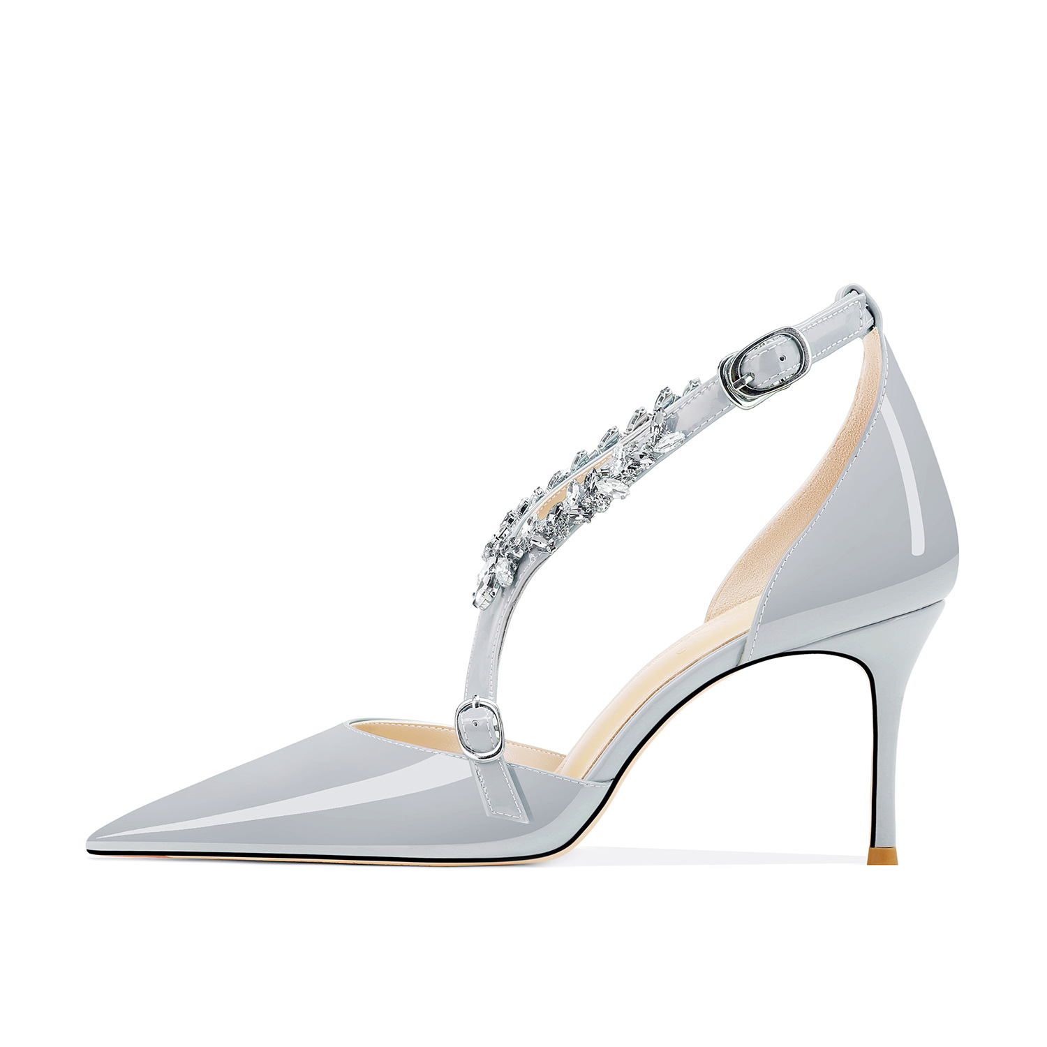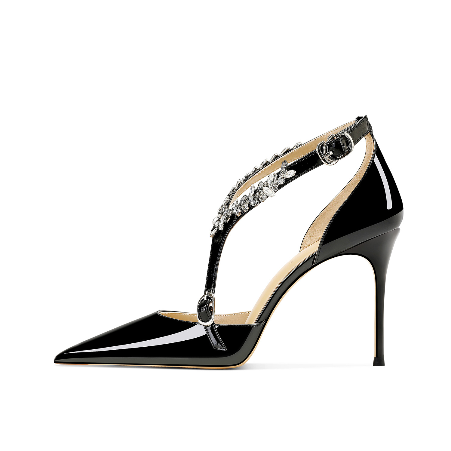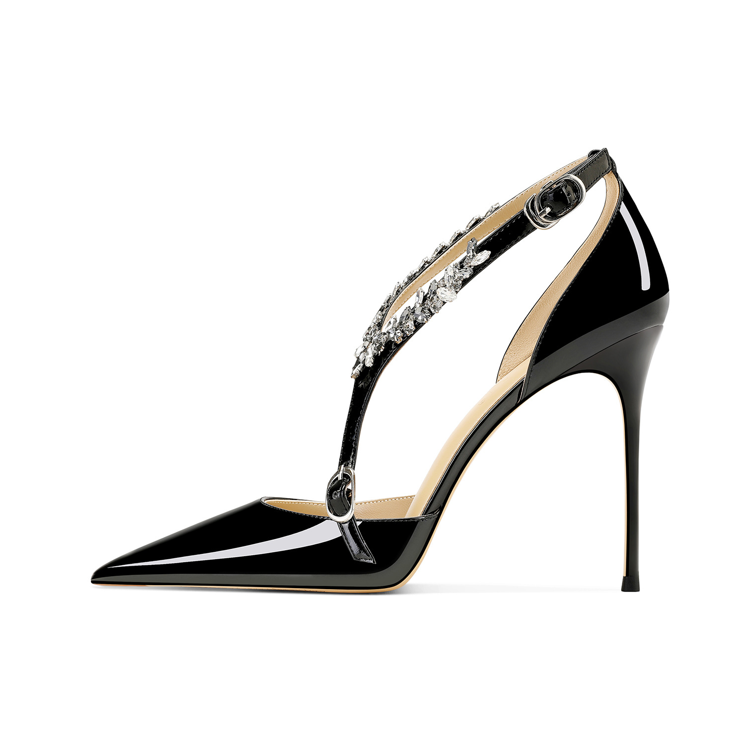 플러스 사이즈 정품 가죽 라인스톤 하이힐 슈즈 2024 새 여름 올매치 포인티드 스틸레토 힐 버클 스트랩 여성용 샌들스토어 가기