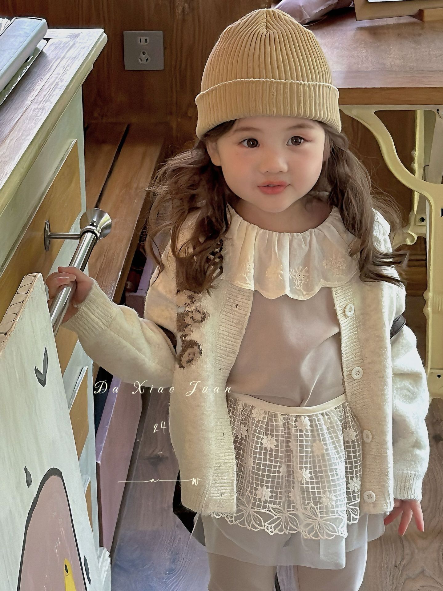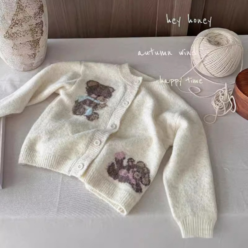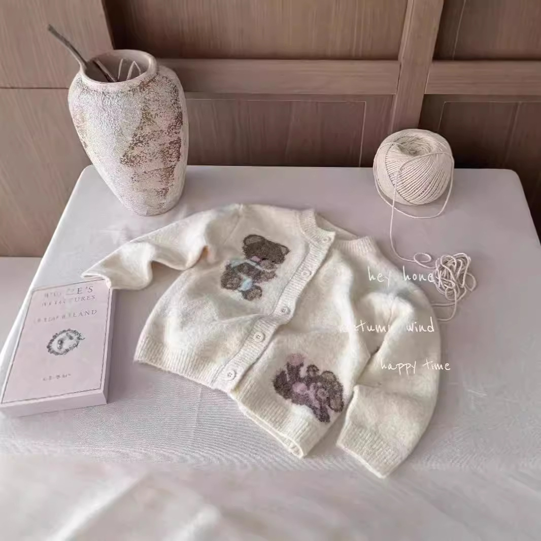 스팟 사이즈 롤 24 봄, 가을 아동용 흰색 스타일리쉬 니트 가디건 재킷 귀여운 곰 무늬 재킷 상의