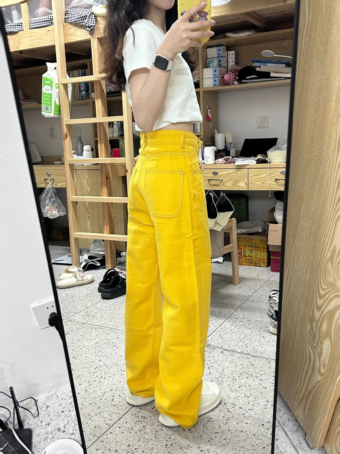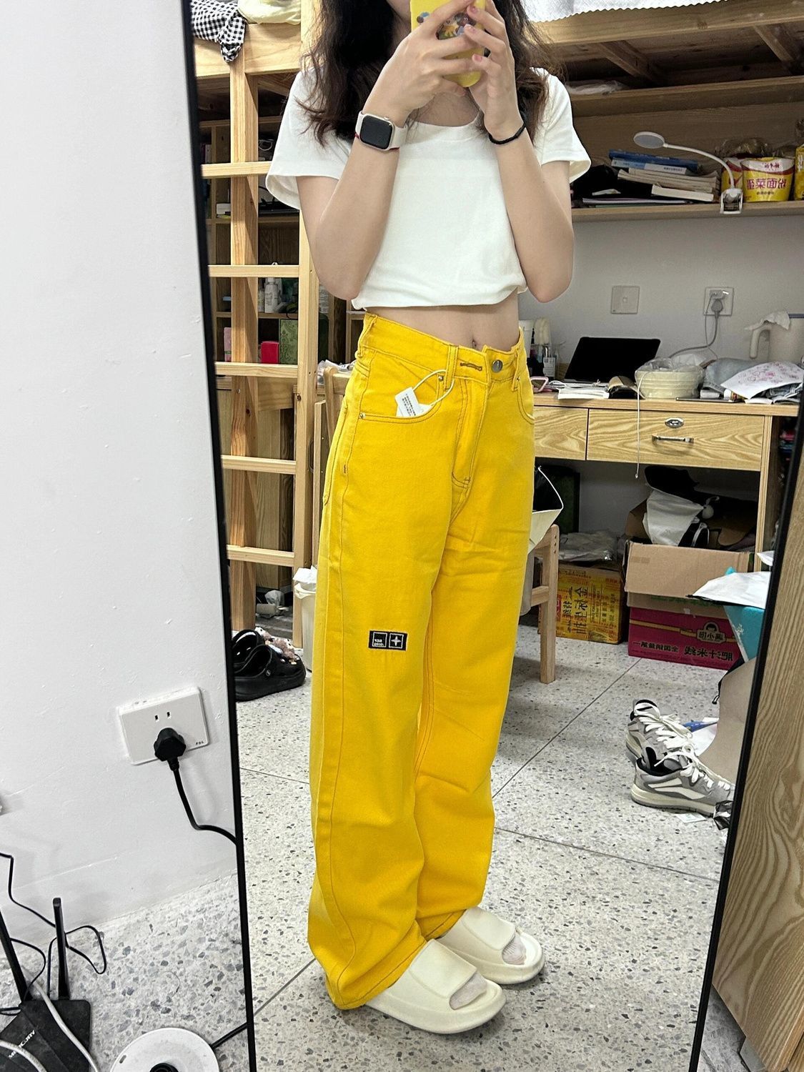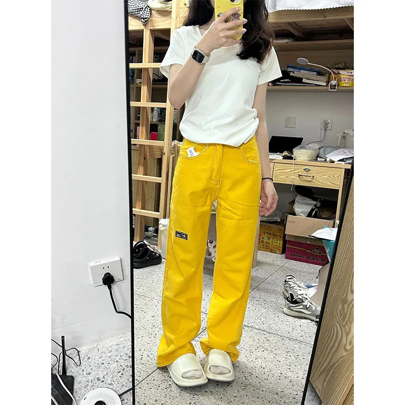 아메리칸 스타일 레트로 노란색 넓은 다리 청바지 여성 여름 2024 새로운 느슨한 슬리밍 높은 허리 스트레이트 바지스토어 가기
