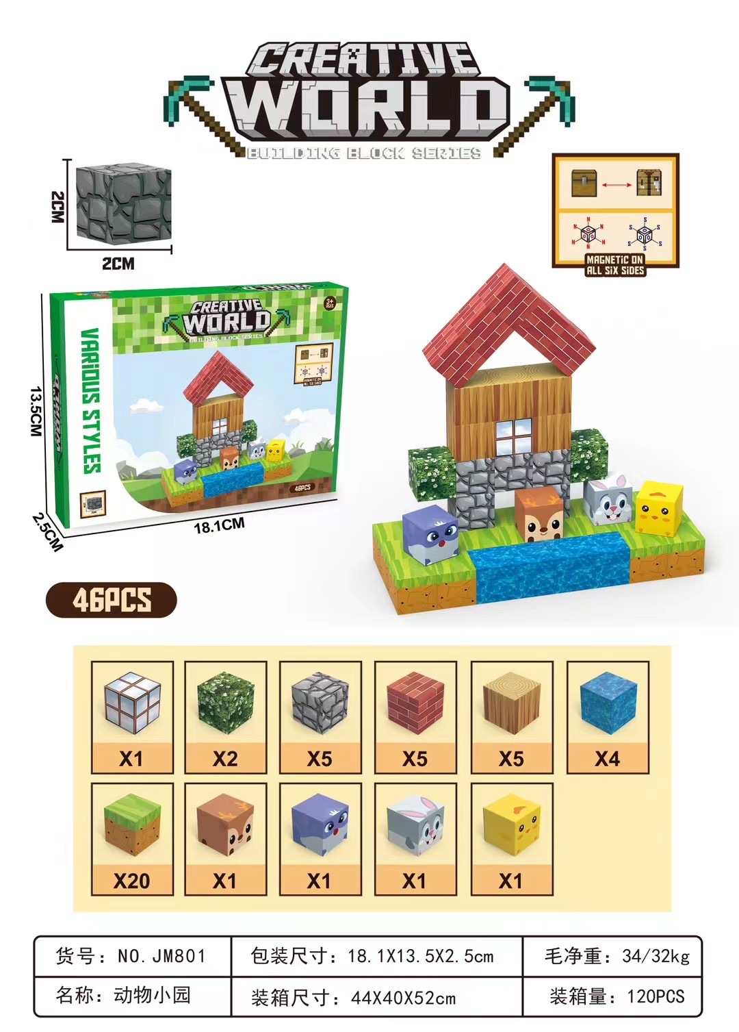 JM801动物小园【46颗粒】英文彩盒、120Pcs/箱