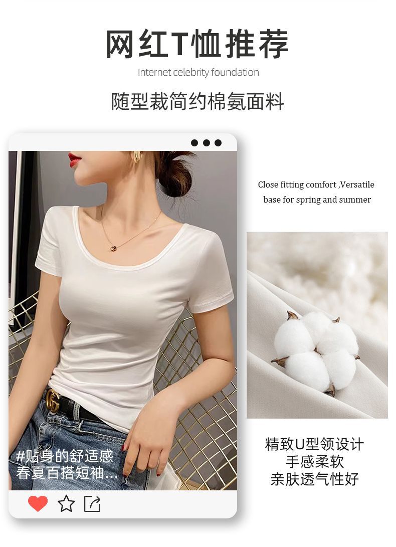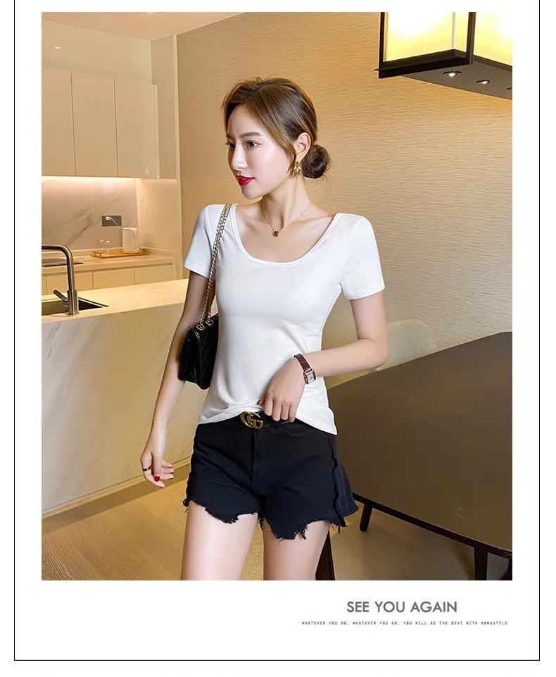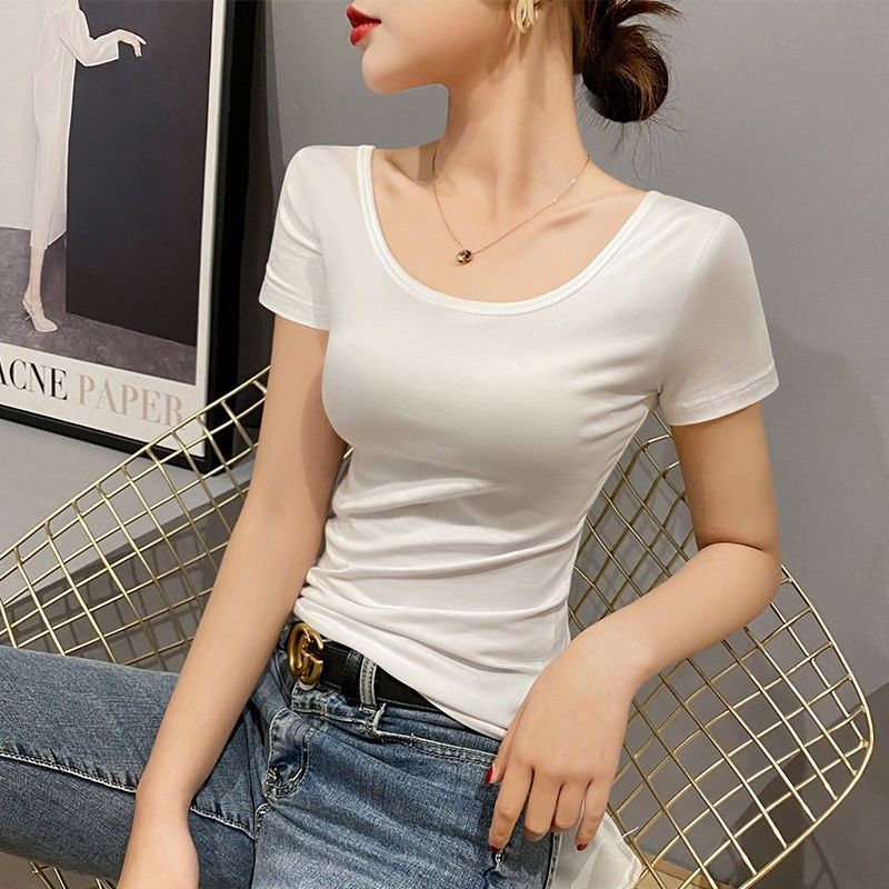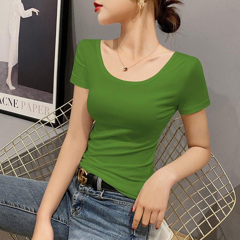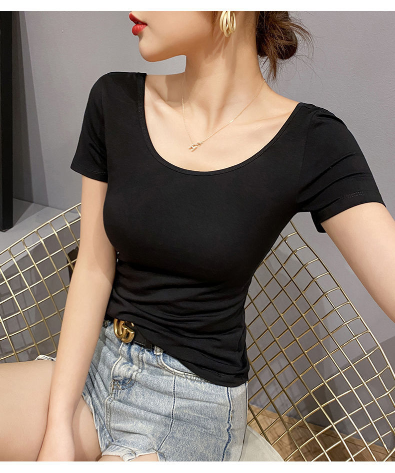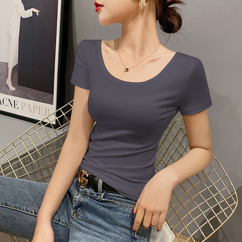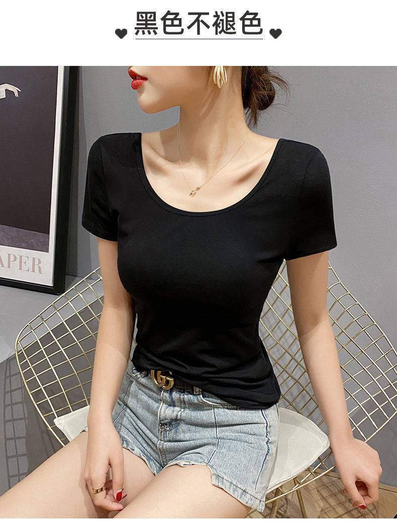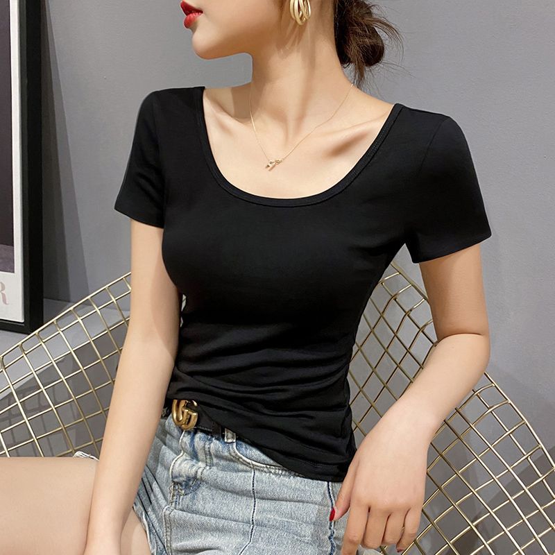 여성용 블랙 반팔 티셔츠 2025 새로운 봄, 여름 U 넥 바닥 슬림 피트 대형 넥 라인 오른쪽 어깨 티셔츠 로우 넥 탑스토어 가기