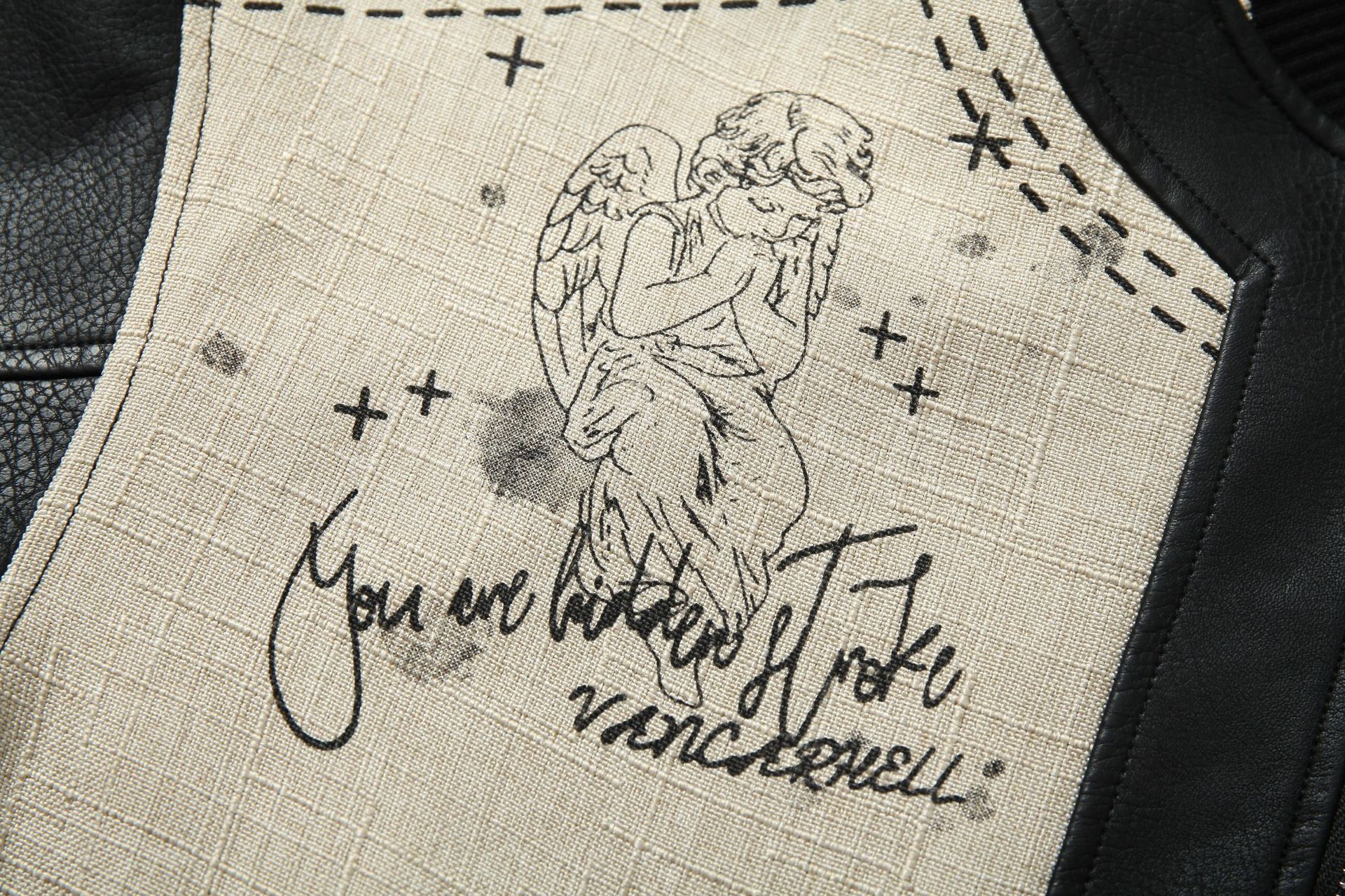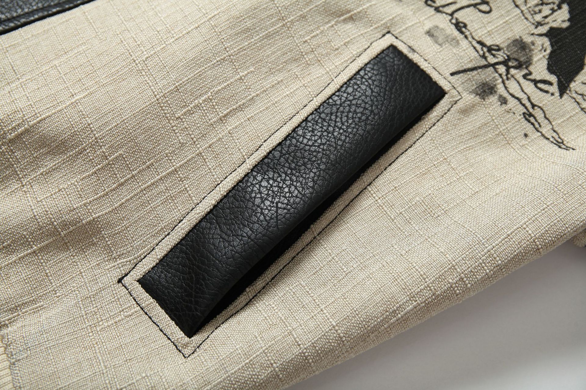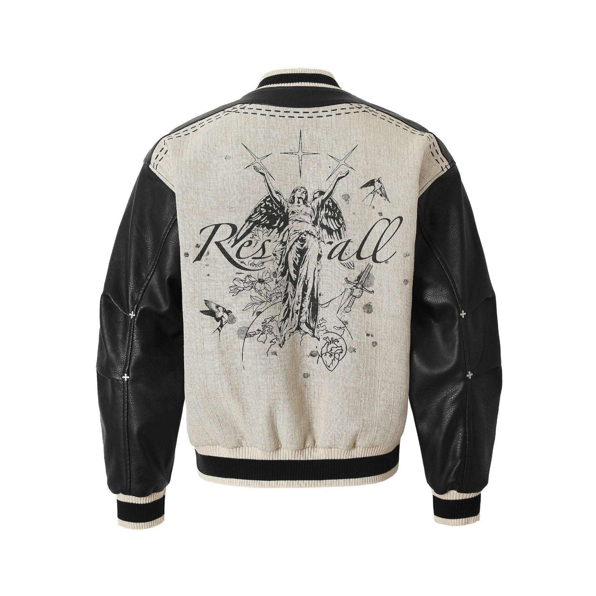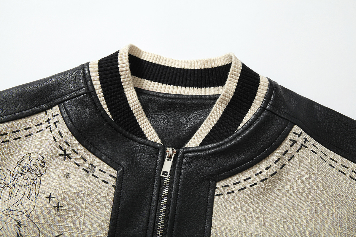 Jiayiku 트렌디 브랜드 봄버 재킷 아메리칸 레트로 다크 프린트 가죽 재킷 남성용 야구 재킷