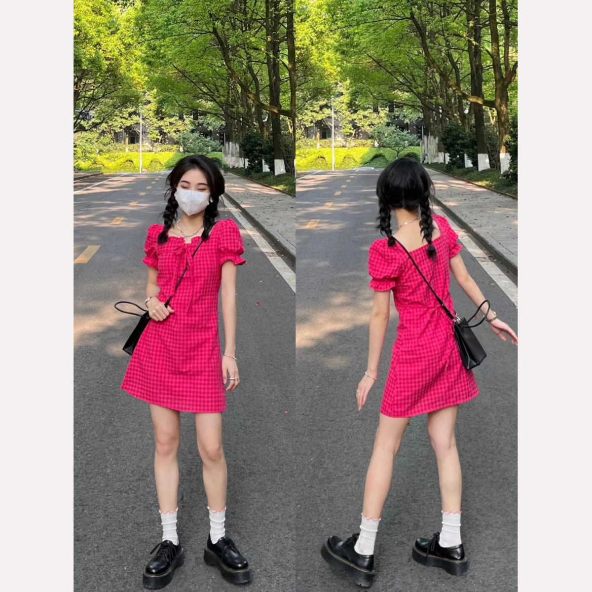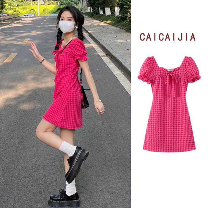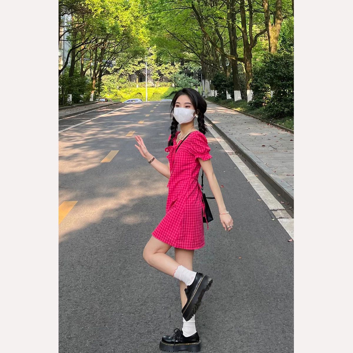 프렌치 스위트 로즈 레드 체크 무늬 작은 플라잉 슬리브 드레스 2025 여름 신작 허리 슬리밍 순수한 욕망 스타일 스커트스토어 가기