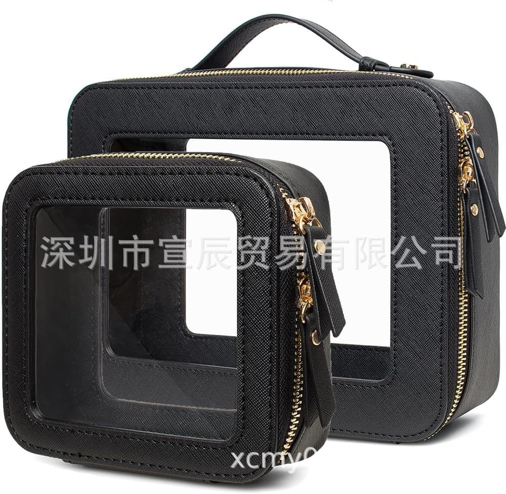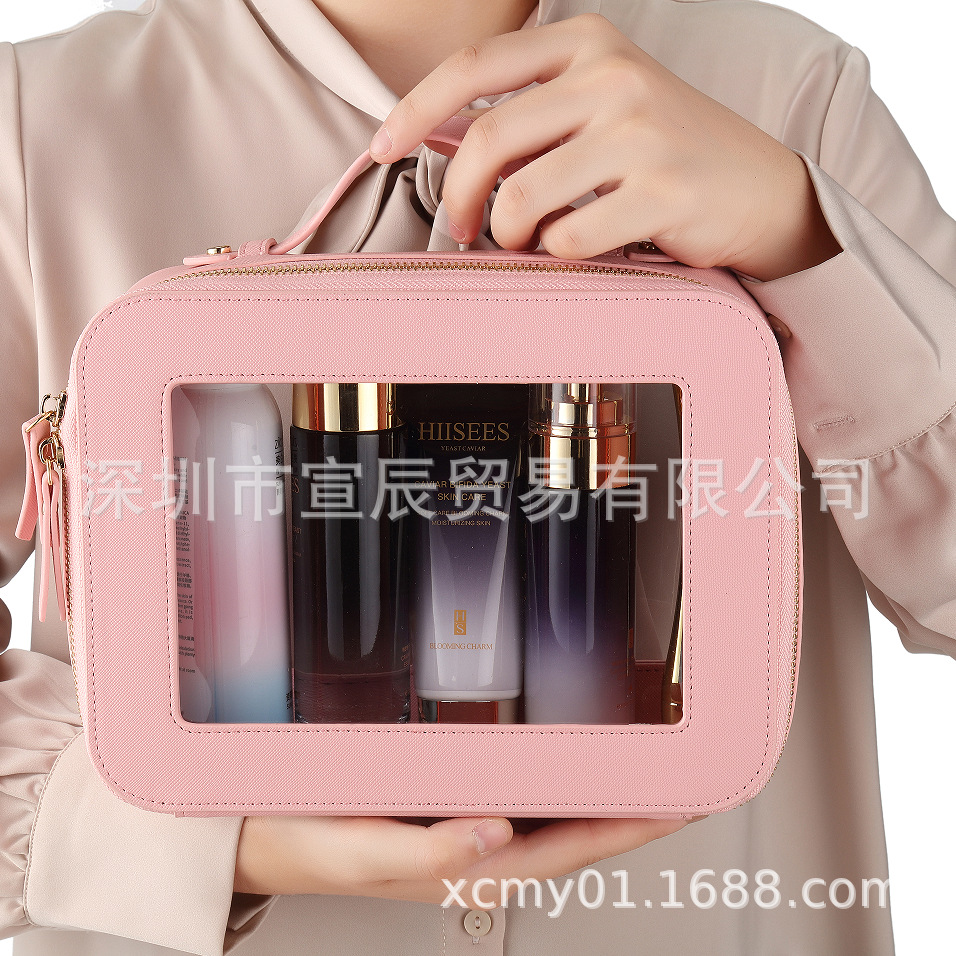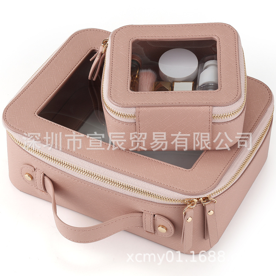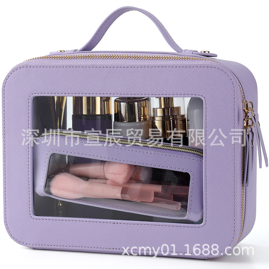 국경 간 재고 투피스 하이 엔드 여성 여행 보관 스킨 케어 더블 투명 휴대용 PU 가죽 화장품 가방스토어 가기