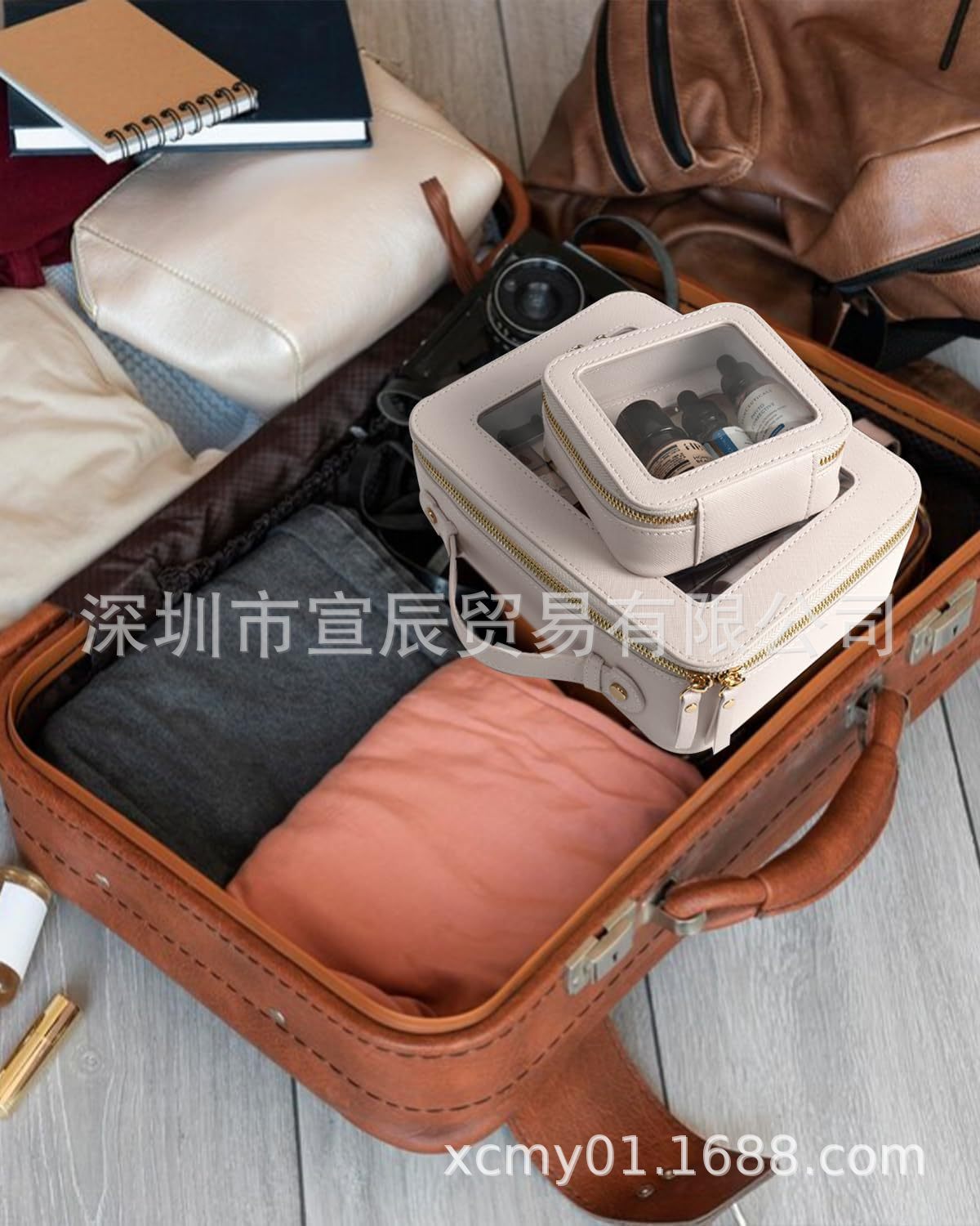 국경 간 재고 투피스 하이 엔드 여성 여행 보관 스킨 케어 더블 투명 휴대용 PU 가죽 화장품 가방