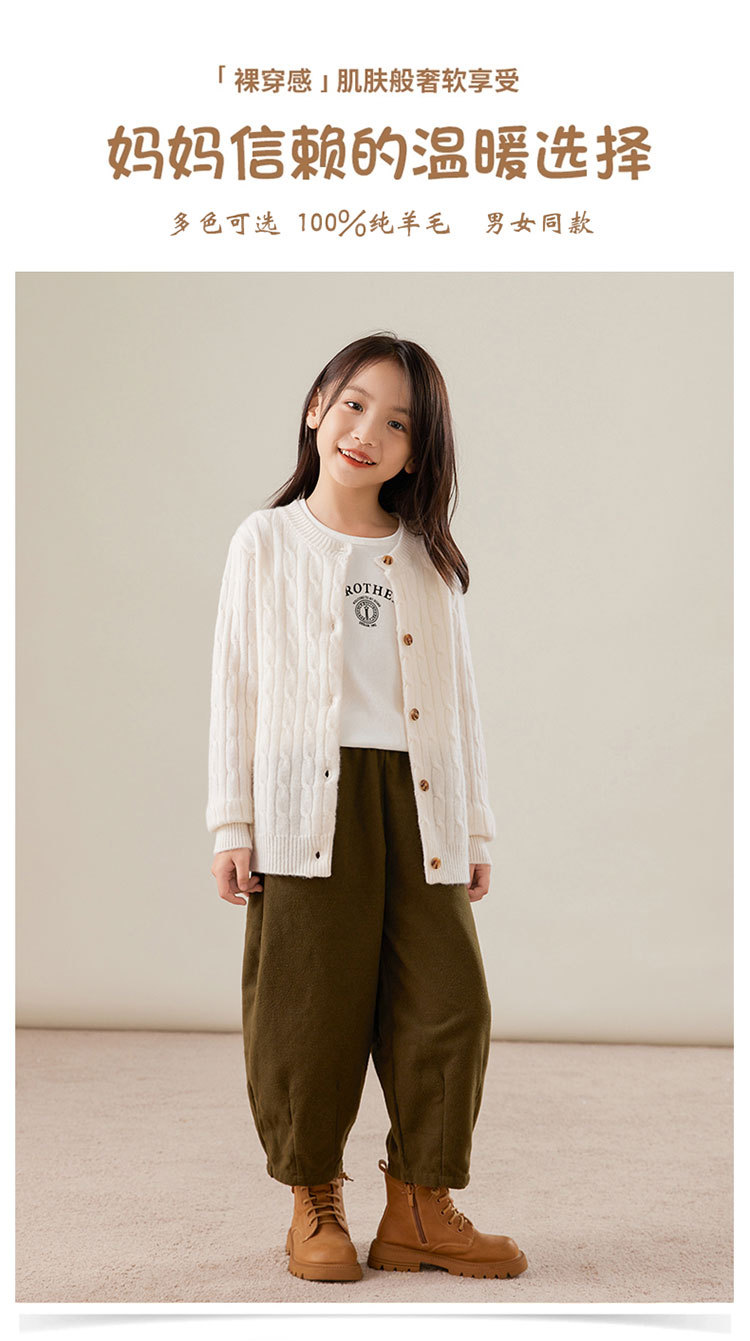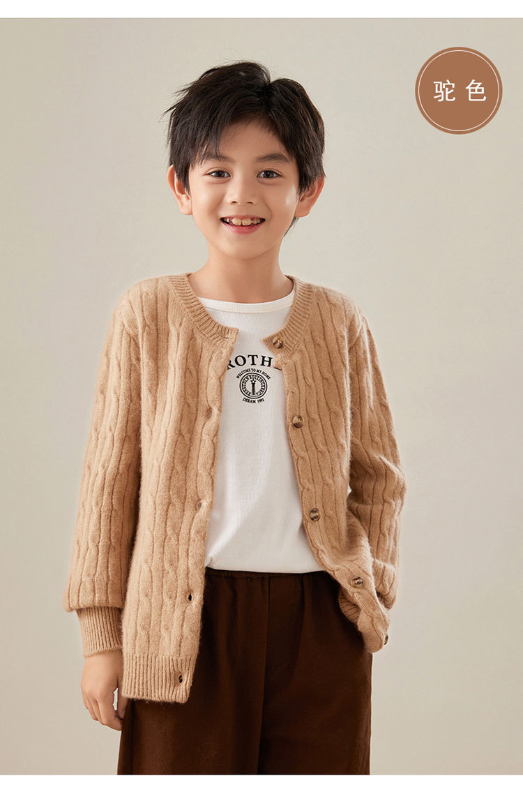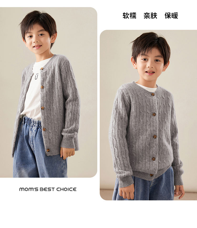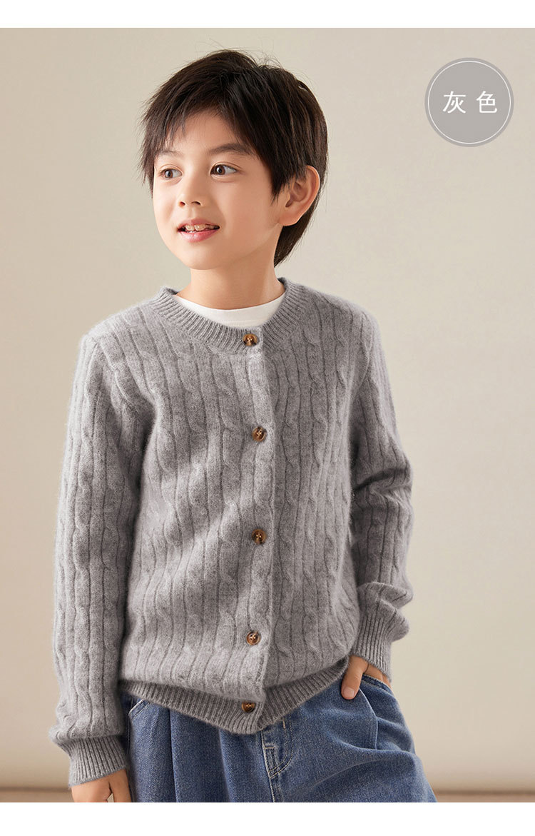 어린이 순수 양모 카디건 2024 가을과 겨울 새로운 둥근 목 소년과 소녀 솔리드 컬러 트위스트 싱글 브레스트 따뜻한 재킷