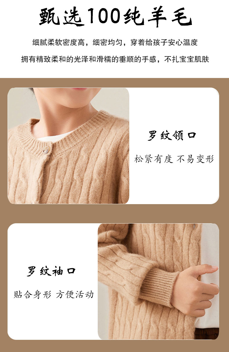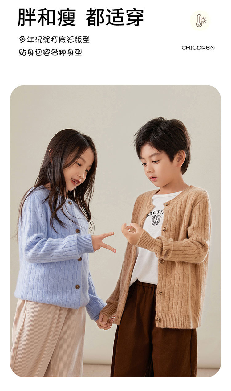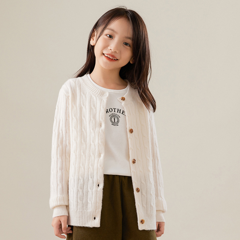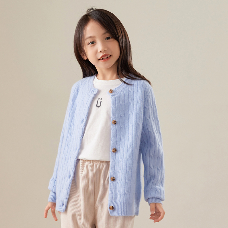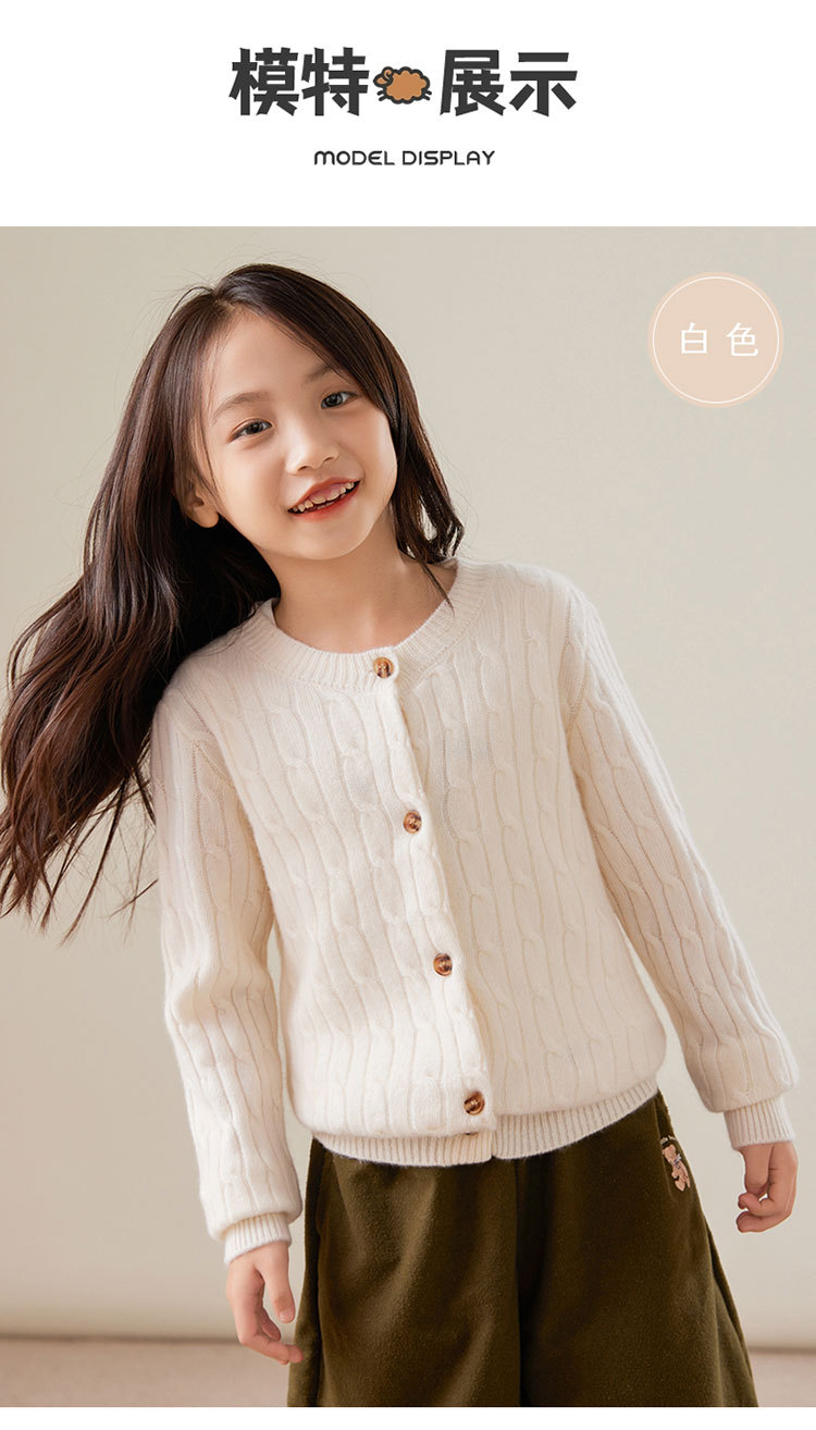 어린이 순수 양모 카디건 2024 가을과 겨울 새로운 둥근 목 소년과 소녀 솔리드 컬러 트위스트 싱글 브레스트 따뜻한 재킷