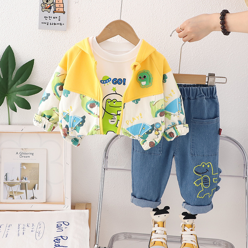 남학생 코트 세트 2024 가을 서양식 아기 옷 어린이 만화 공룡 컬러 매칭 재킷 3 피스 세트스토어 가기