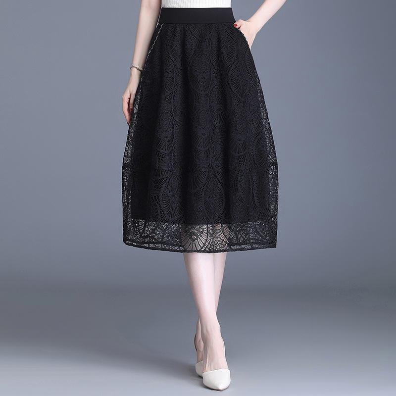2024 여름 새로운 레이스 스커트 중간 길이 A 라인 스커트 슬리밍 하이 엔드 우아한 블랙 패션 스커트
