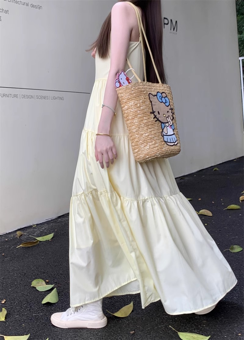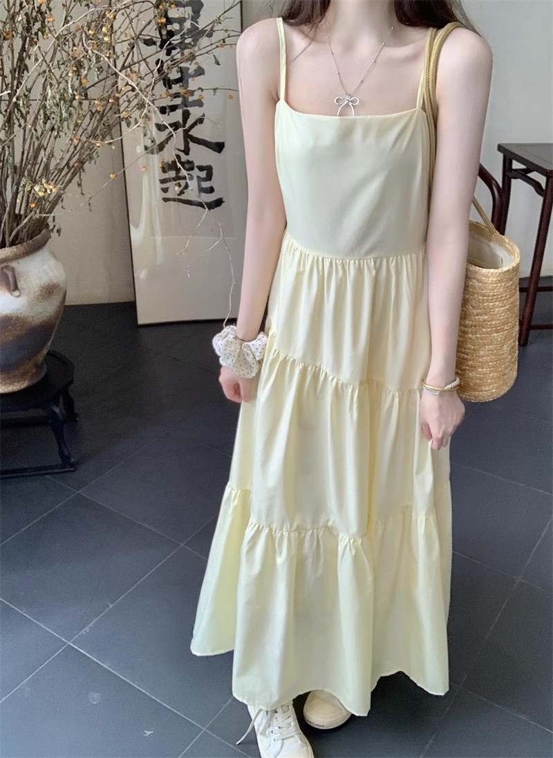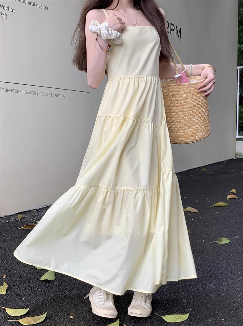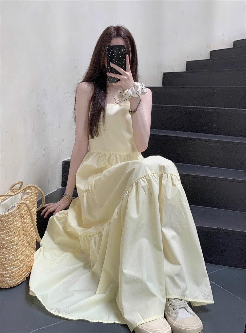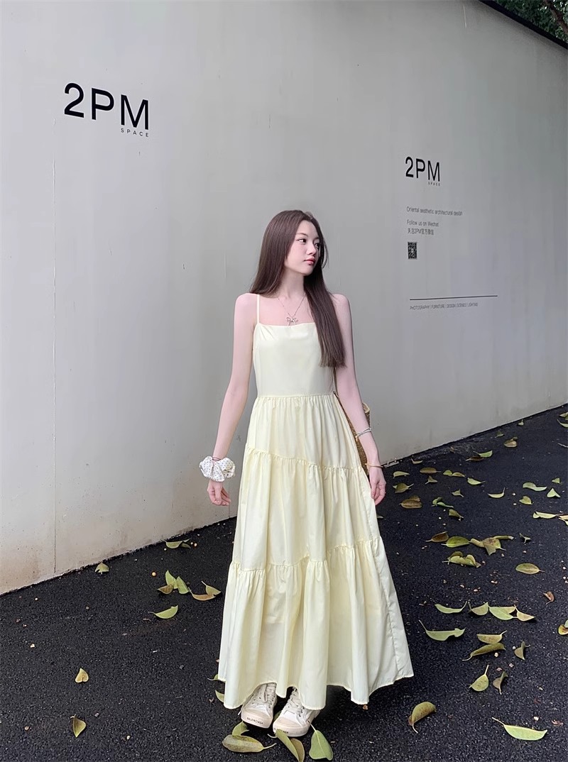 부드러운 스타일 모리 스타일 슈퍼 요정 노란색 슬링 원피스 어린이 여름 새로운 우아한 허리 슬리밍 긴 스커트