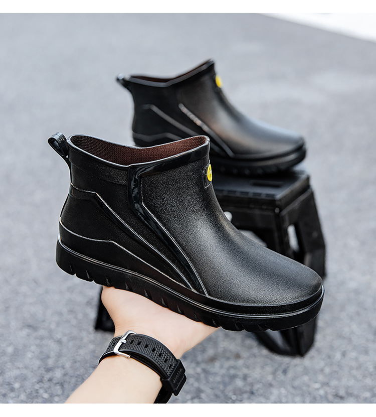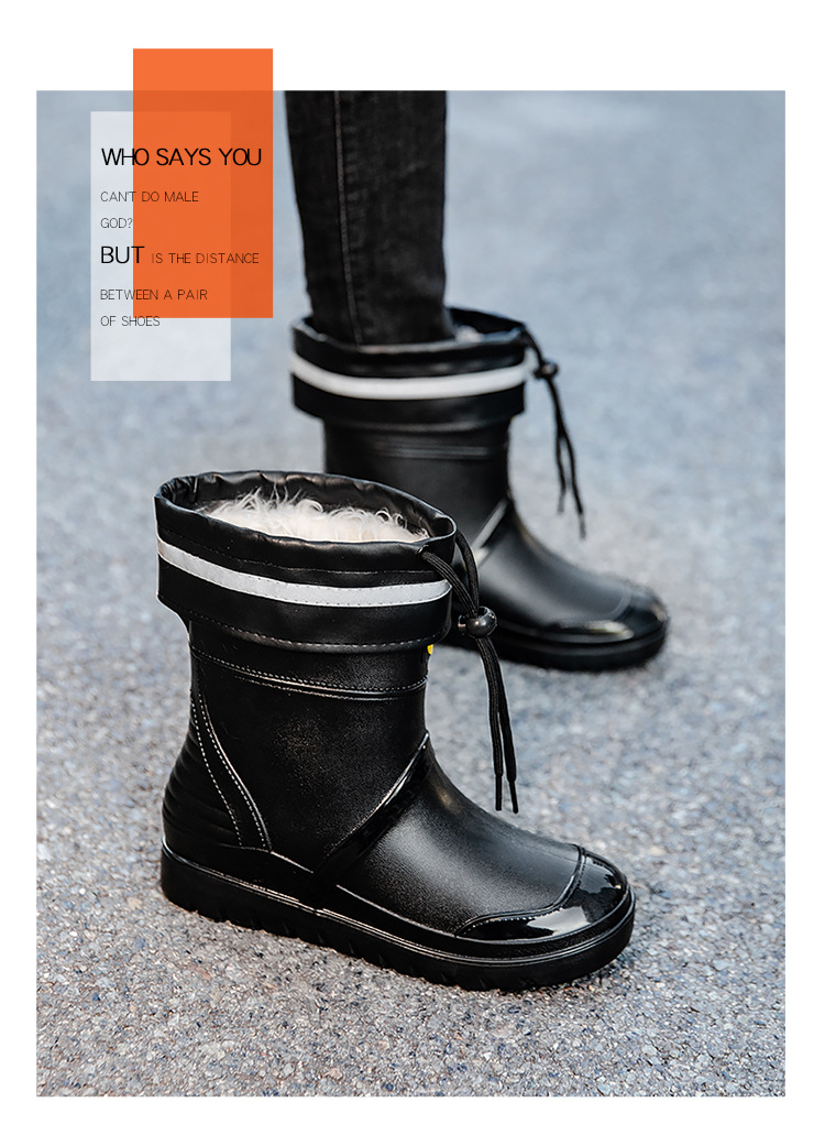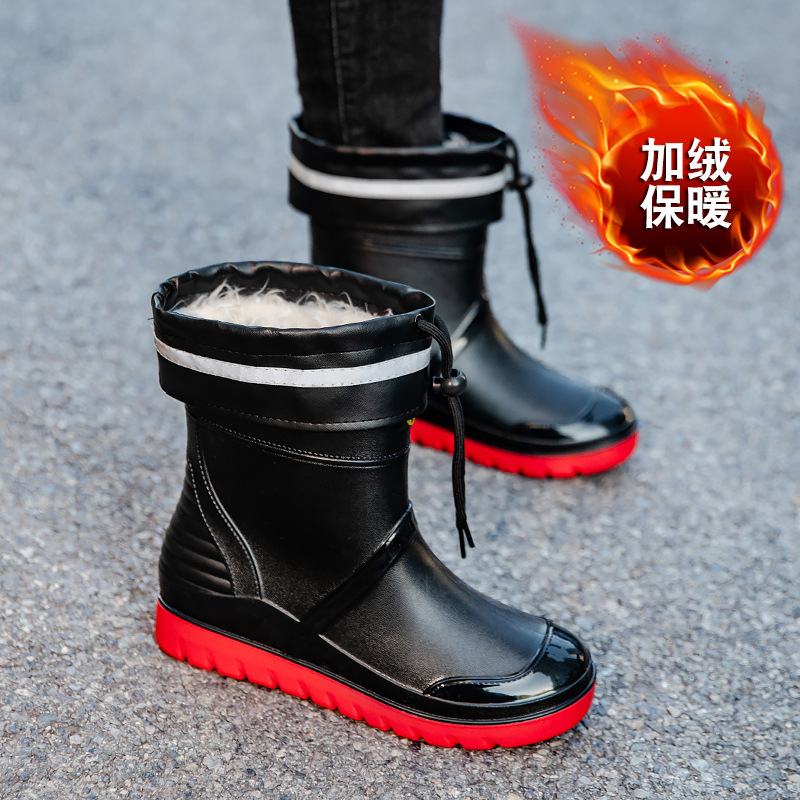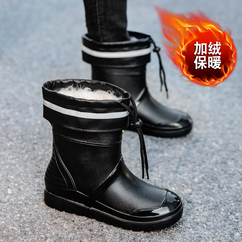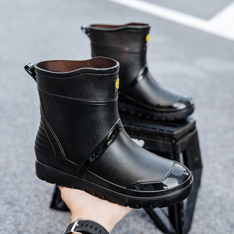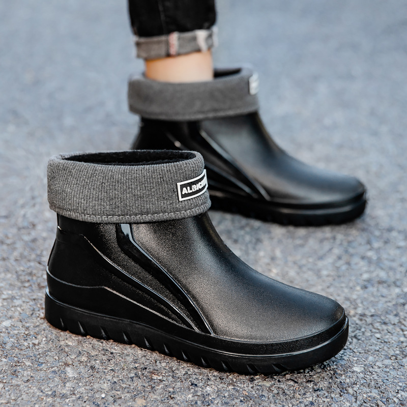 트렌디 한 남성 야외 짧은 튜브 블랙 비 신발 미끄럼 방지 방수 장화 구화 고무 신발 남성용 비 부츠 따뜻한 중형 튜브 고무 신발 남성스토어 가기