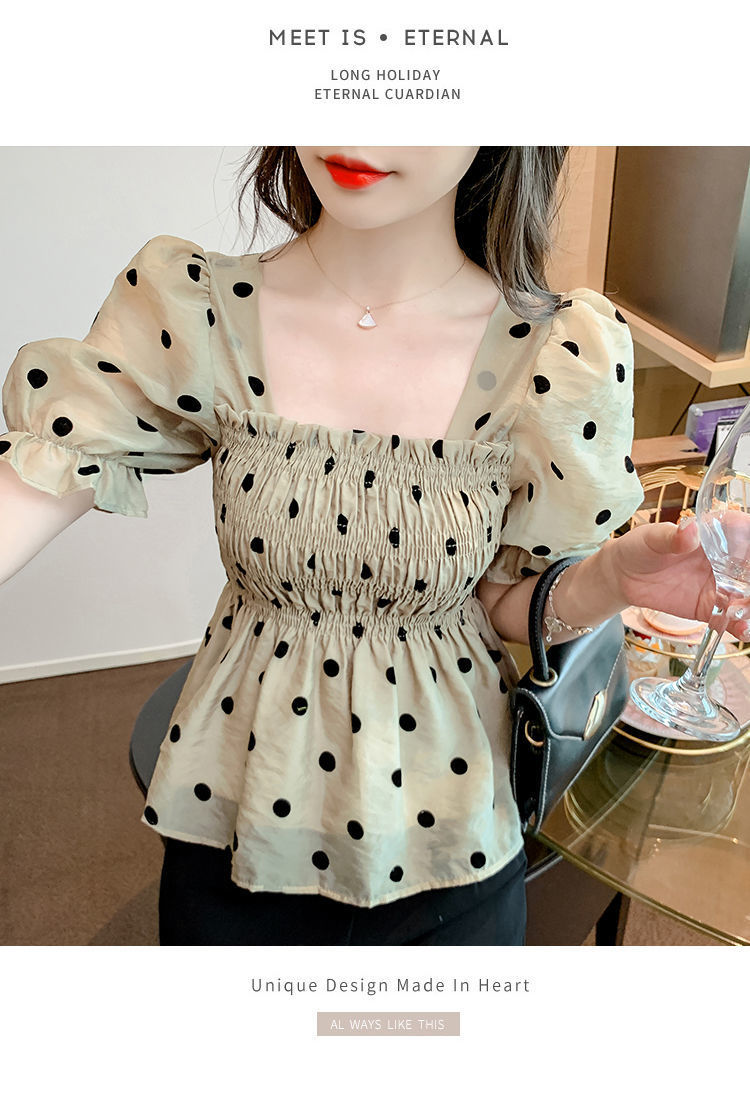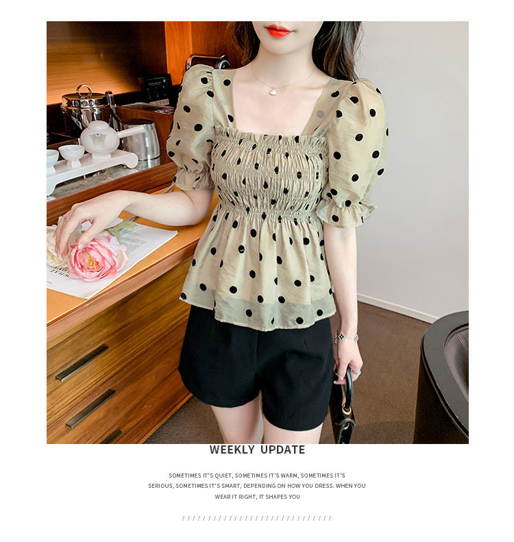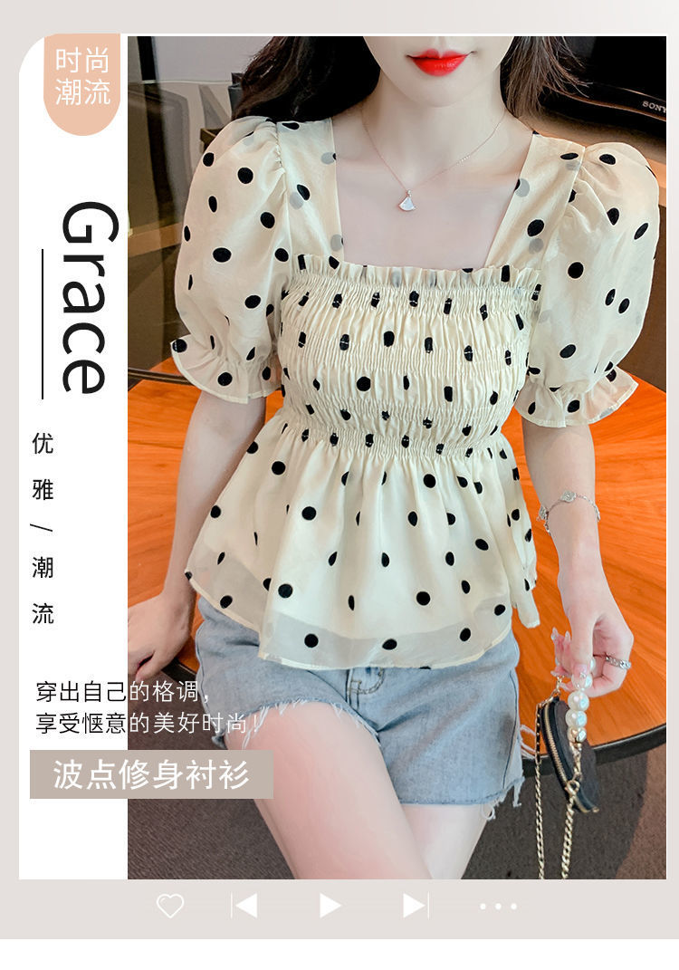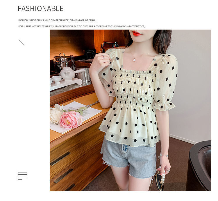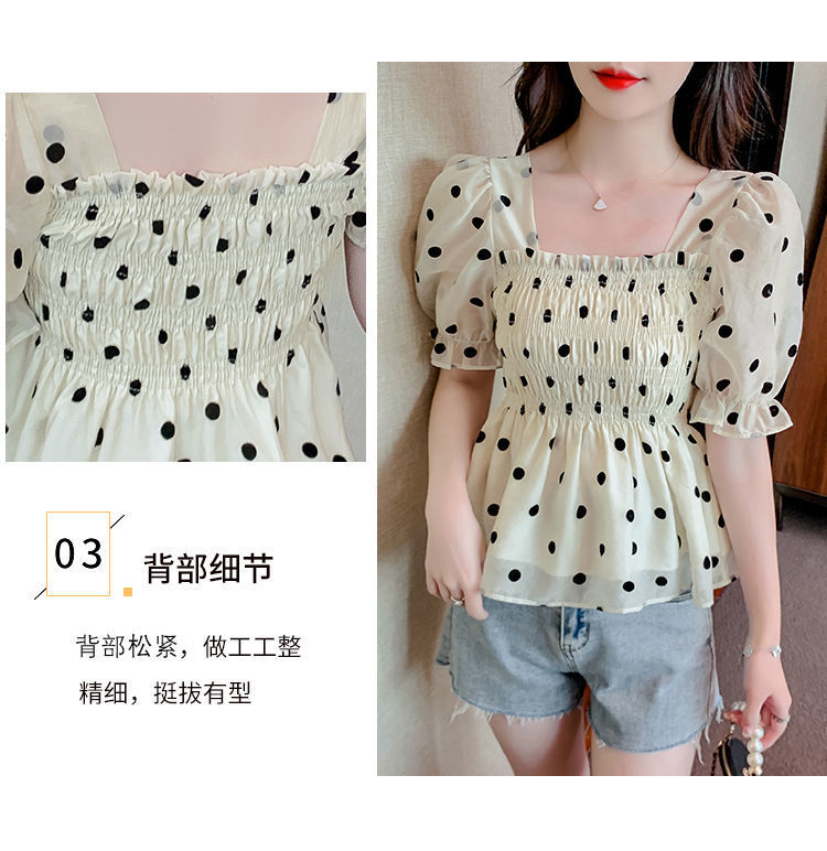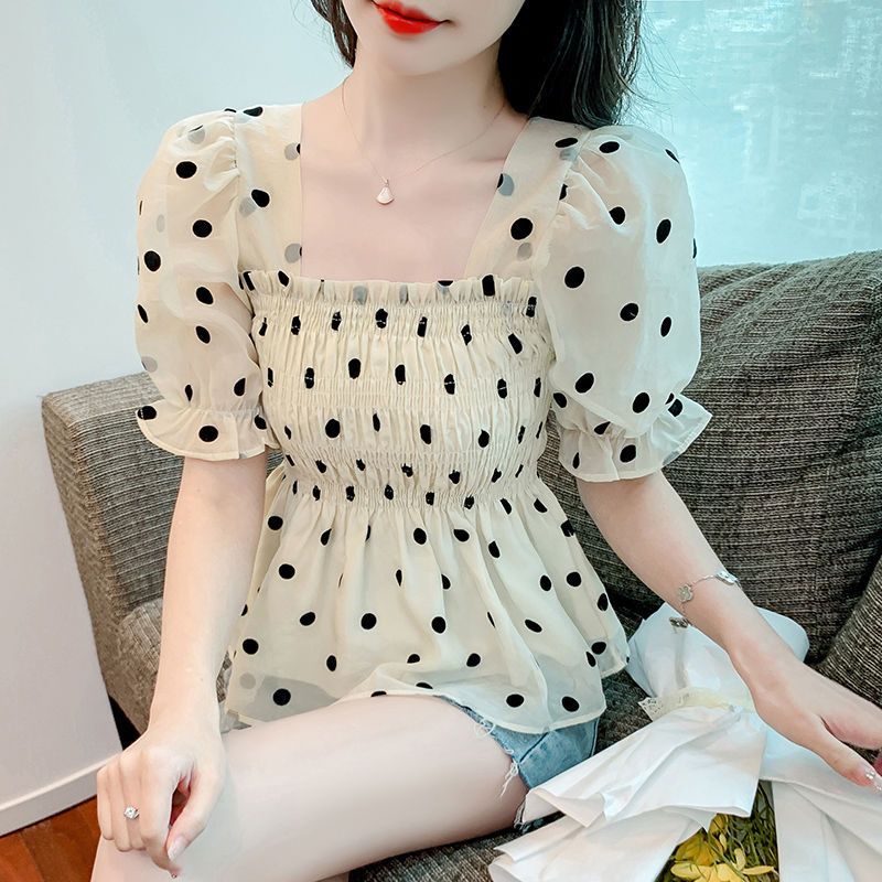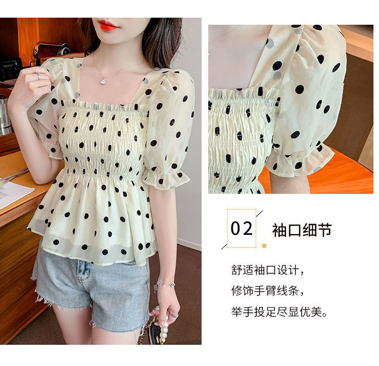 프랑스 스퀘어 칼라 새로운 도착 폴로 도트 반팔 셔츠 여성의 여름 달콤한 슬림 핏 스커트 슬리밍 쉬폰 스타일라인 탑