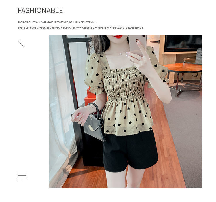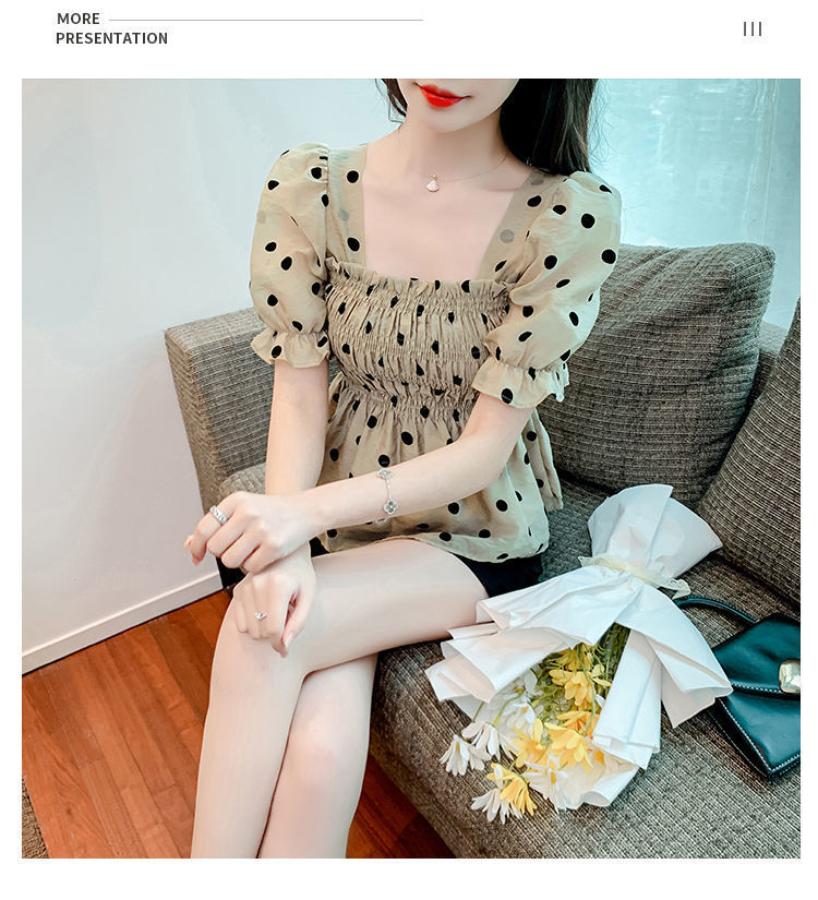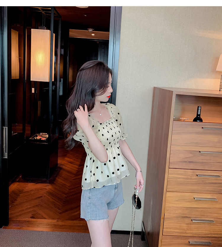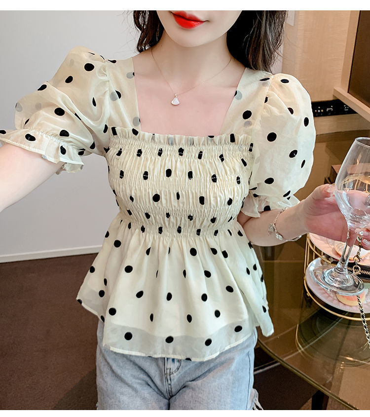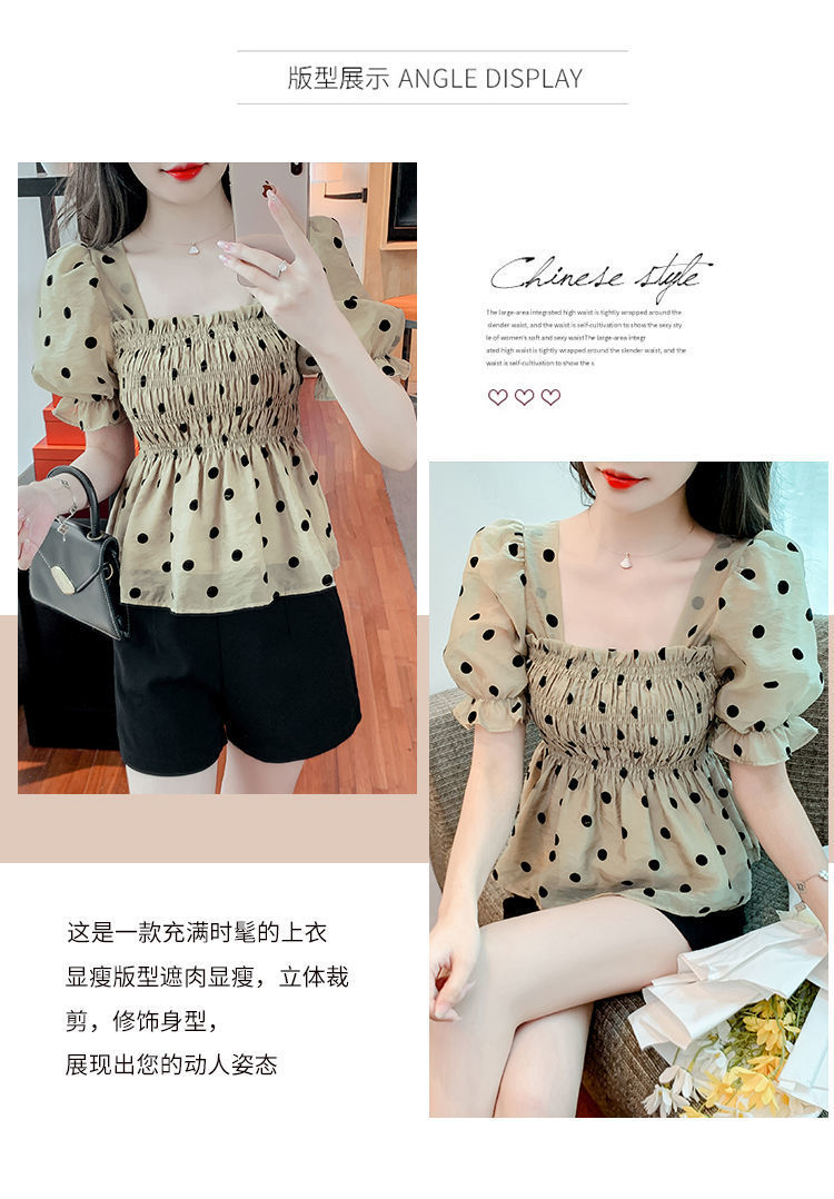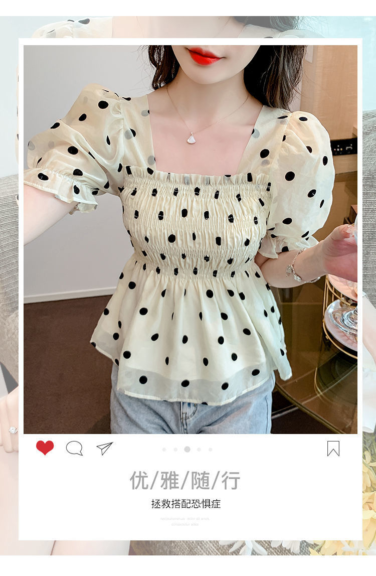 프랑스 스퀘어 칼라 새로운 도착 폴로 도트 반팔 셔츠 여성의 여름 달콤한 슬림 핏 스커트 슬리밍 쉬폰 스타일라인 탑