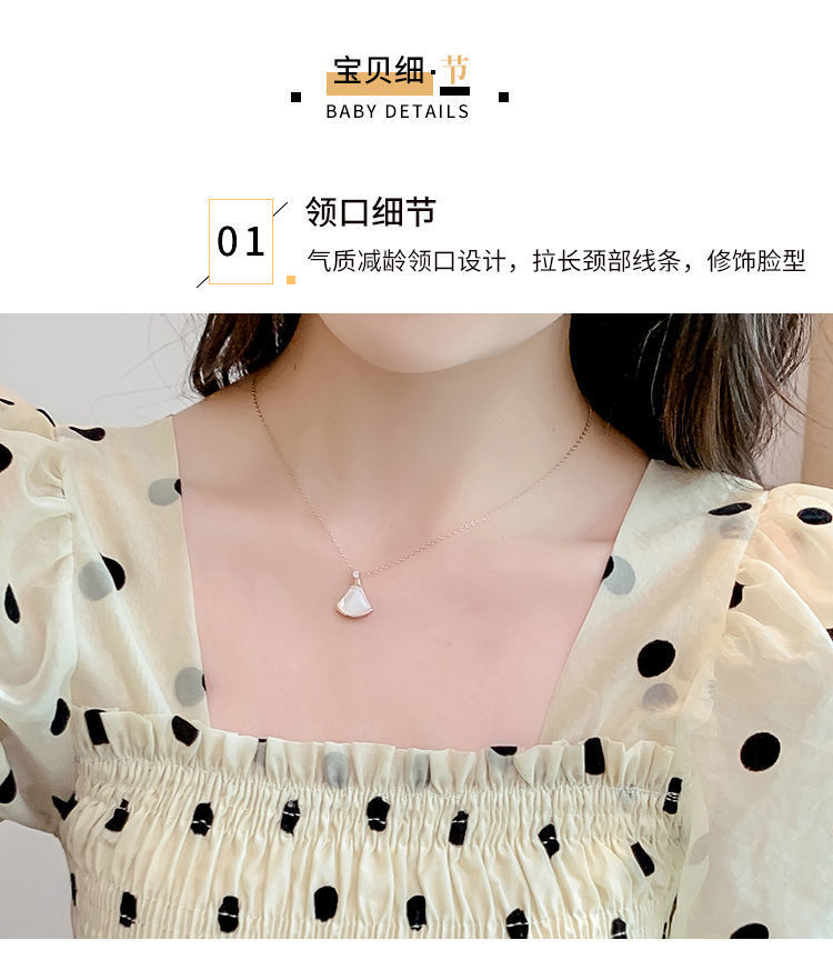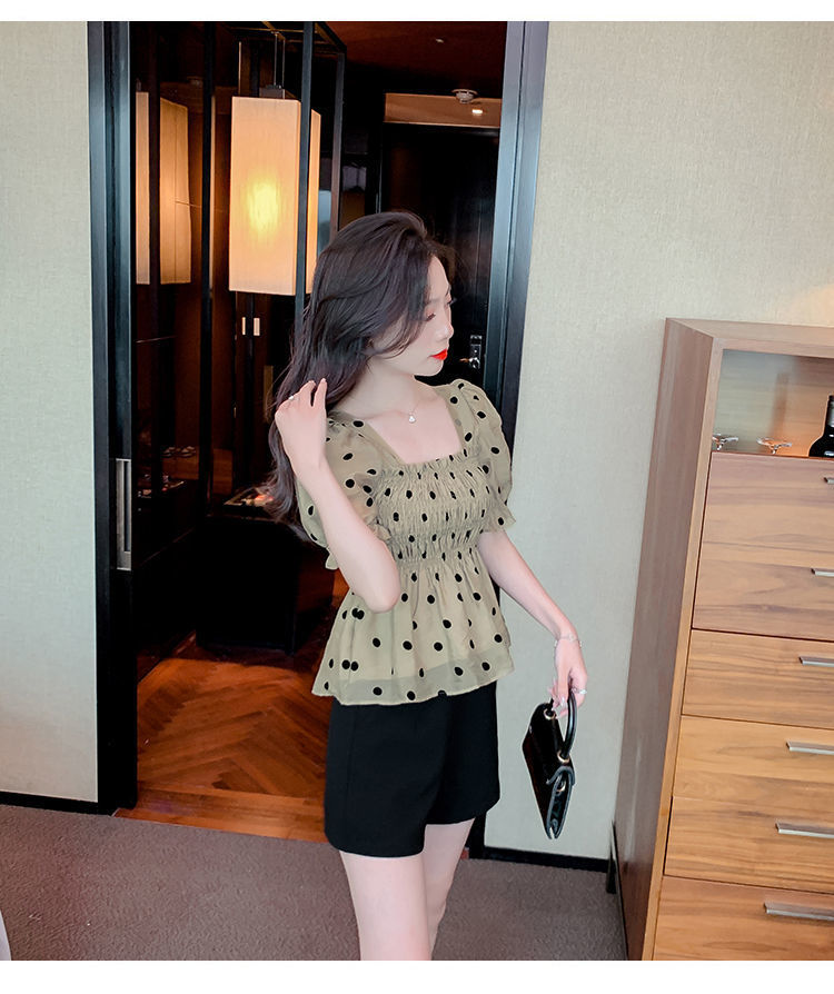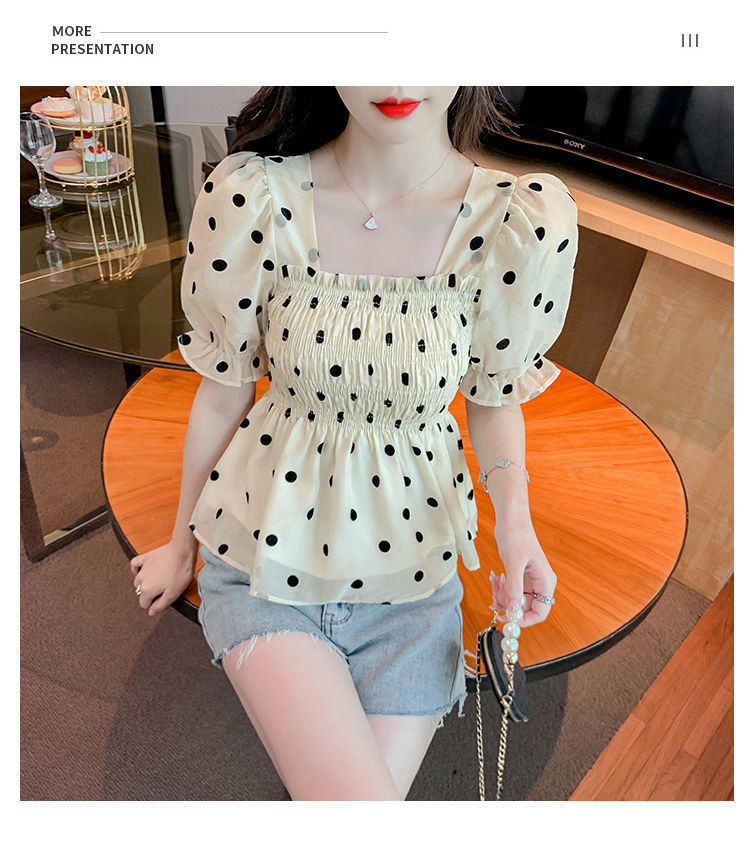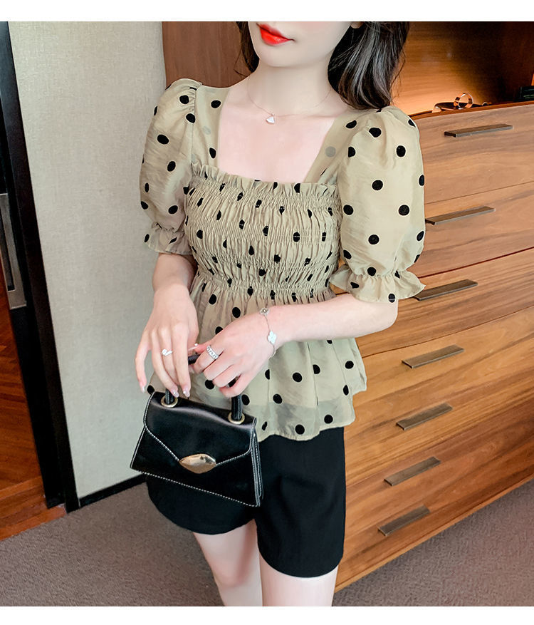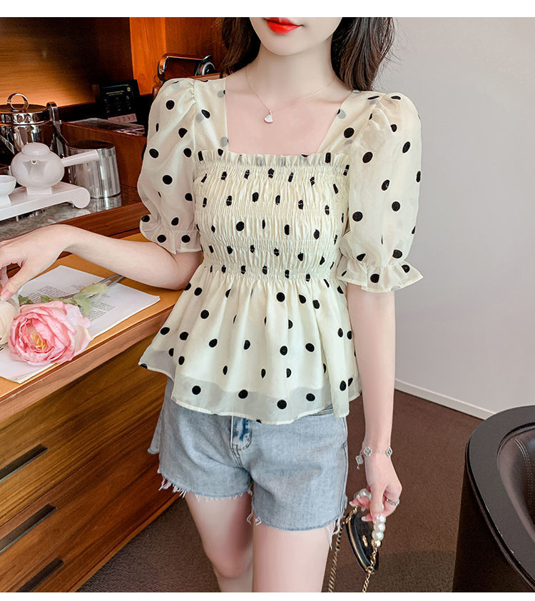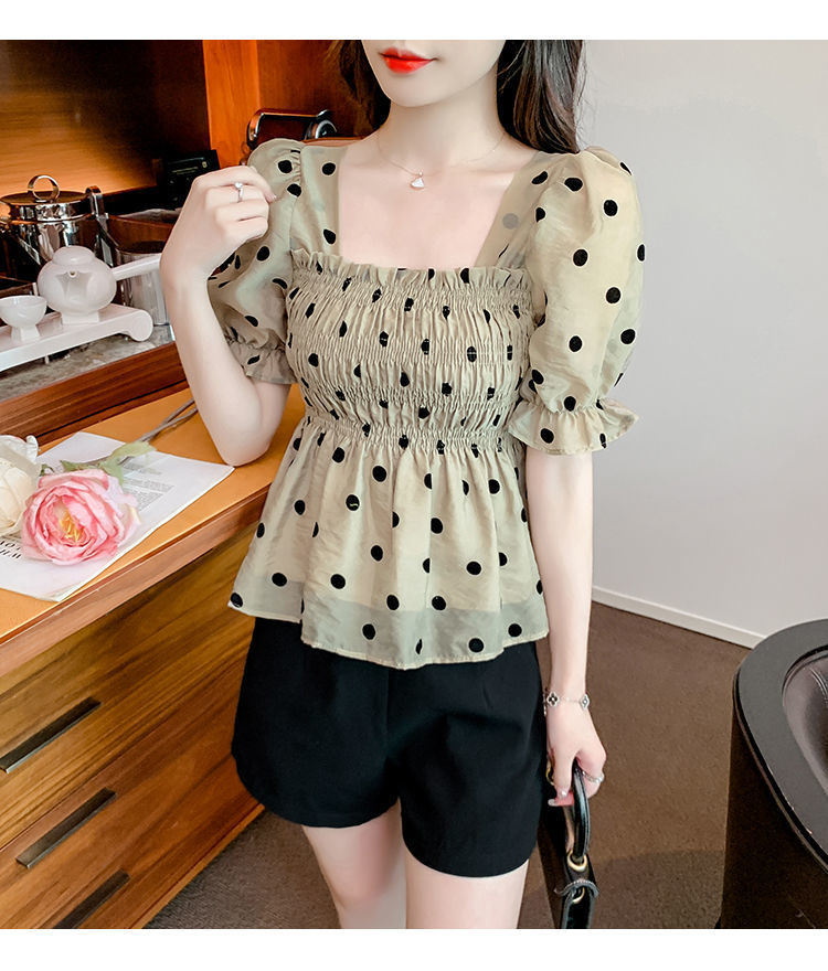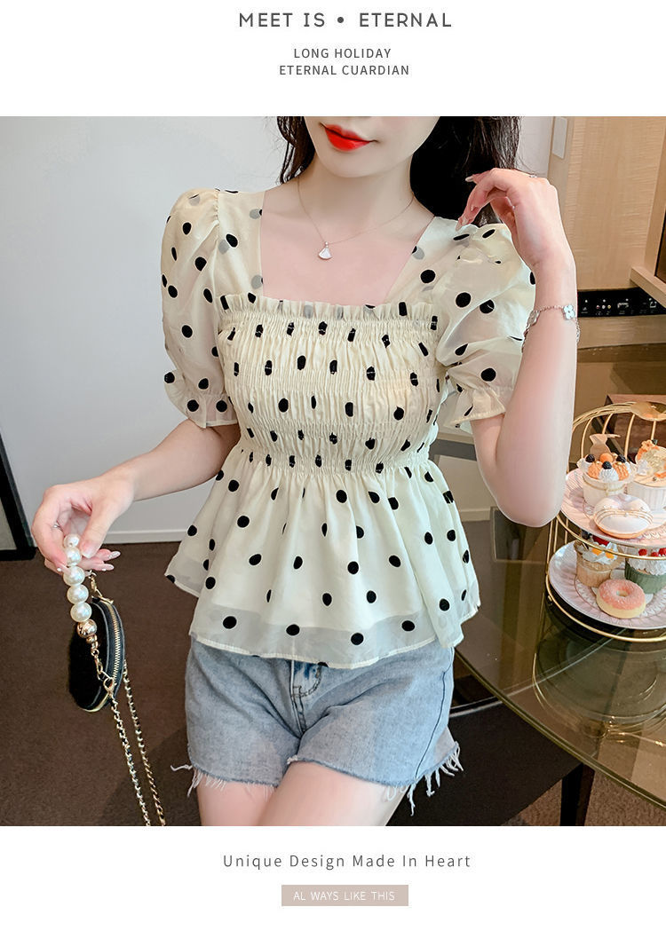 프랑스 스퀘어 칼라 새로운 도착 폴로 도트 반팔 셔츠 여성의 여름 달콤한 슬림 핏 스커트 슬리밍 쉬폰 스타일라인 탑