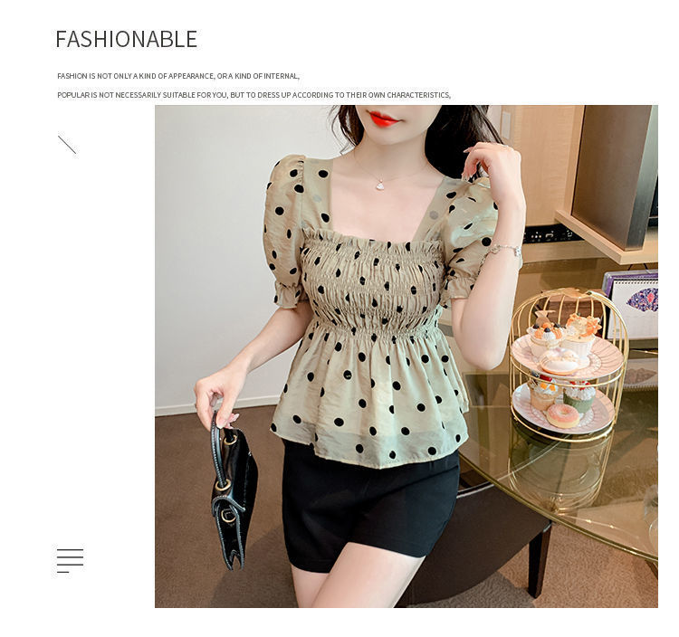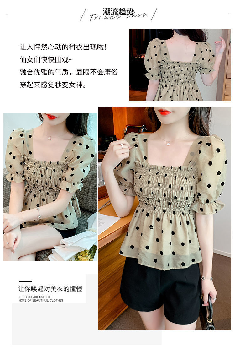 프랑스 스퀘어 칼라 새로운 도착 폴로 도트 반팔 셔츠 여성의 여름 달콤한 슬림 핏 스커트 슬리밍 쉬폰 스타일라인 탑스토어 가기