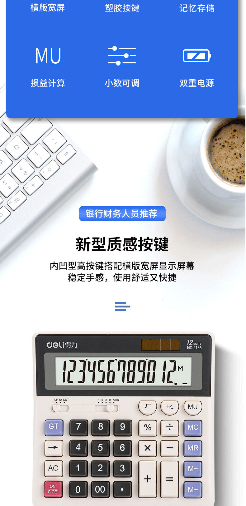 우표 델리 계산기 2136ES 듀얼 파워 대형 스크린 수평 금융 은행 12 비트 컴퓨터 키 컴퓨터스토어 가기